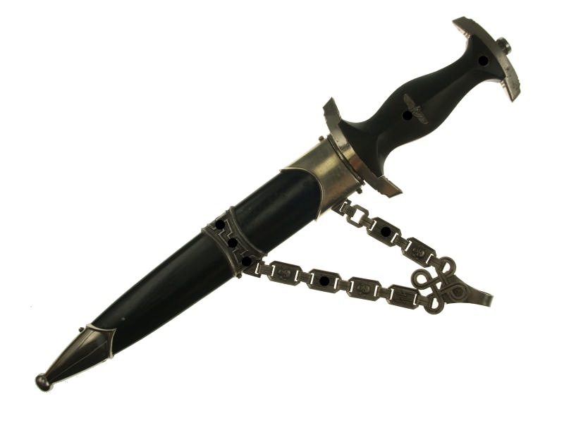 SS Kettendolch M36 ohne Hersteller. Versilberte Nickelausführung. Schwarzer Holzgriff mit eingelegtem, schwarz emailliertem SS-Emblem und Hoheitsadler. Der Adler und die Pastille sind geklammert und sauber in den Griff eingelassen. Die Parierstangen sind ebenfalls ohne Herstellerzeichen. Schwarz lackierte Scheide mit drei versilberten Beschlägen und anhängender Tragekette. Der mittlere Scheidenbeschlag mit umlaufendem Mäanderband. Die Scheide hat keine Beulen. Die Kette ist aus Eisen vernickelt. Modell laut Ralf Siegert: Typ-C und laut Wittmann Typ-I. Karabinerhaken offen mit DRGM. Die obere Kette hat zwei Symbolglieder je eines mit Totenkopf und SS Runen sowie ein Zwischenglied. Verbunden wird sie mit vier Verbindungsgliedern. Revers vom SS Runenglied wurde der SS-Stempel (Kulturzeichen der SS) angebracht. Die untere Kette hat vier Symbolglieder je zwei mit Totenkopf und SS Runen sie wird mit fünf Verbindungsgliedern verbunden. Die Klinge ist noch ungereinigt mit sehr sauberer und klarer Devise (Meine Ehre heißt Treue). Alles in einem ein schöner SS Dolch.
