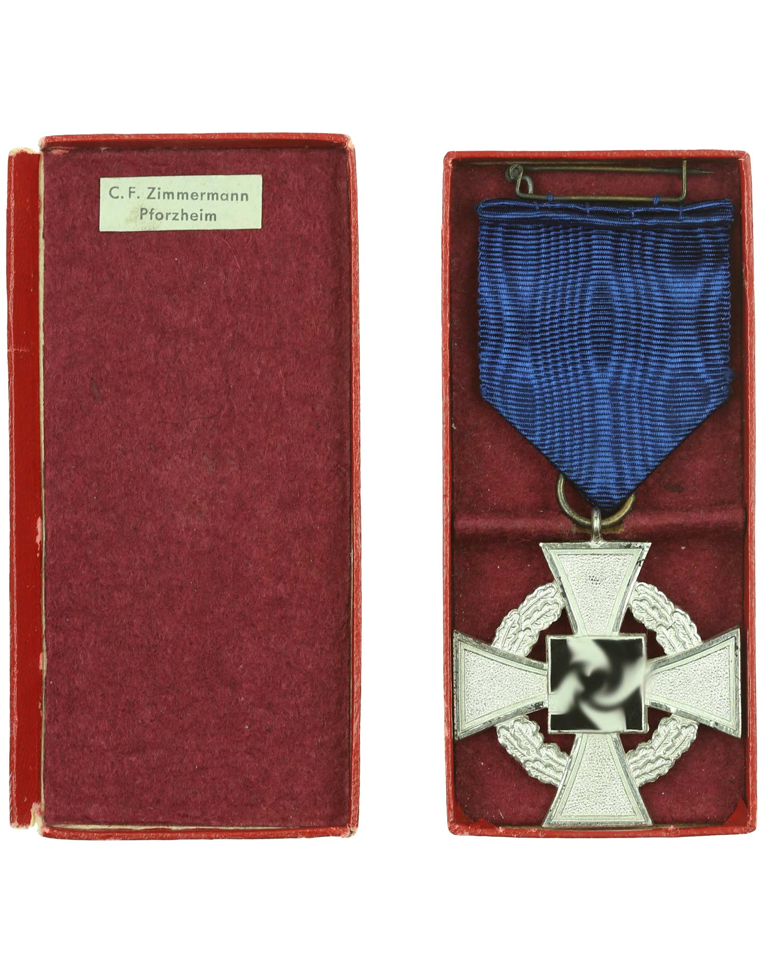 Treuedienst Ehrenzeichen 2. Stufe für 25 Jahre. Verleihungszeitraum 1938 - 1945. Buntmetall versilbert. Rückseite mit Inschrift: "Für Treue Dienste". Etui mit Hersteller C. F. Zimmermann Pforzheim. Gesamtgewicht 23 g. Abmessungen: 41,30 x 41,21 mm.