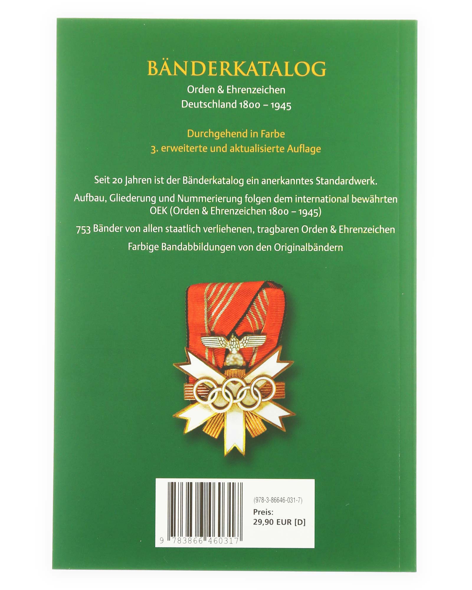Seit 20 Jahren ist der Bänderkatalog ein anerkanntes Standardwerk und folgt in Aufbau, Gliederung und Nummerierung dem international bewährten OEK (Deutschland-Katalog Orden & Ehrenzeichen 1800 – 1945). Er umfasst 753 Bänder und deckt damit die staatlich verliehenen, tragbaren Orden und Ehrenzeichen komplett ab. Ausgegangen wurde von mehreren privaten Bändersammlungen sowie von Beständen des Internationalen Phaleristischen Archivs (ipa), der heutigen Zentralstelle für wissenschaftliche Ordenskunde in München. Alle Bandabbildungen sind direkt und ohne Zwischenstufen von den Originalbändern gemacht, was sich in der Farbechtheit niederschlägt. Der Bänderkatalog ist ein unverzichtbares Hilfsmittel für den Sammler und das bei einfachster Handhabung. Alle Ordensbänder sind im Maßstab 1:1 (in der Breite) abgebildet. Die jetzige Ausgabe ist komplett neu überarbeitet.