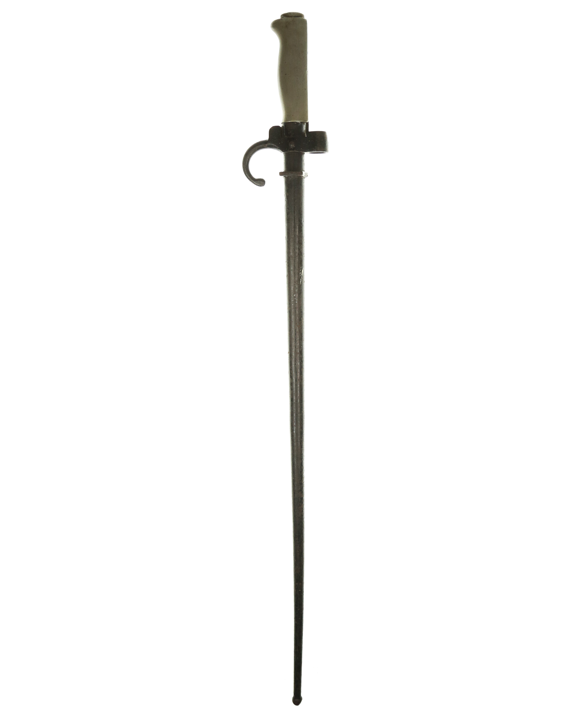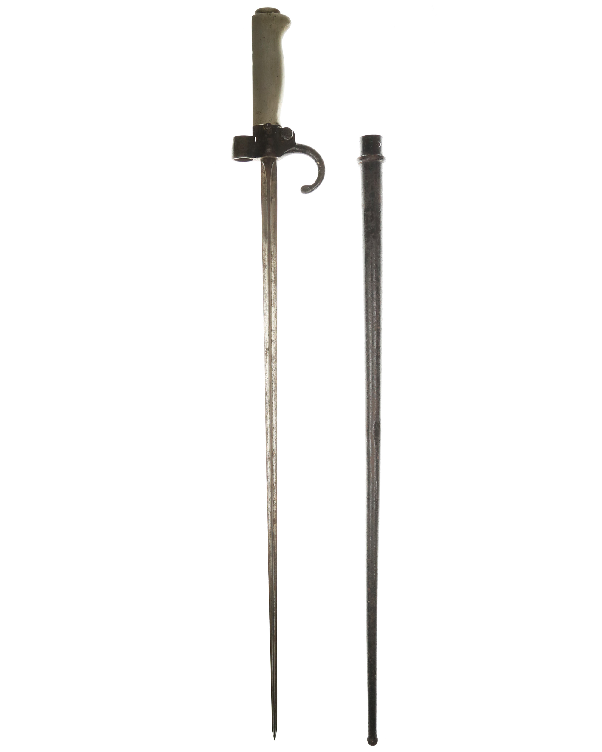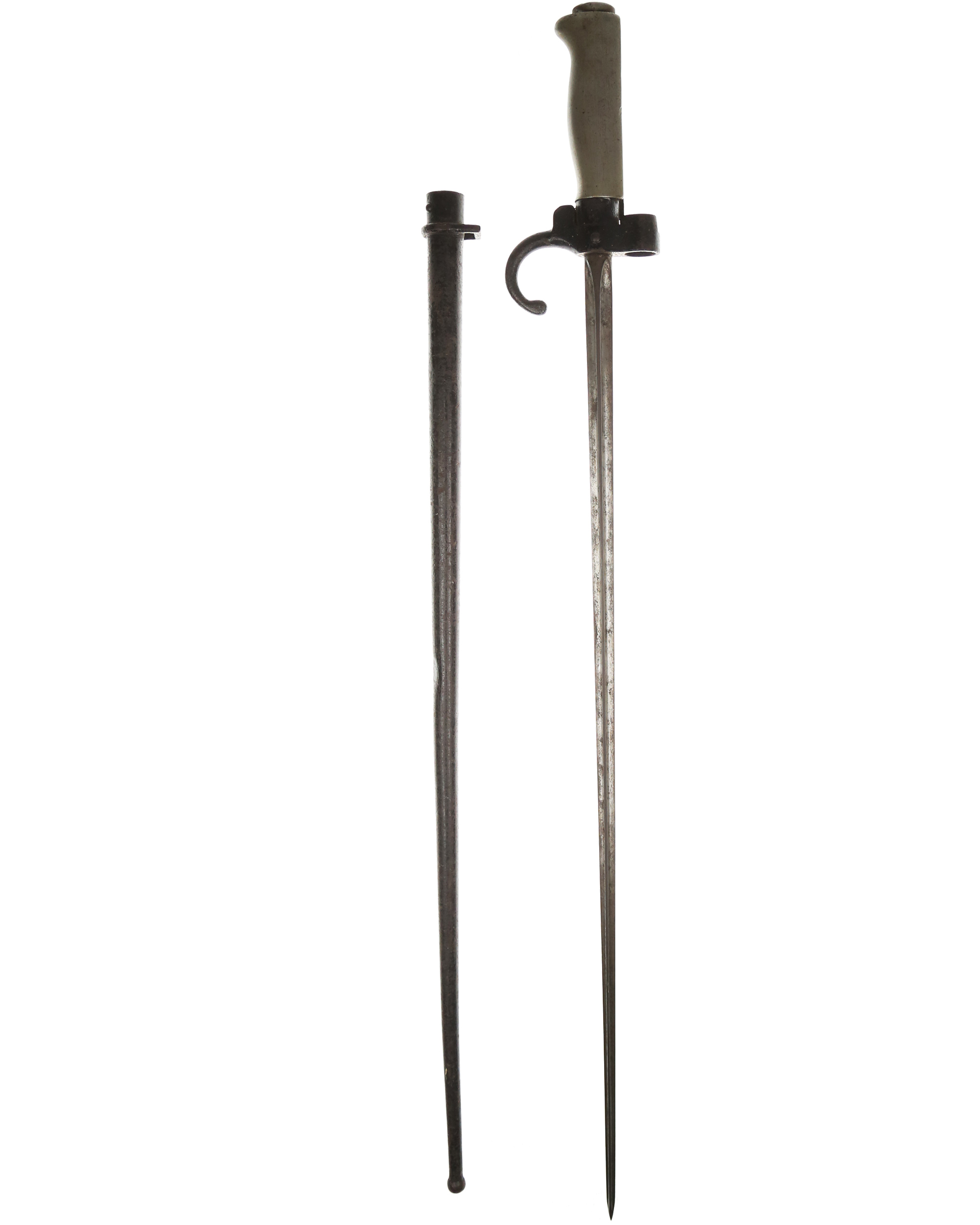 Frankreich Lebel-Bajonett M1886, Seitengewehr zum Infantriegewehr. System Lebel. Weißmetallgriff mit stählerner Aufpflanzeinrichtung, im Querschnitt kreuzförmige spitz zulaufende Klinge, stählerne Rundscheide mit fester Trageöse. Länge ohne Scheide: 63,8 cm, mit Scheide: 65,2 cm, Klingenlänge: 52 cm. Seriennummer auf der Parierstange.
