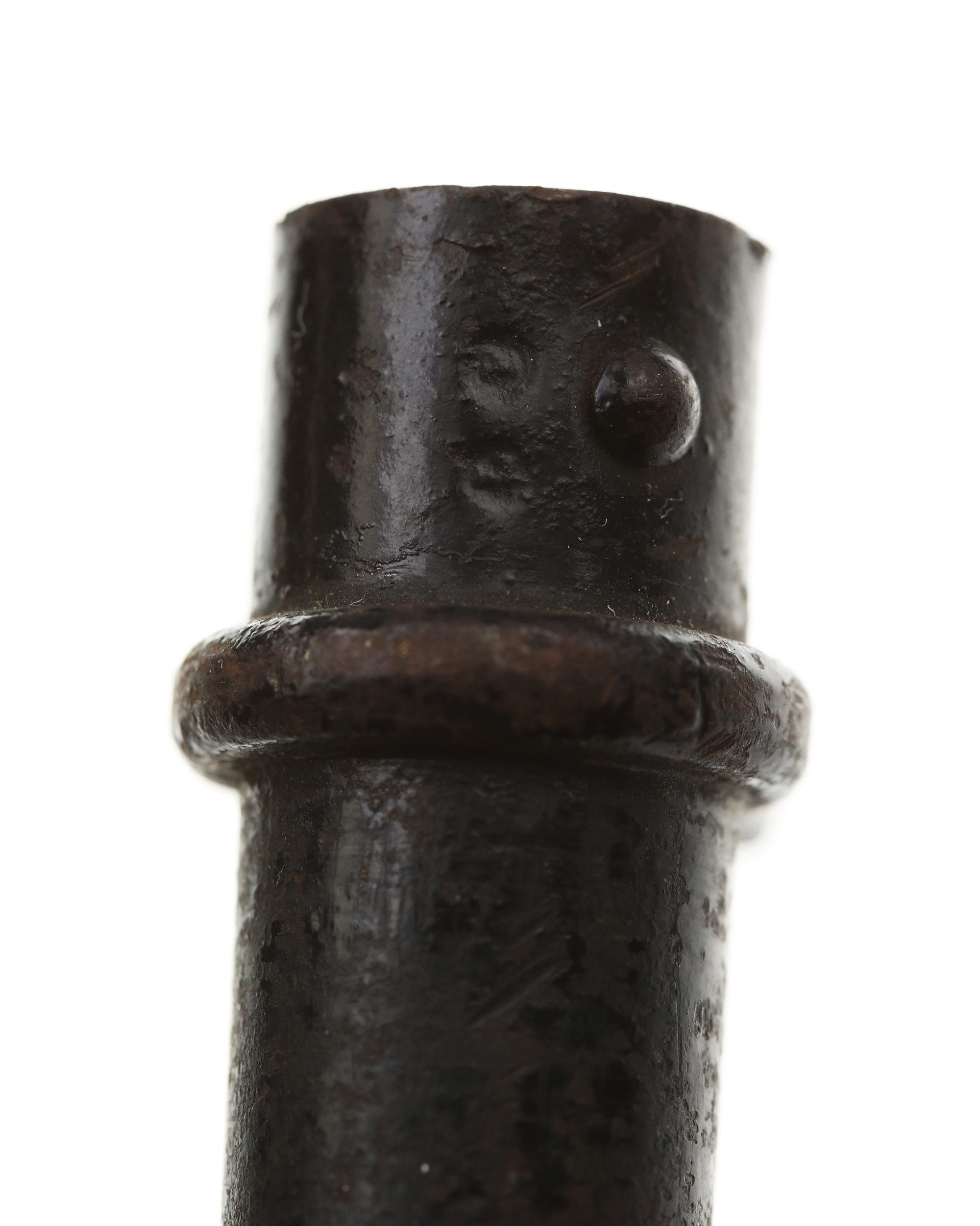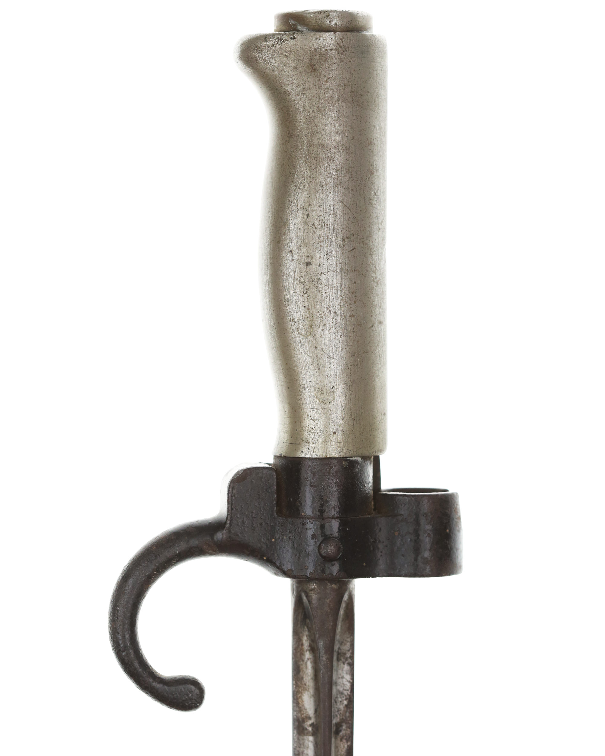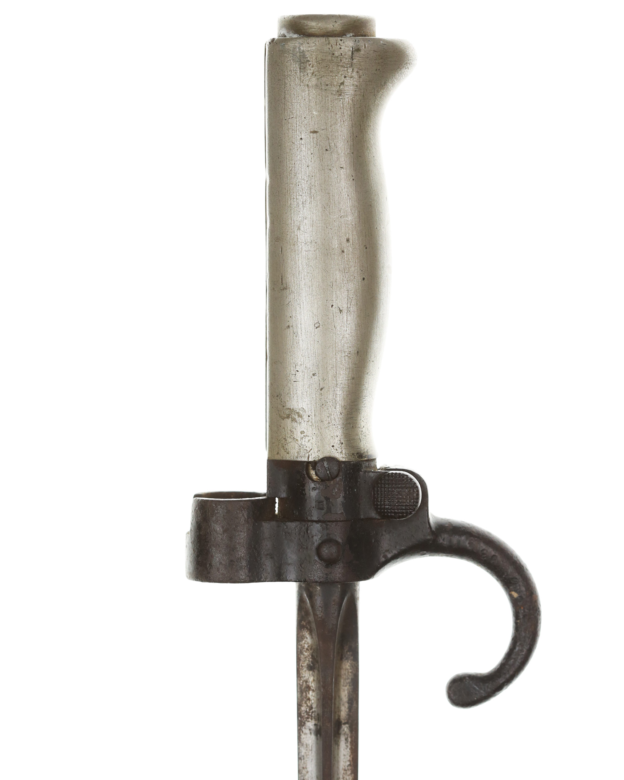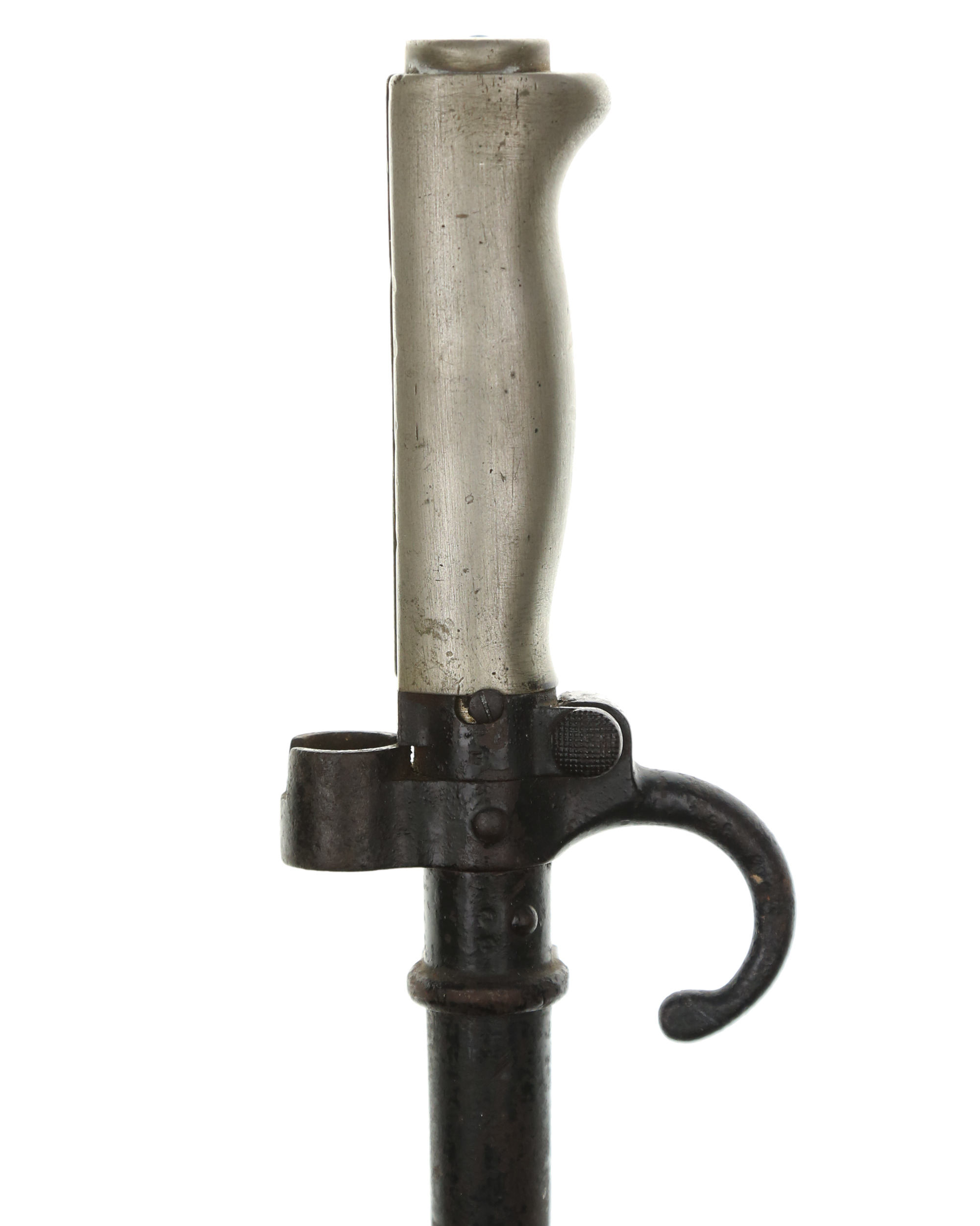 Frankreich Lebel-Bajonett M1886, Seitengewehr zum Infantriegewehr. System Lebel. Weißmetallgriff mit stählerner Aufpflanzeinrichtung, im Querschnitt kreuzförmige spitz zulaufende Klinge, stählerne Rundscheide mit fester Trageöse. Länge ohne Scheide: 63,8 cm, mit Scheide: 65,2 cm, Klingenlänge: 52 cm. Seriennummer auf der Parierstange.
