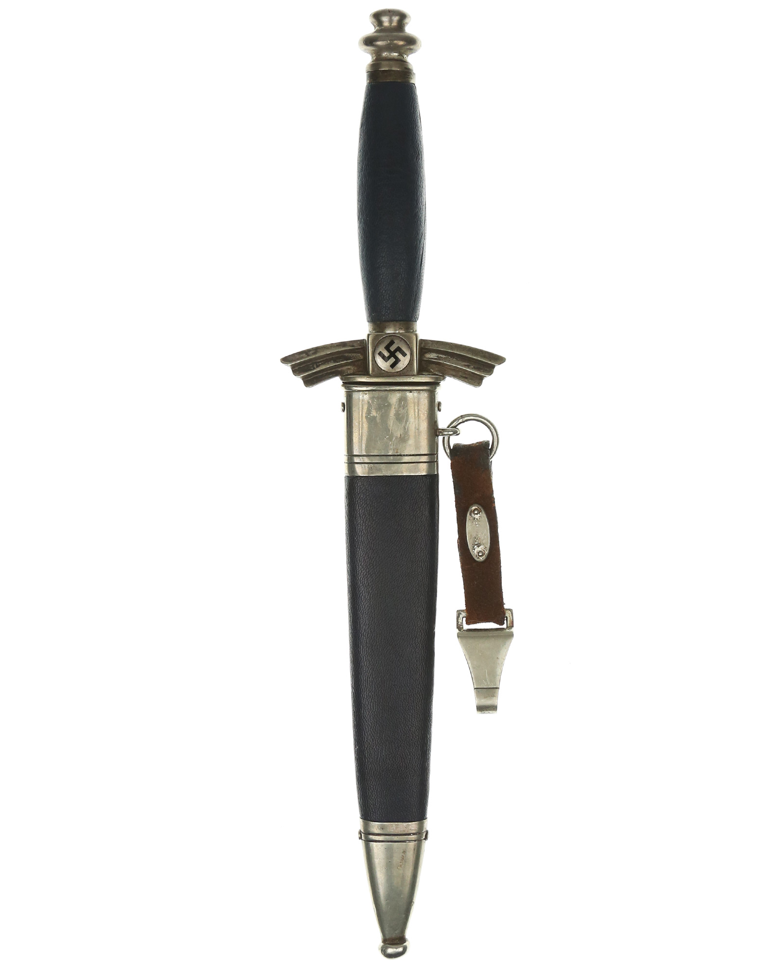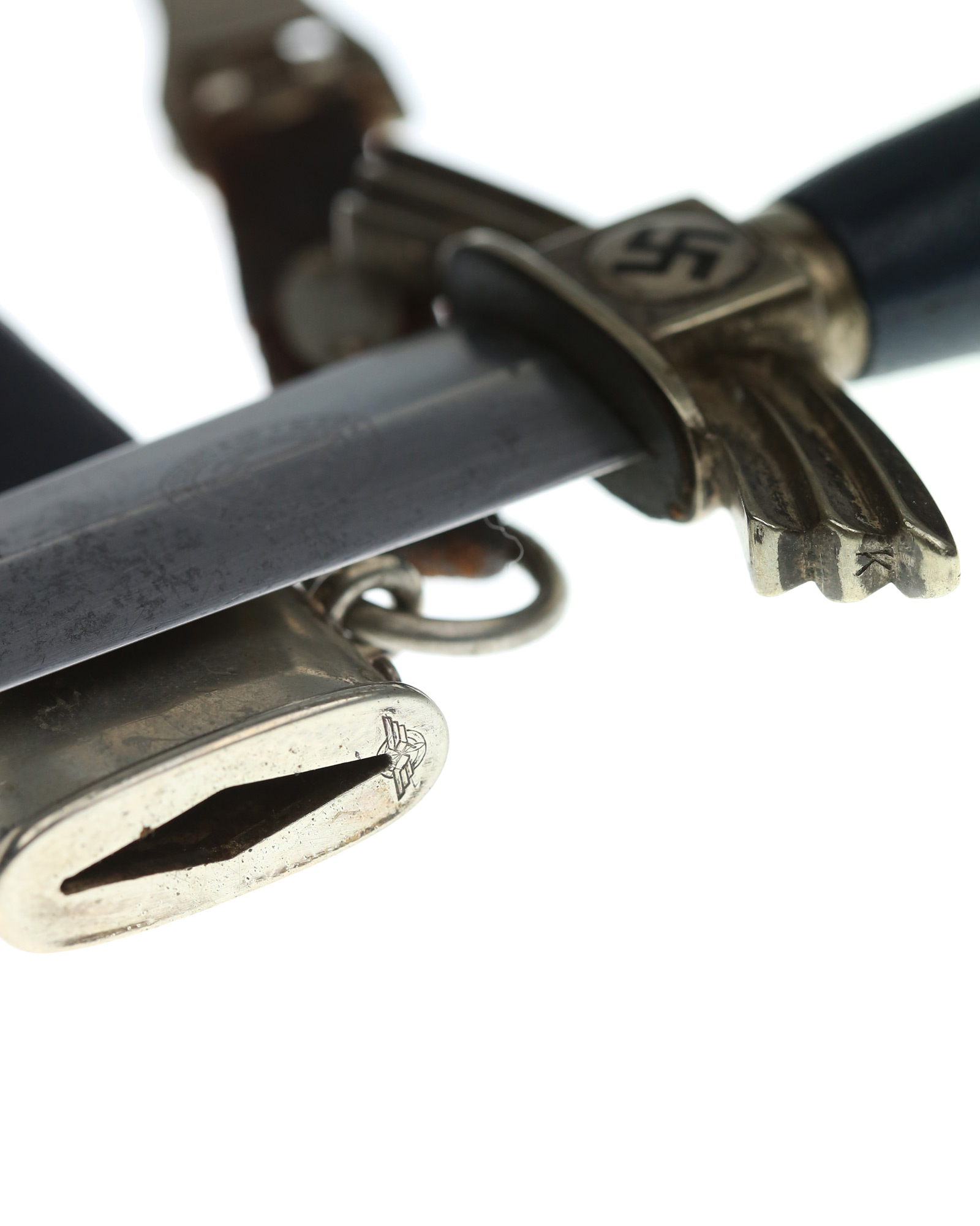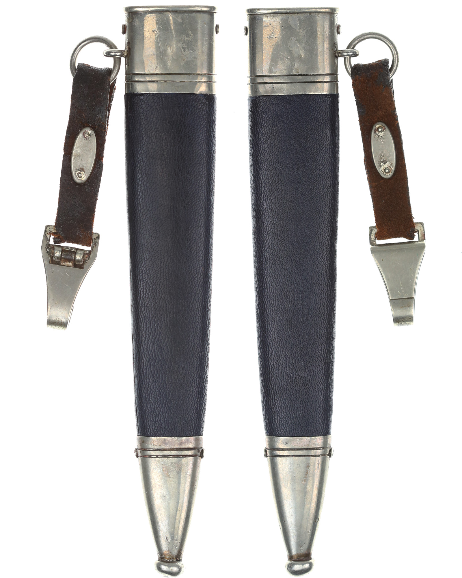 Scheide: Die Scheide ist aus Eisen und ebenfalls mit dunkelblauem Leder überzogen. Die Scheidenbeschläge sind aus Neusilber und mit jeweils zwei rundumlaufenden Zierrillen versehen. Der obere Scheidenbeschlag besteht aus zwei Teilen. Mittels zweier Schrauben ist der obere und untere Scheidenbeschlag mit der Scheide mit Flachkopfschrauben verschraubt. Das Mundstück ist mit einem DLV Stempel versehen. Am Tragering der Scheide ist der Lederhänger befestigt.