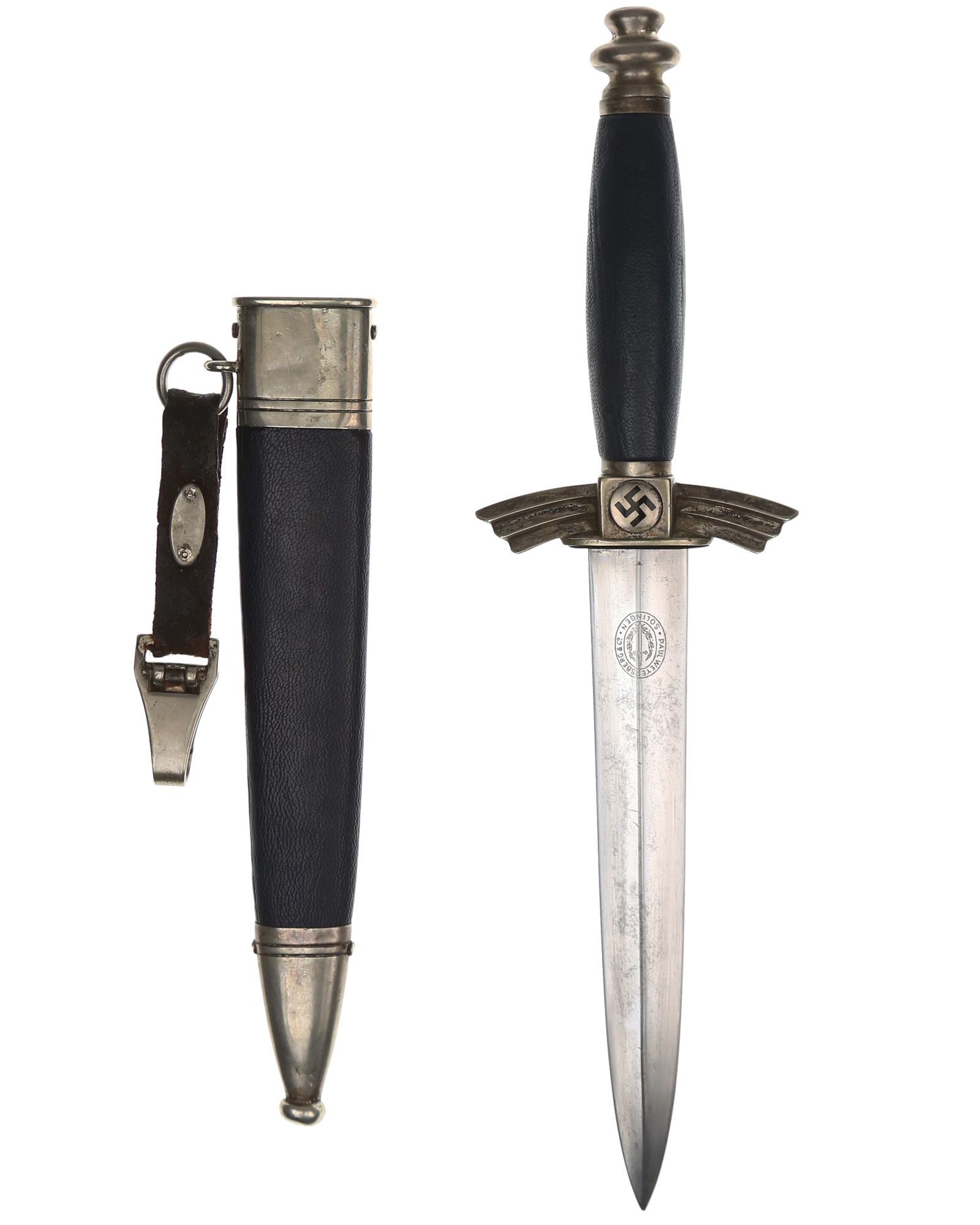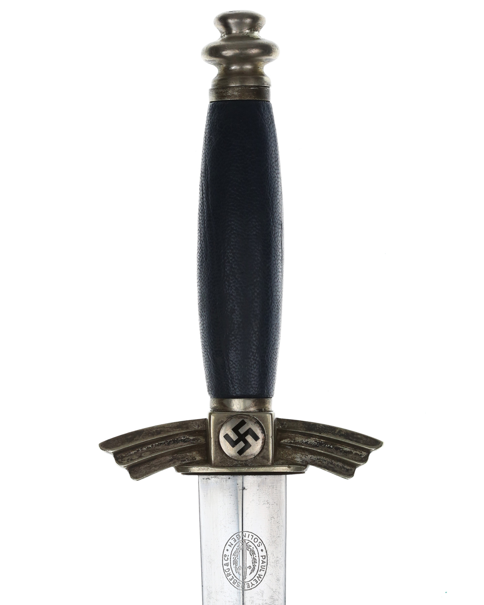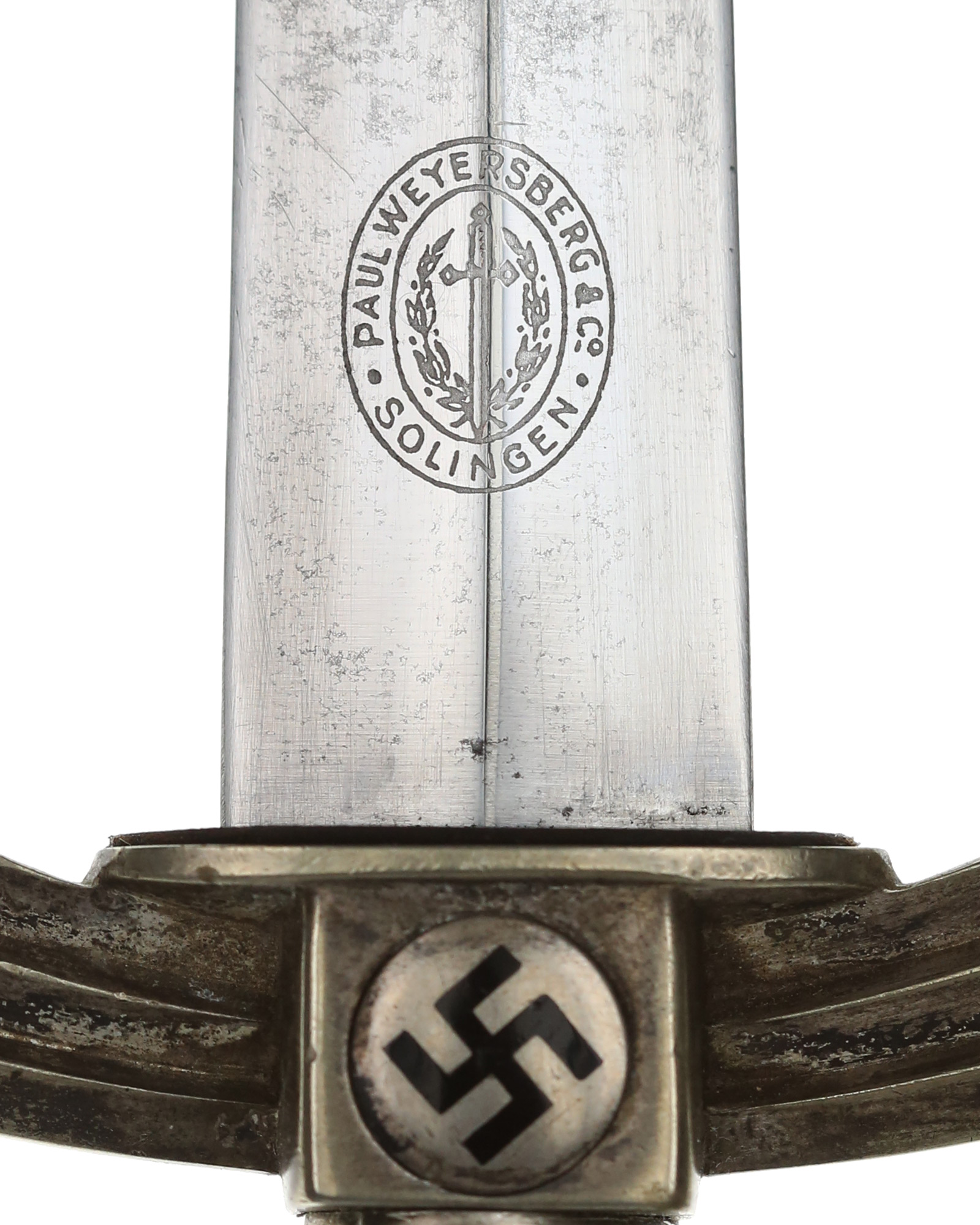 Klinge: Die Klinge ist zweischneidig und in einem gutem Zustand. Die Gesamtlänge der Klinge beträgt 174 mm und an der breitesten Stelle 25,09 mm. Auf der Rückseite der Klinge befindet sich das Herstellerlogo von Paul Weyersberg & Co., Solingen.