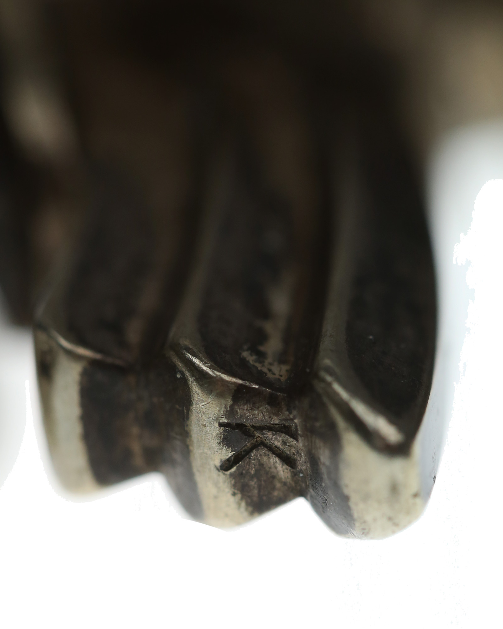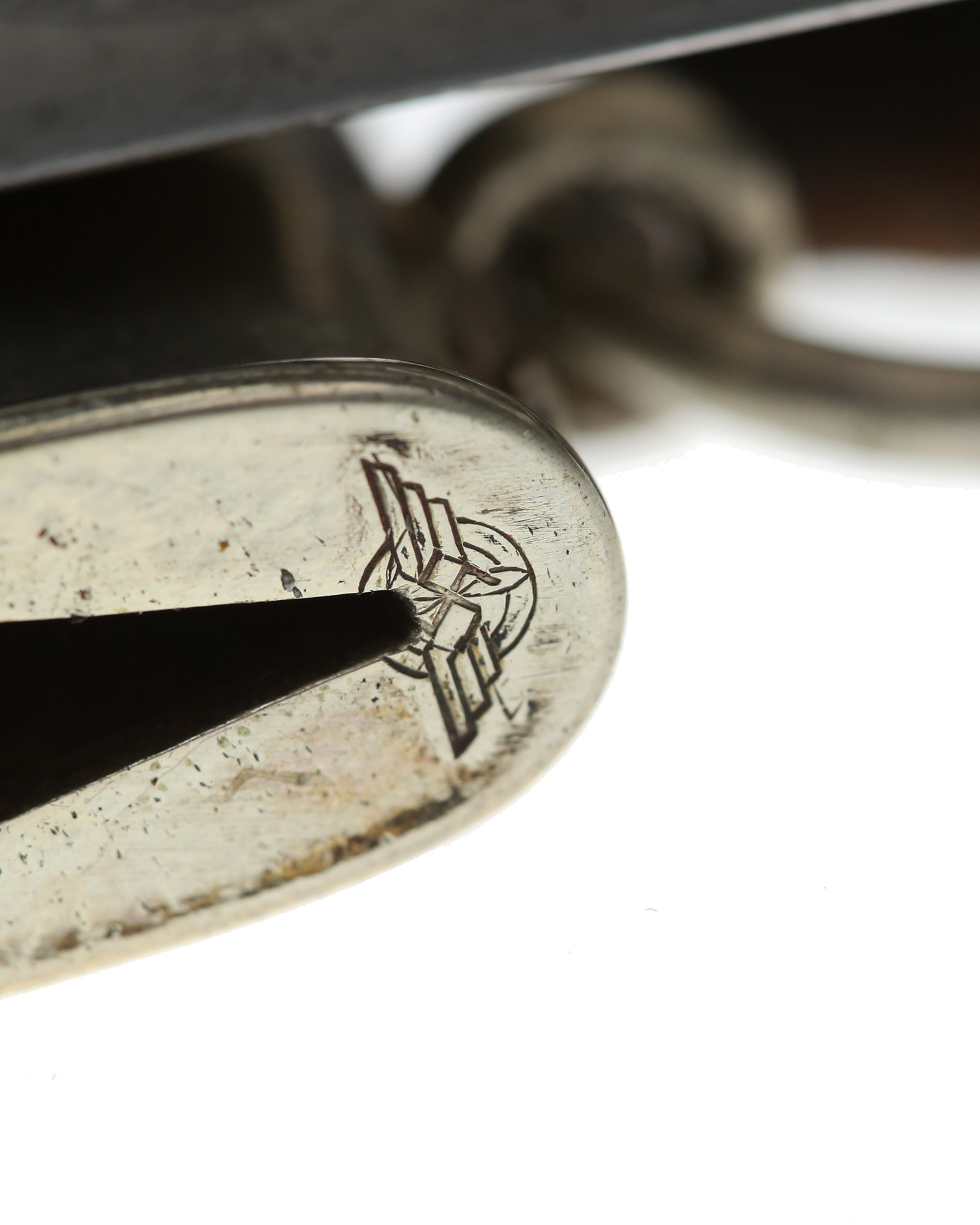 Gehänge: Der Lederhänger ist aus dunkelem Leder und wird mittels zweier ovaler Plättchen, welche miteinander vernietet sind, gehalten. Der Karabinerhaken ist aus Neusilber und ebenfalls mit Patina überzogen. Der Karabinerhaken ist ohne jegliche Herstellerkennzeichnung.