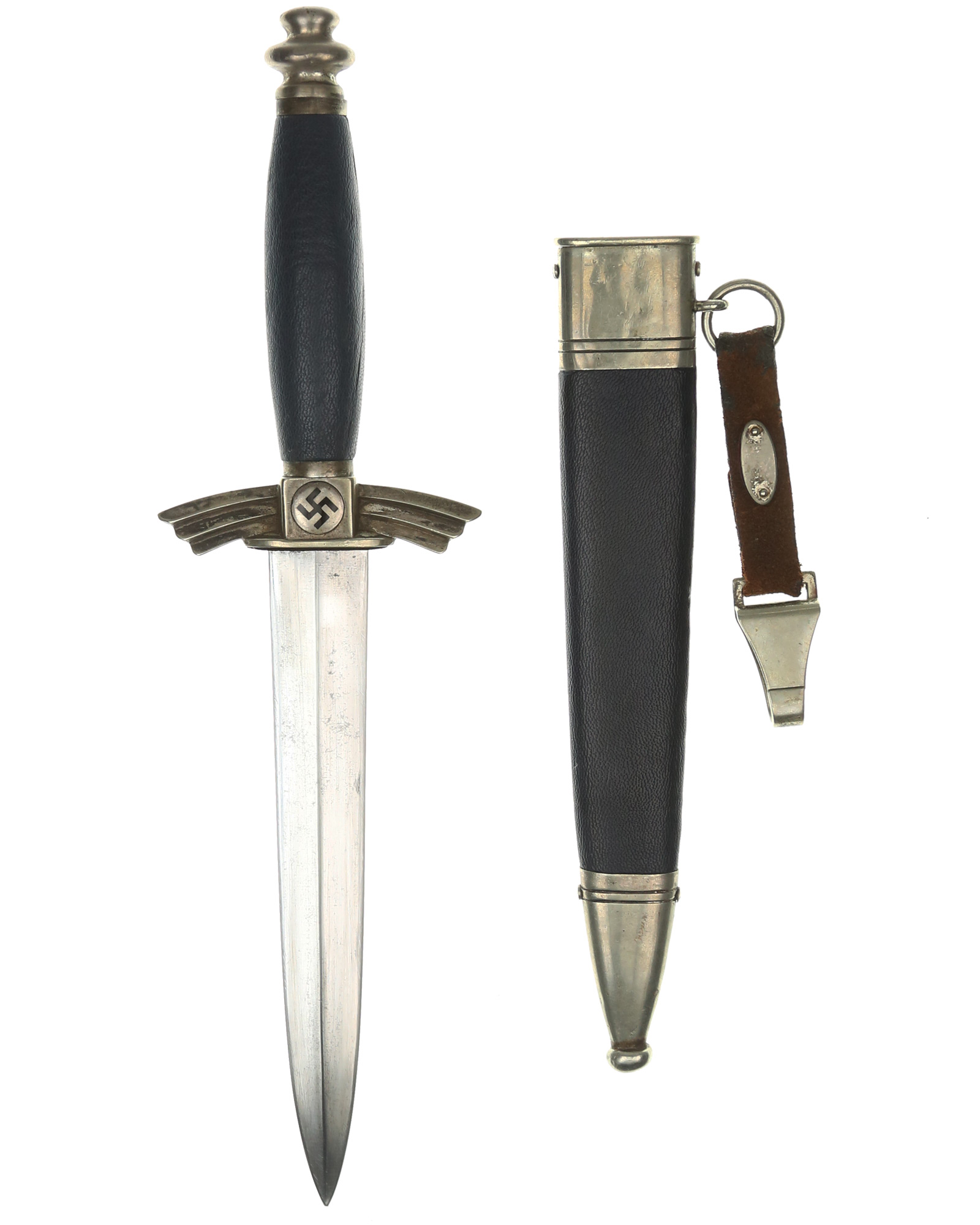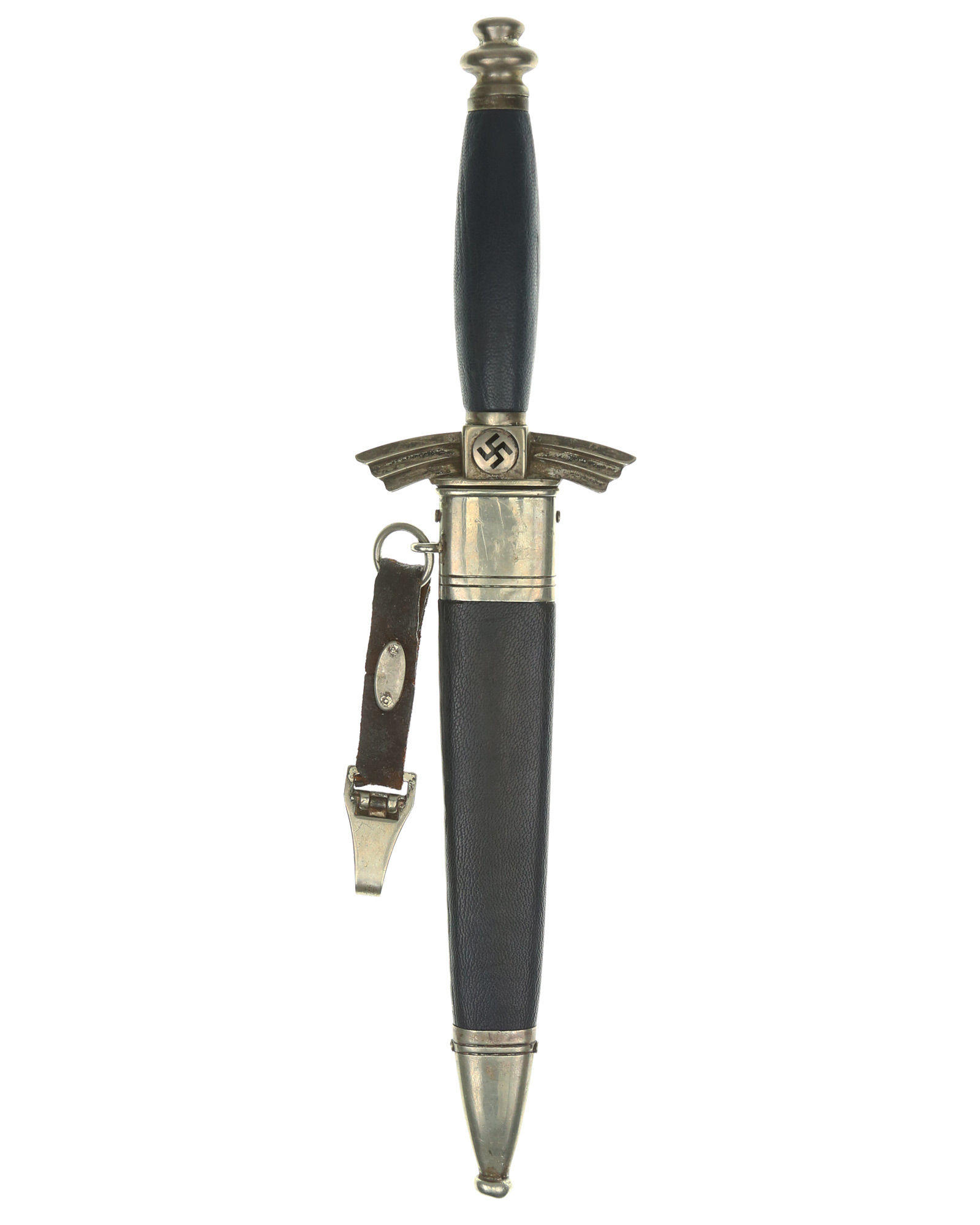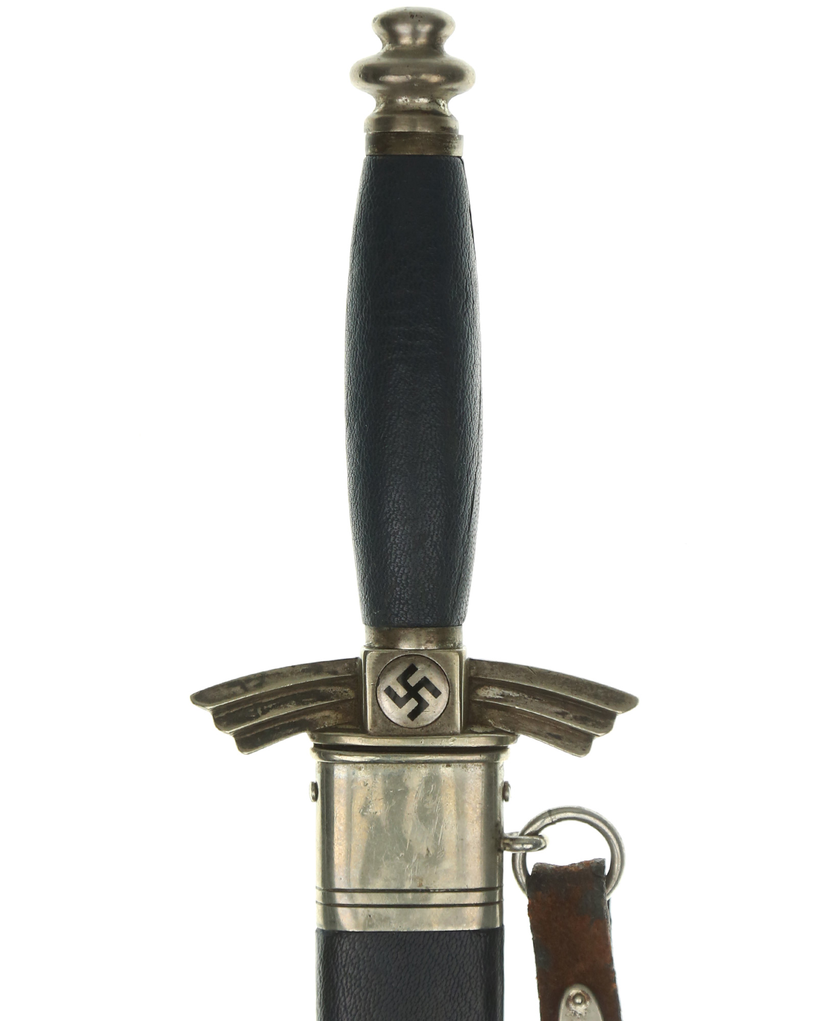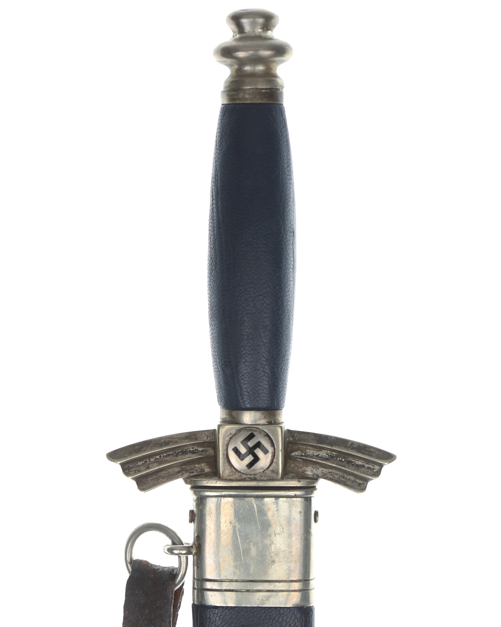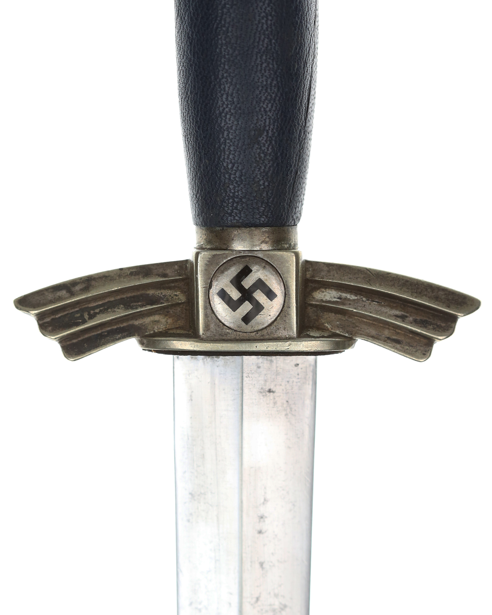 Griff: Der Griff besteht aus einem Holzkern und ist mit dunkelblauem Leder überzogen. Die Parierstange und der Knauf sind aus Neusilber gefertigt. Die Hakenkreuzmedaillons sind emailliert und in die Parierstange zentral eingesetzt. Die Parierstange hat die Form stilisierter Flügel und ist leicht nach unten gebogen. Seitlich am Flügel ist die Parierstange mit einem „K“, dem Kürzel des Gussherstellers versehen. Unterhalb der Parierstange befindet sich das originale blaue Stoßleder. Das DLV Messer wird durch einen am oberen Griffende verschraubten Knauf zusammengehalten.