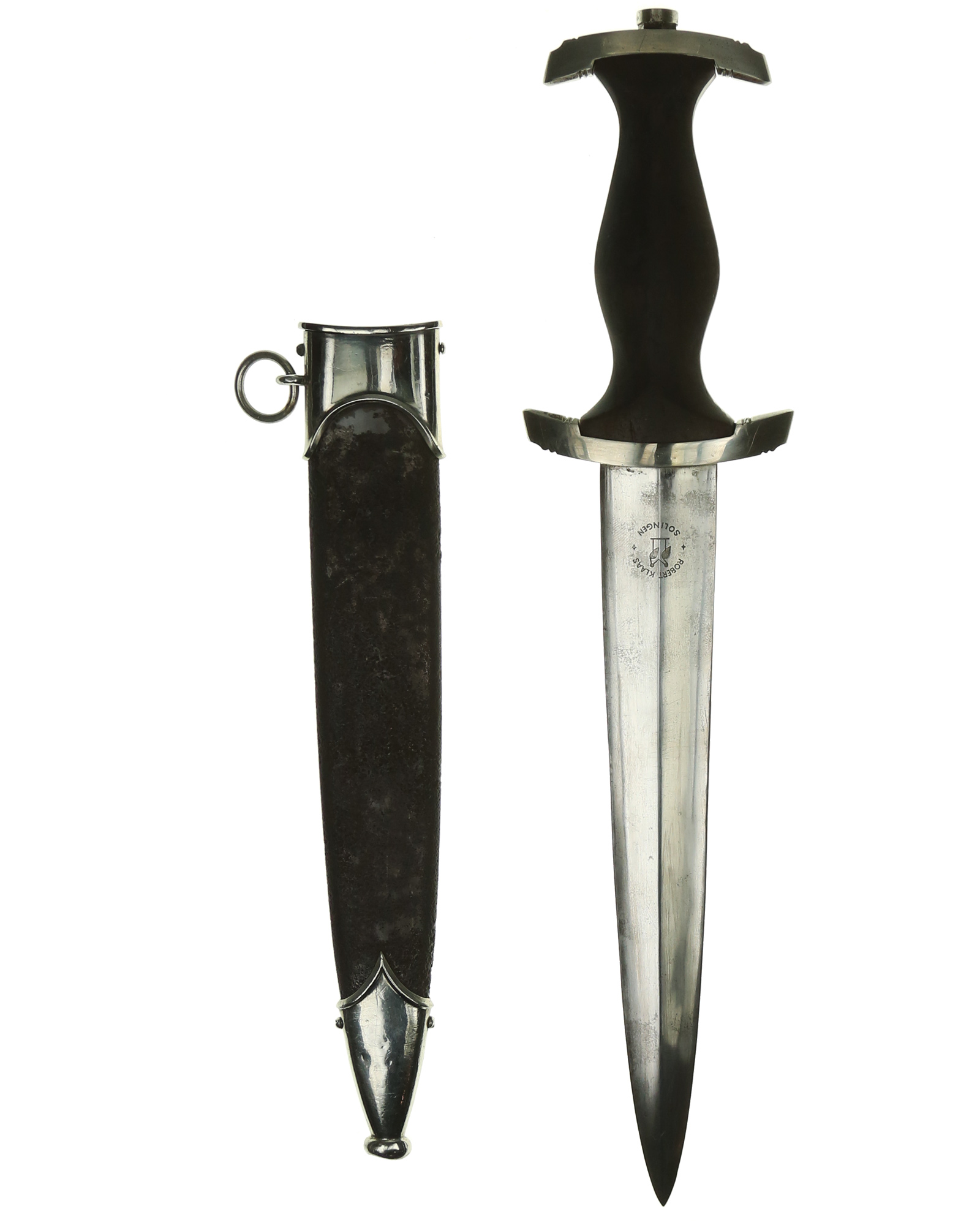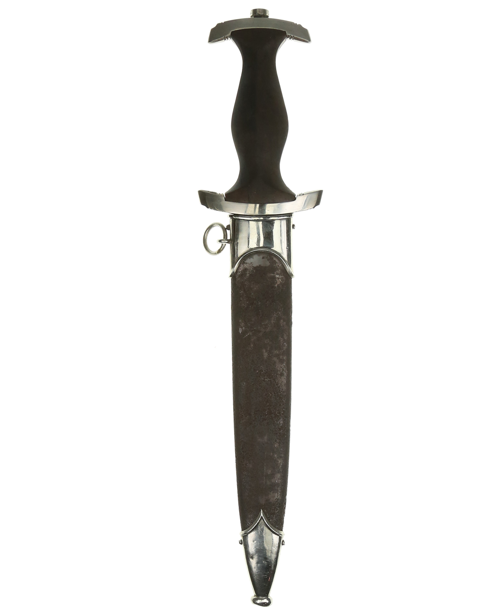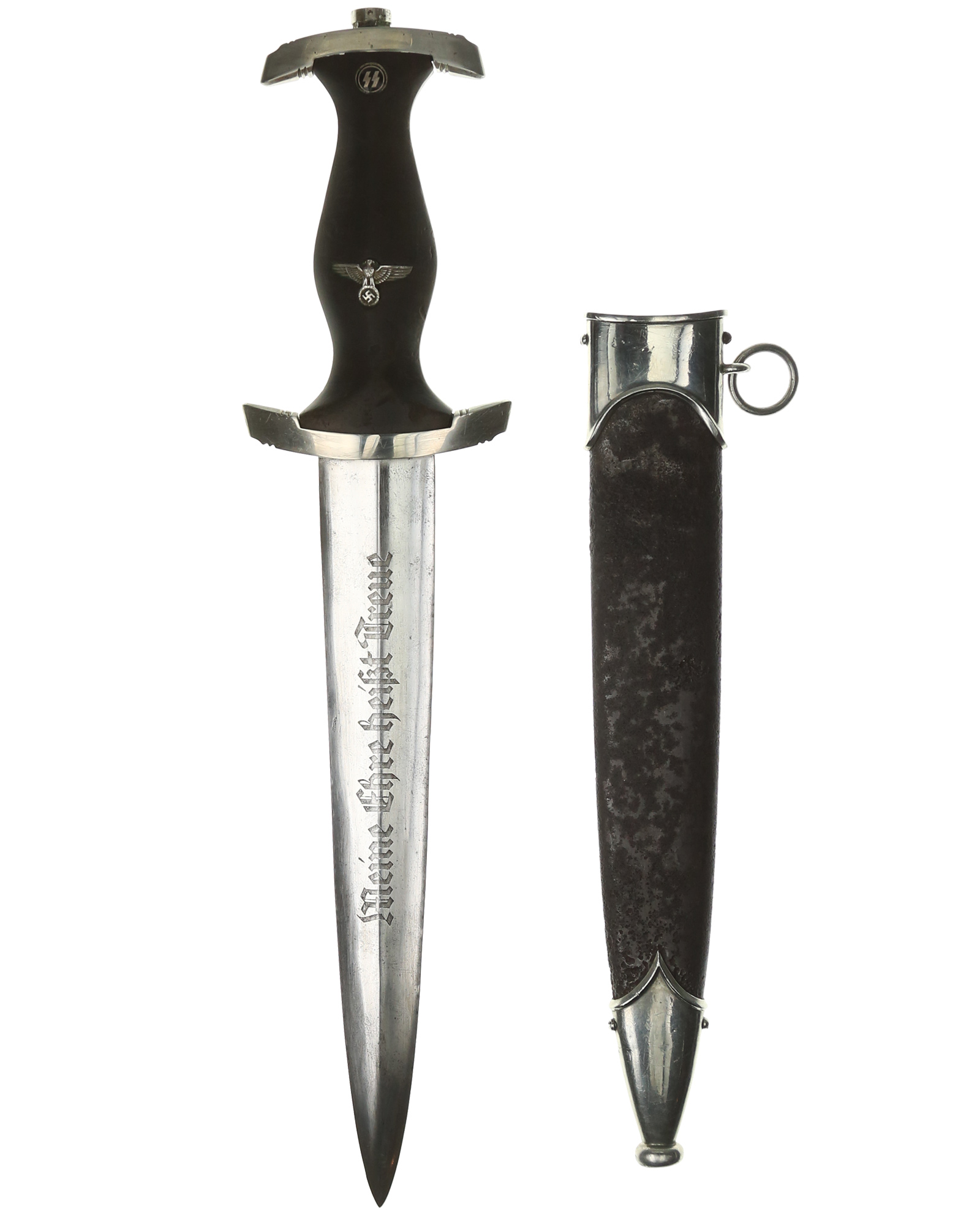 Dienstdolch M33 der Schutzstaffel [SS] in früher Fertigung. Der Hersteller auf der Klinge ist Robert Klaas, Solingen. Untere Parierstange mit der römischer III gekennzeichnet.