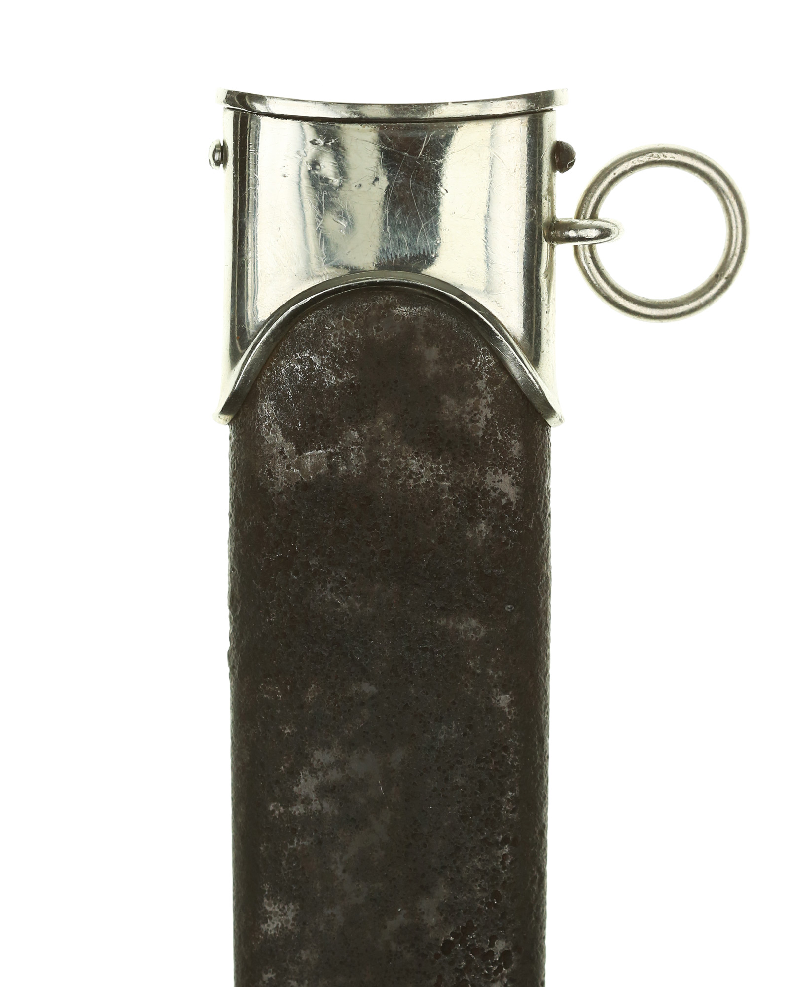 Scheide: Die Scheide ist aus Eisen und mit Restbrünierung. Die beiden Scheidenbeschläge sind aus vernickeltem Stahlblech und sind sauber, ohne Rost. Die Beschläge werden mit jeweils zwei Schräubchen seitlich gehalten.