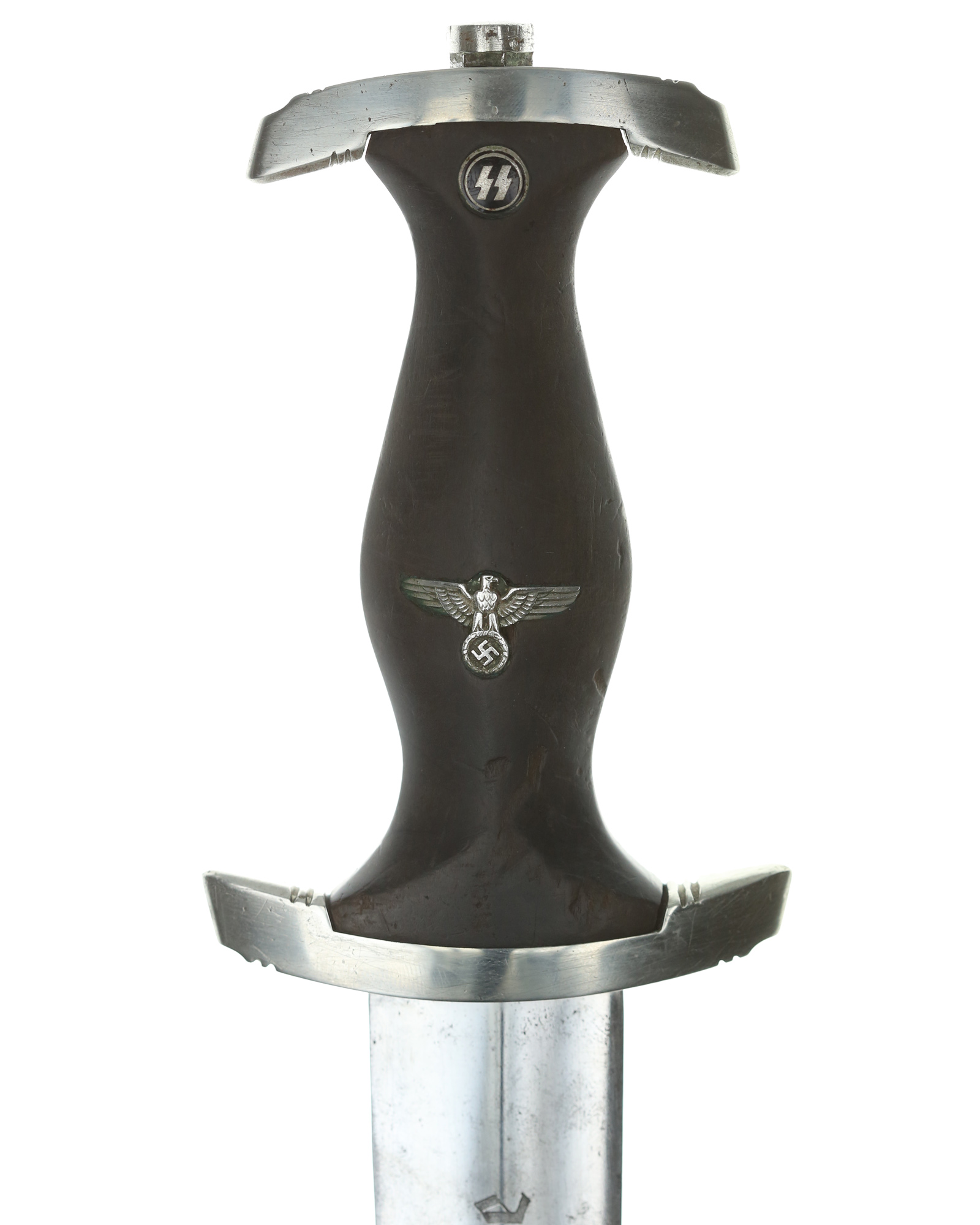Griff: Der Griff besteht aus Holz, dieser hat an einigen Stellen gebrauchsspuren. Auf dem Griff befinden sich die SS Runen und der Hoheitsadler, diese sind innen geklammert. Die Parierstangen sind aus Neusilber. Auf der unteren Parierstange ist eine gedrehte, römische Zahl III [Berlin] gestempelt.