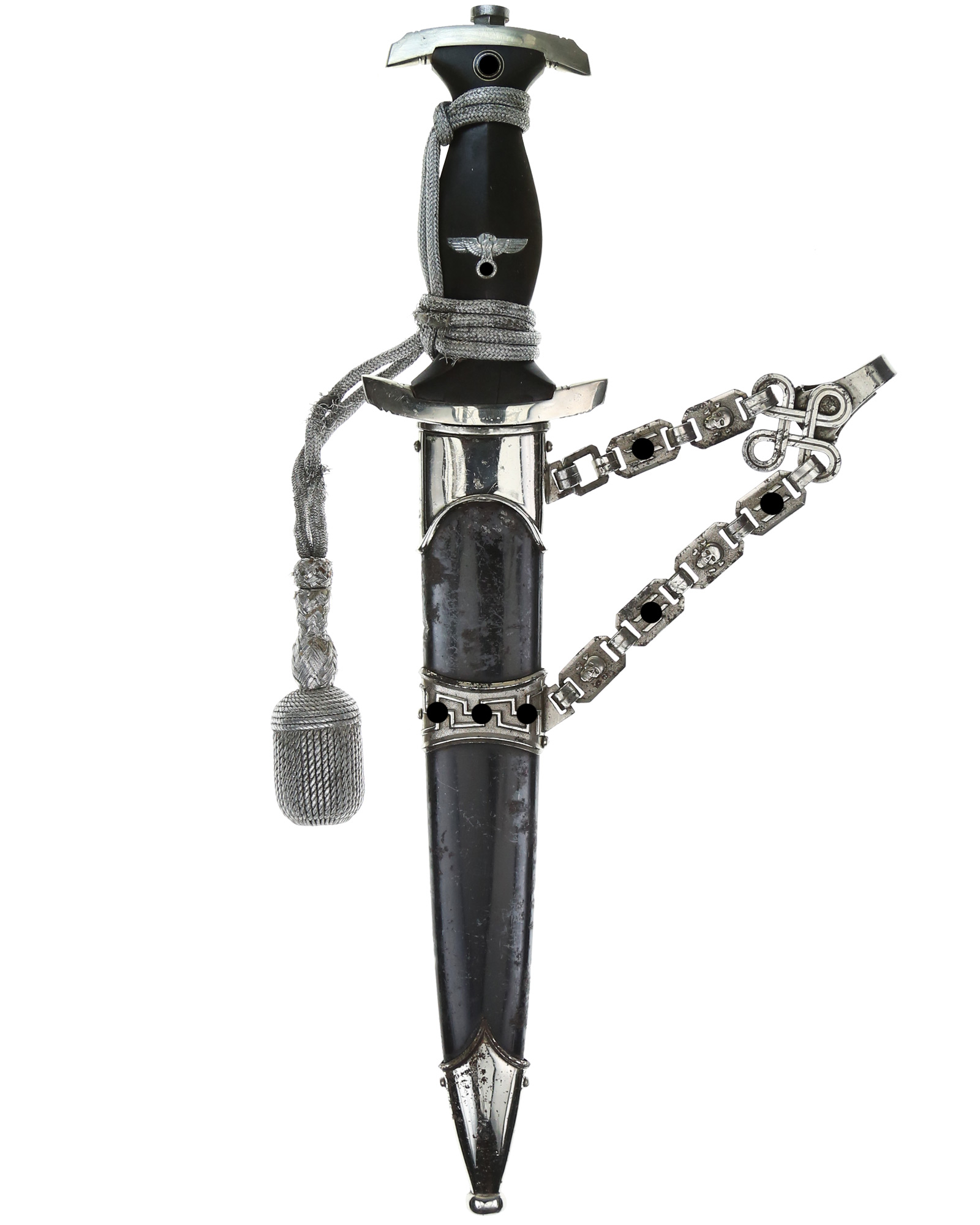 Gut erhaltener Dienstdolch der Schutzstaffel [SS] in später Fertigung. Modell 1936. Der Kettendolch kommt direkt aus Familiennachlass und war noch in keiner Sammlerhand. Der Kettentyp laut Ralf Siegert ist Typ-C, nach Thomas Wittmann Typ-I.