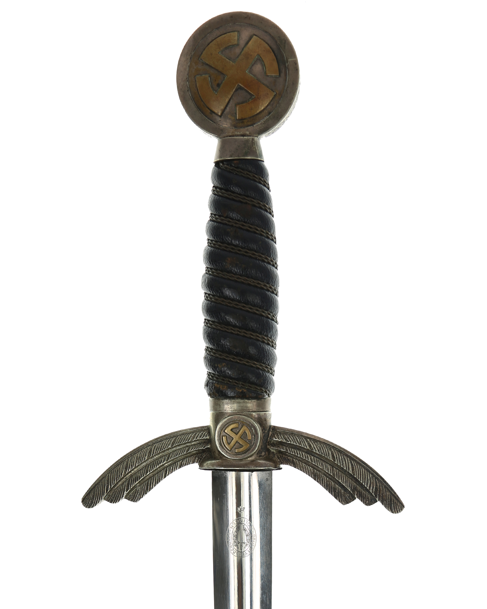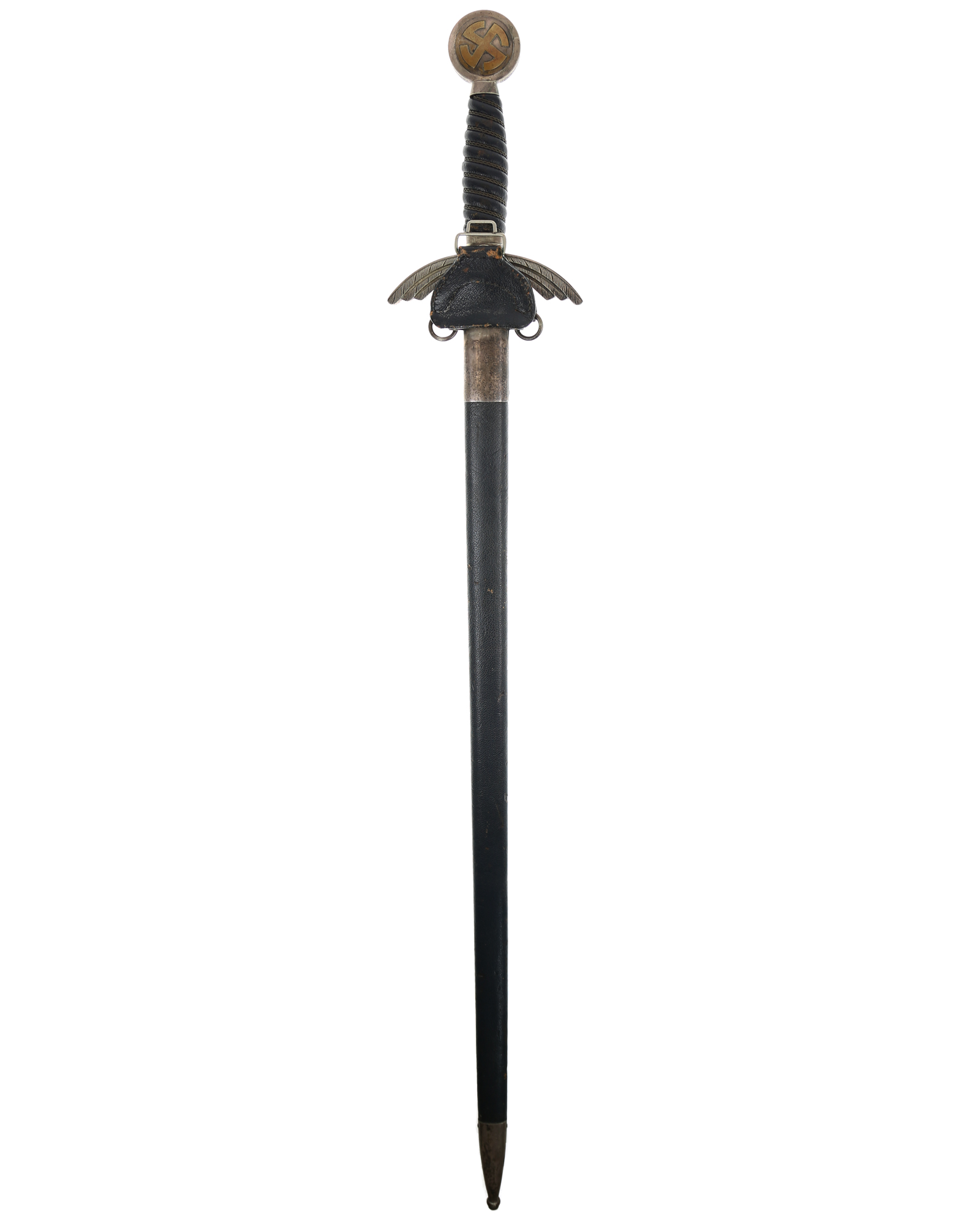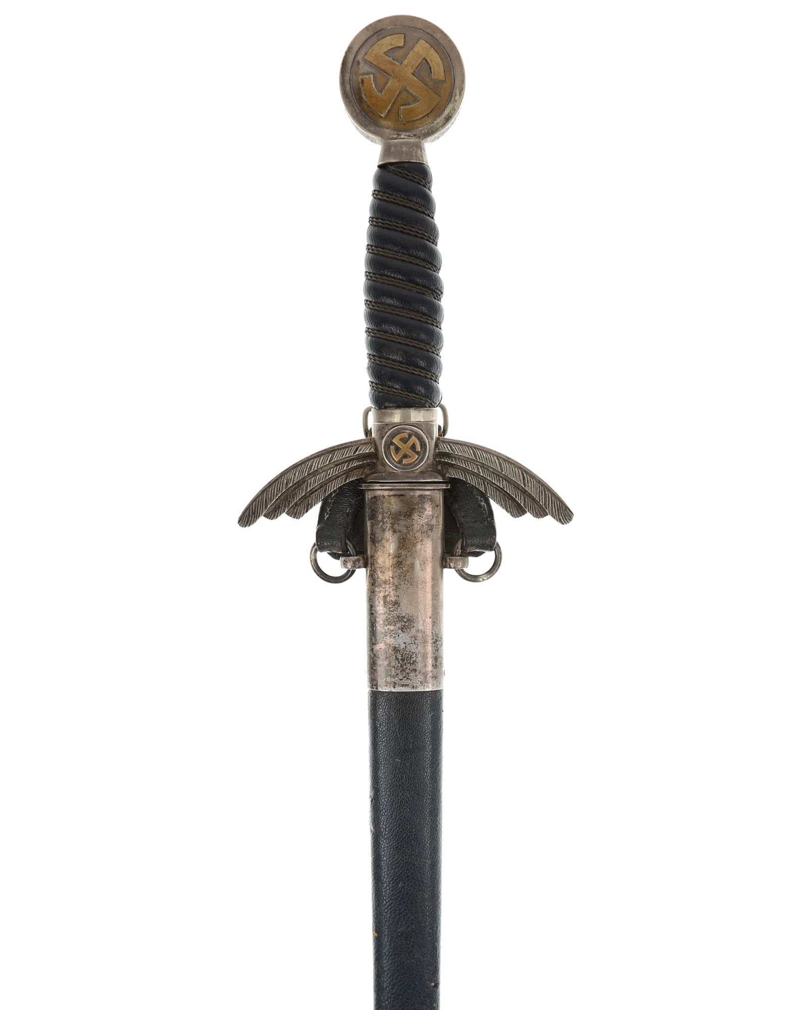 Schwere Ausführung mit sehr sauberen, fast spiegelblanken Klinge. Die Klinge ist vernickelt mit geätztem Herstellerloge Paul Weyersberg & Co., Solingen und Luftwaffenabnahmestempel 5. Versilberter Knauf und Parierstange mit goldenen Sonnenrädern. Blau belederter Griff mit Drahtwicklung. Blau belederte Scheide mit versilberten Beschlägen und schöner Patina. Gesamtlänge beträgt 93,9 cm.