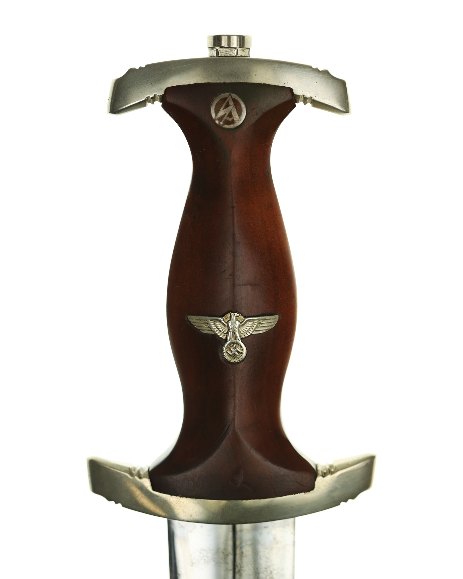 Griff: Brauner Holzgriff, der Hoheitsadler im Griff ist in Nickelausführung, darüber befindet sich das emaillierte SA-Emblem, diese sind innen geklammert und noch nie rausgenommen worden. Beide Parierstangen sind aus Nickel. Die untere Parierstange ist auf der Rückseite mit dem Gruppenstempel BO [Bayrische Ostmark] handgestanzt.