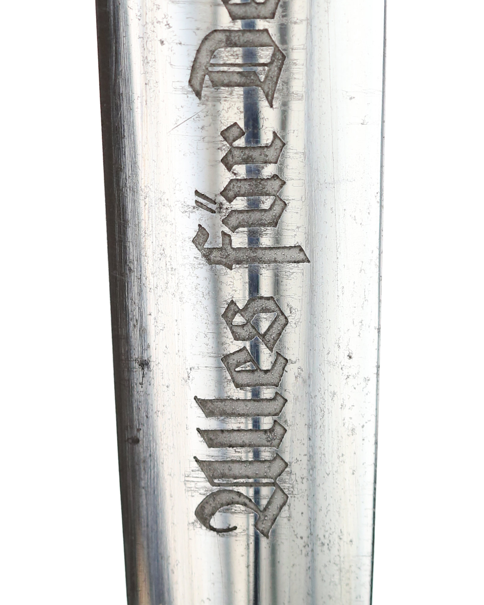 Scheide: Die Scheide ist aus Eisen und mit brauner Brünierung, auf beiden Seiten zum Teil noch vorhanden. Die Scheide ist gerade ohne Dellen oder Beulen. Die beiden Scheidenbeschläge sind aus vernickeltem Stahlblech. Die Beschläge werden mit jeweils zwei Schräubchen seitlich gehalten. Am oberen Beschlag befindet sich der Ring für das Tragegehänge.