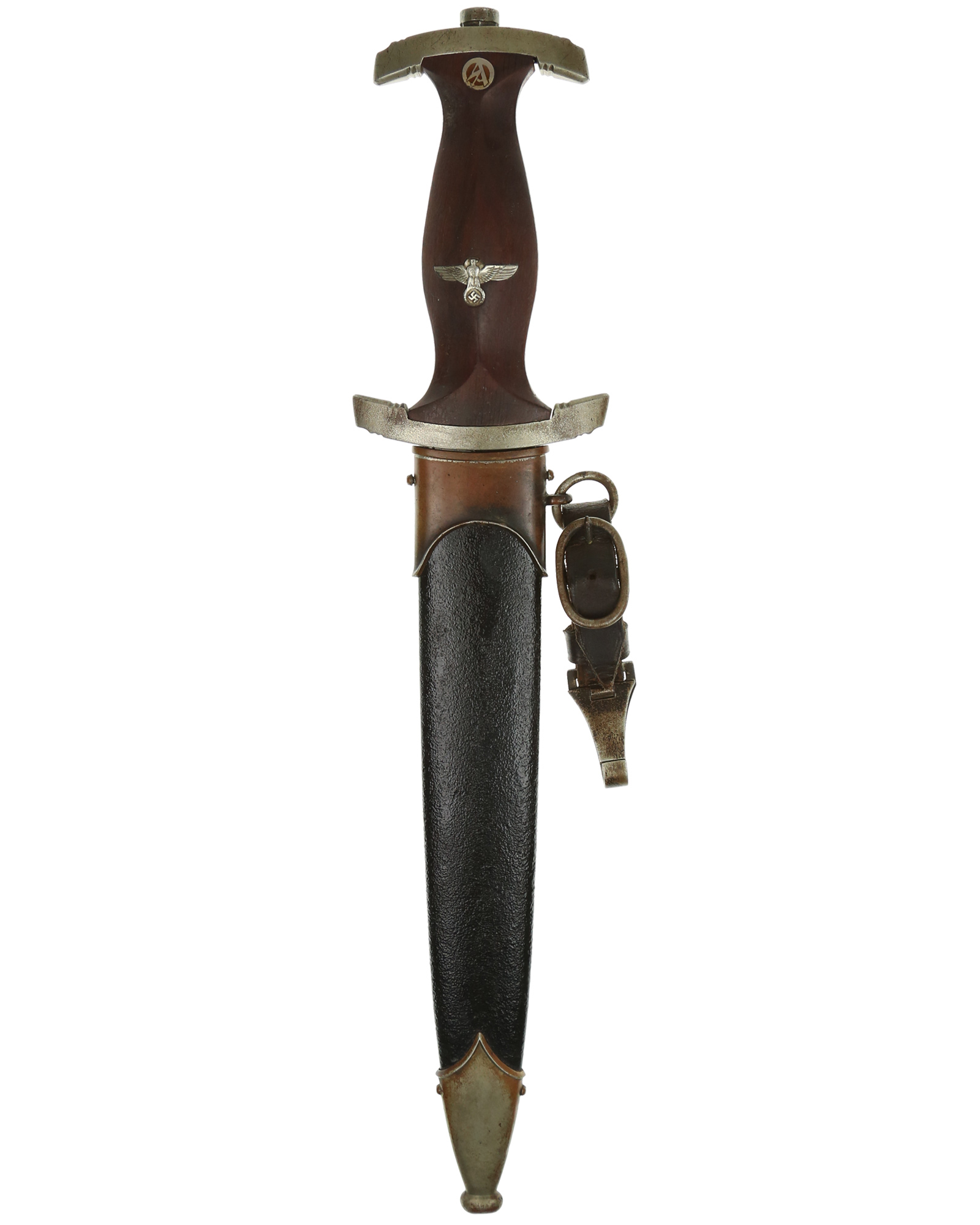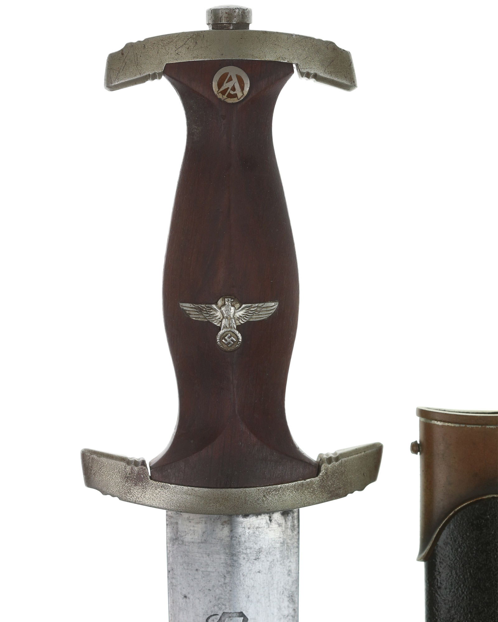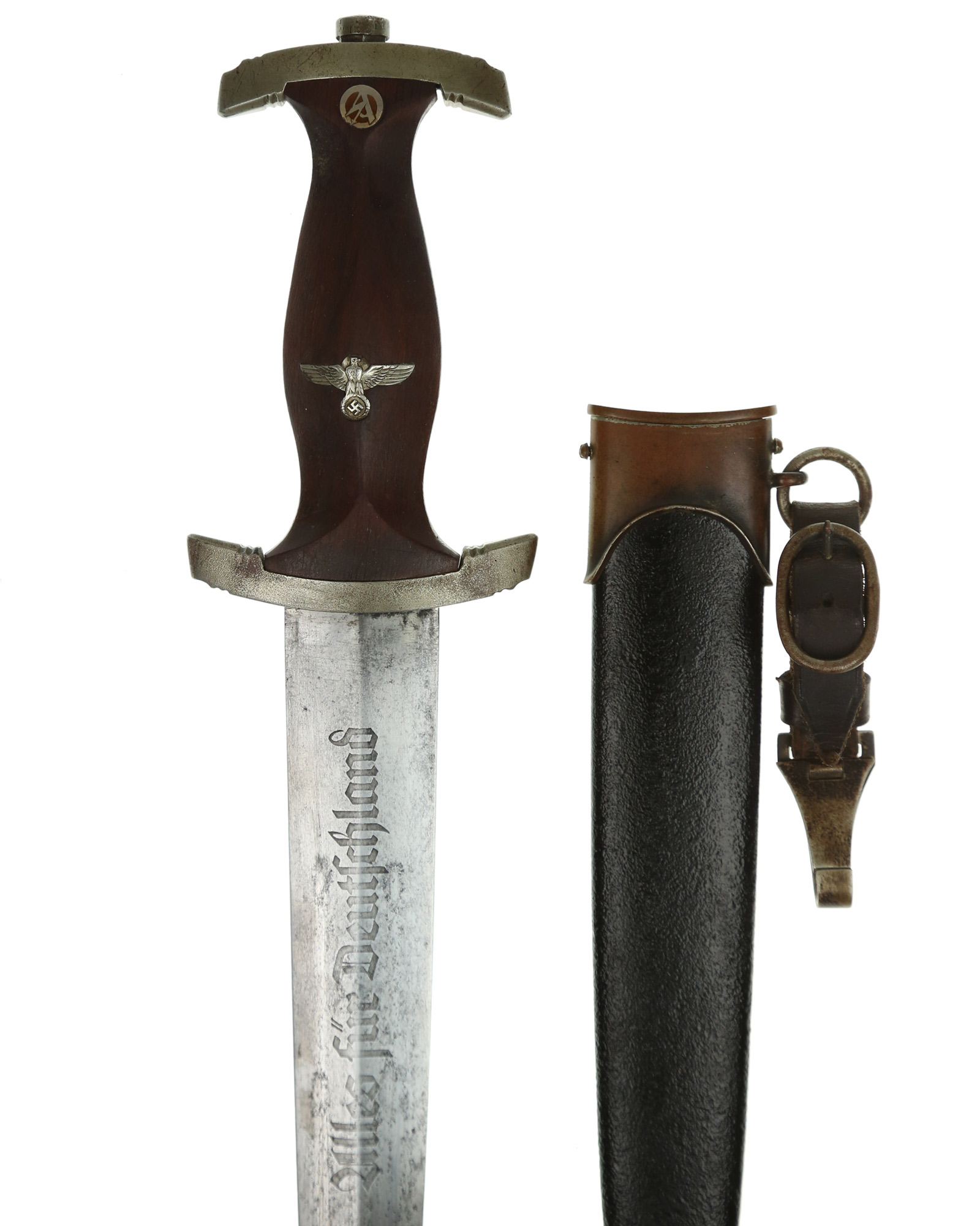 Griff: Brauner Holzgriff, der Hoheitsadler im Griff ist in Nickelausführung, darüber befindet sich das emaillierte SA-Emblem, diese sind innen geklammert und noch nie rausgenommen worden. Beide Parierstangen sind aus Nickel mit leichter Patinaschicht. Die untere Parierstange ist auf der Rückseite mit dem Gruppenstempel He [Hessen] handgestanzt.