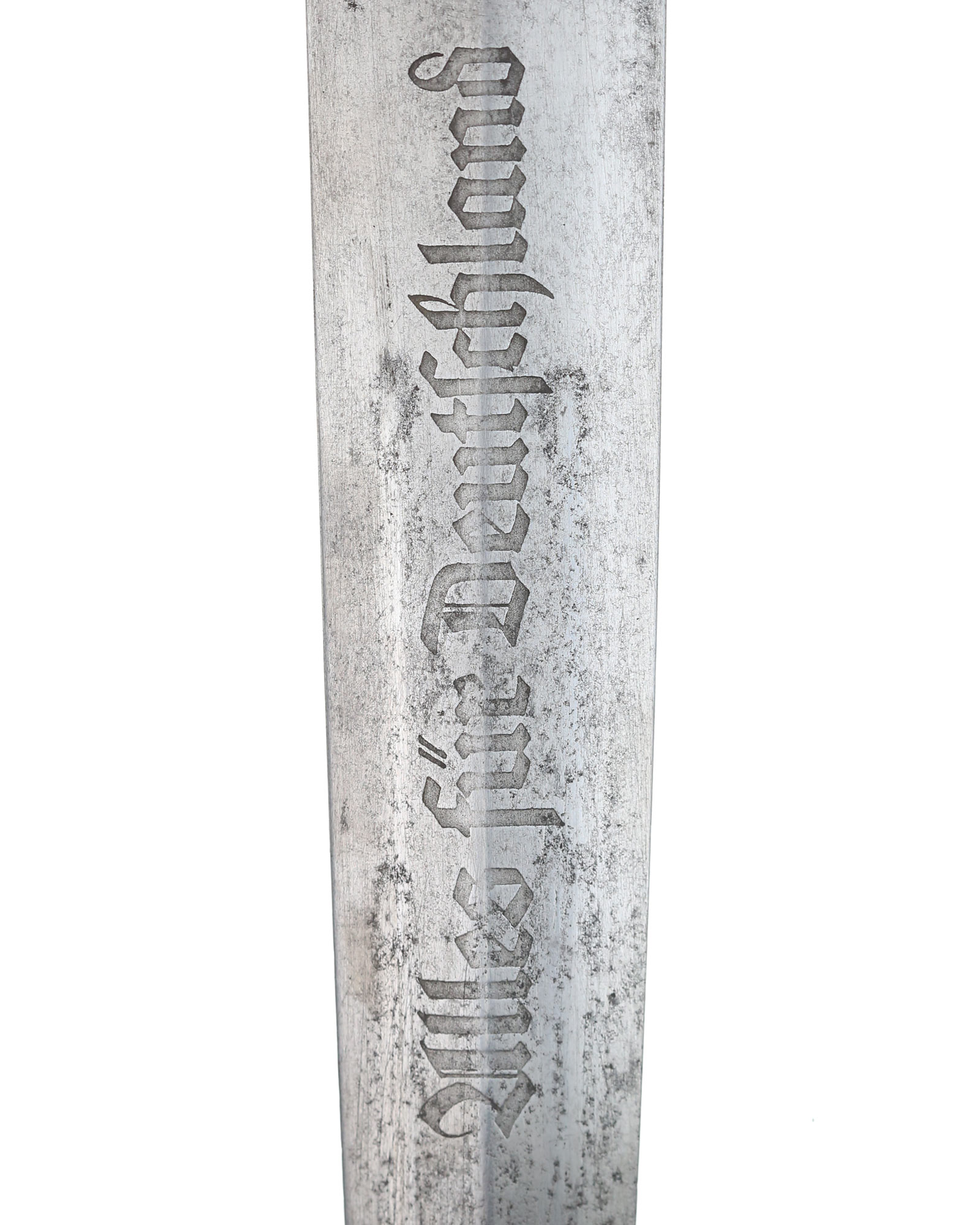 Klinge: Die Klinge ist leicht fleckig und etwas gekürzt Auf der Vorderseite der Klinge befindet sich die SA Devise, diese ist noch gut sichtbar, mit der Inschrift: Alles für Deutschland. Auf der Rückseite befindet sich das Herstellerlogo R.Haastert & Büll Solingen. Die Klingenschultern passen perfekt zu der unteren Parierstange.