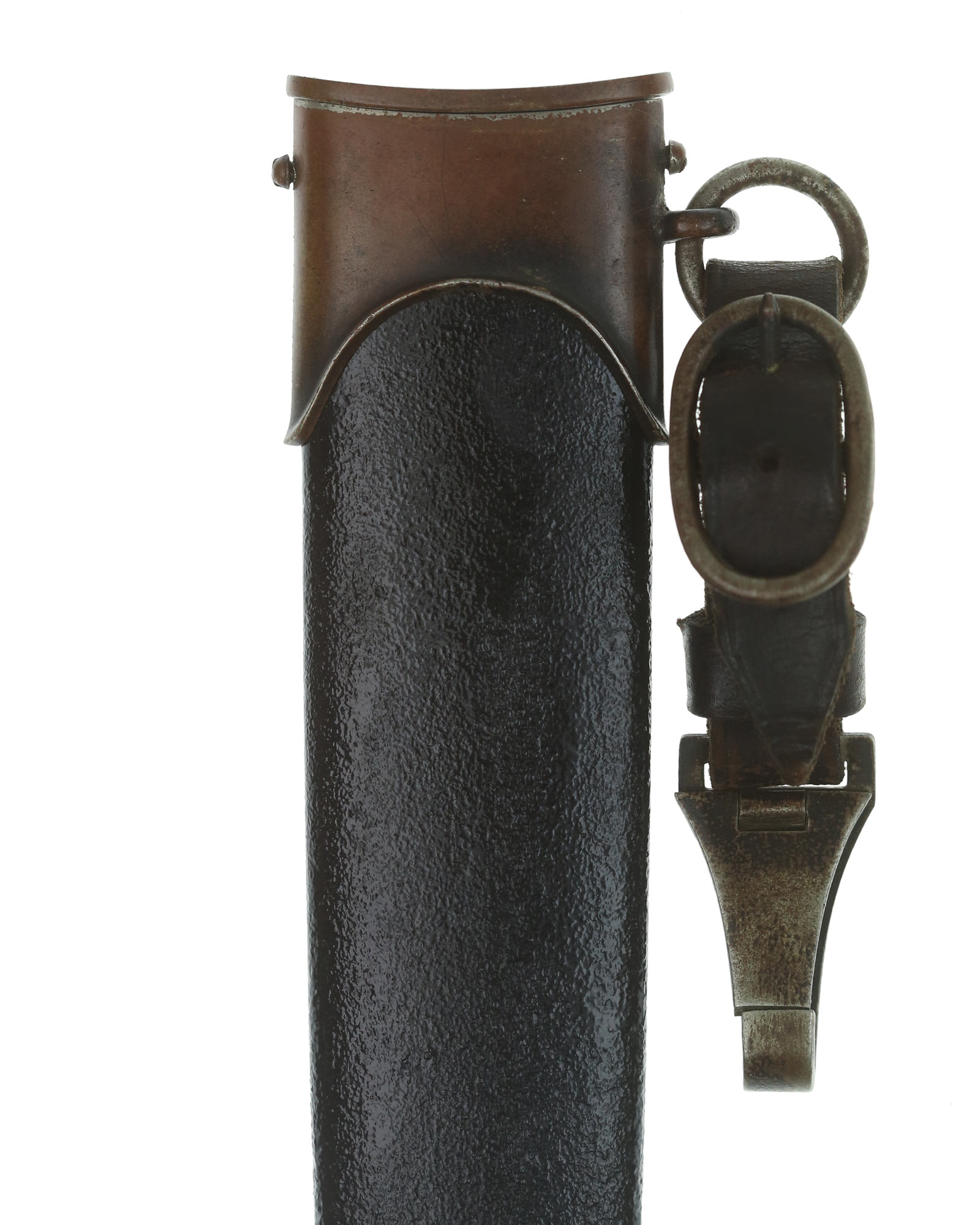 Scheide: Die Scheide ist aus Eisen und wurde mal vor Jahren nachlackiert. Diese hat keine Dellen oder Beulen. Die beiden Scheidenbeschläge sind aus vernickeltem Stahlblech, diese sind mit einer dunklen Patinaschicht überzogen. Die Beschläge werden mit jeweils zwei Schräubchen seitlich gehalten. Am oberen Beschlag befindet sich der Ring für das Tragegehänger. Am Ring befindet sich das frühe, dunkelbraune SA Gehänge.