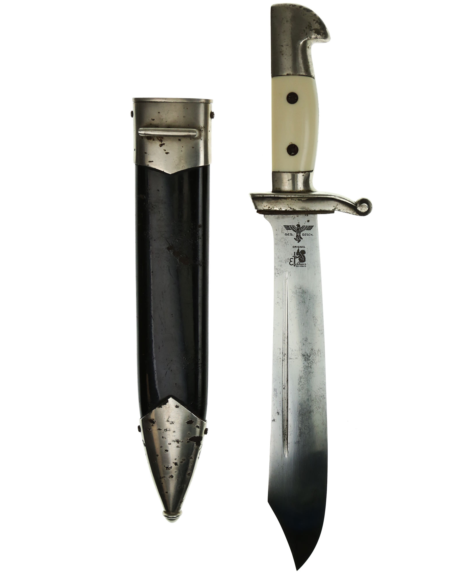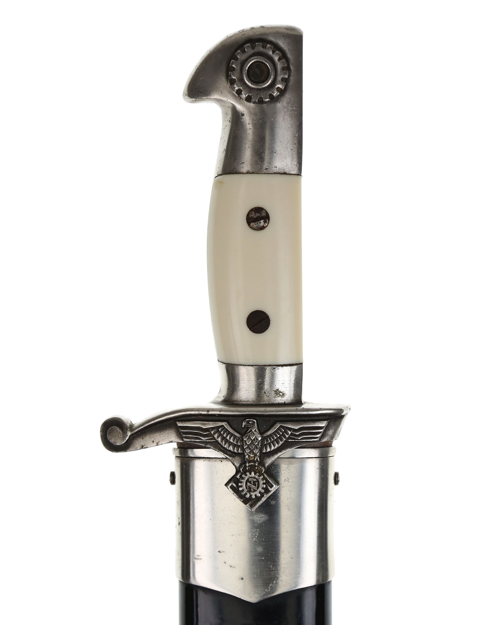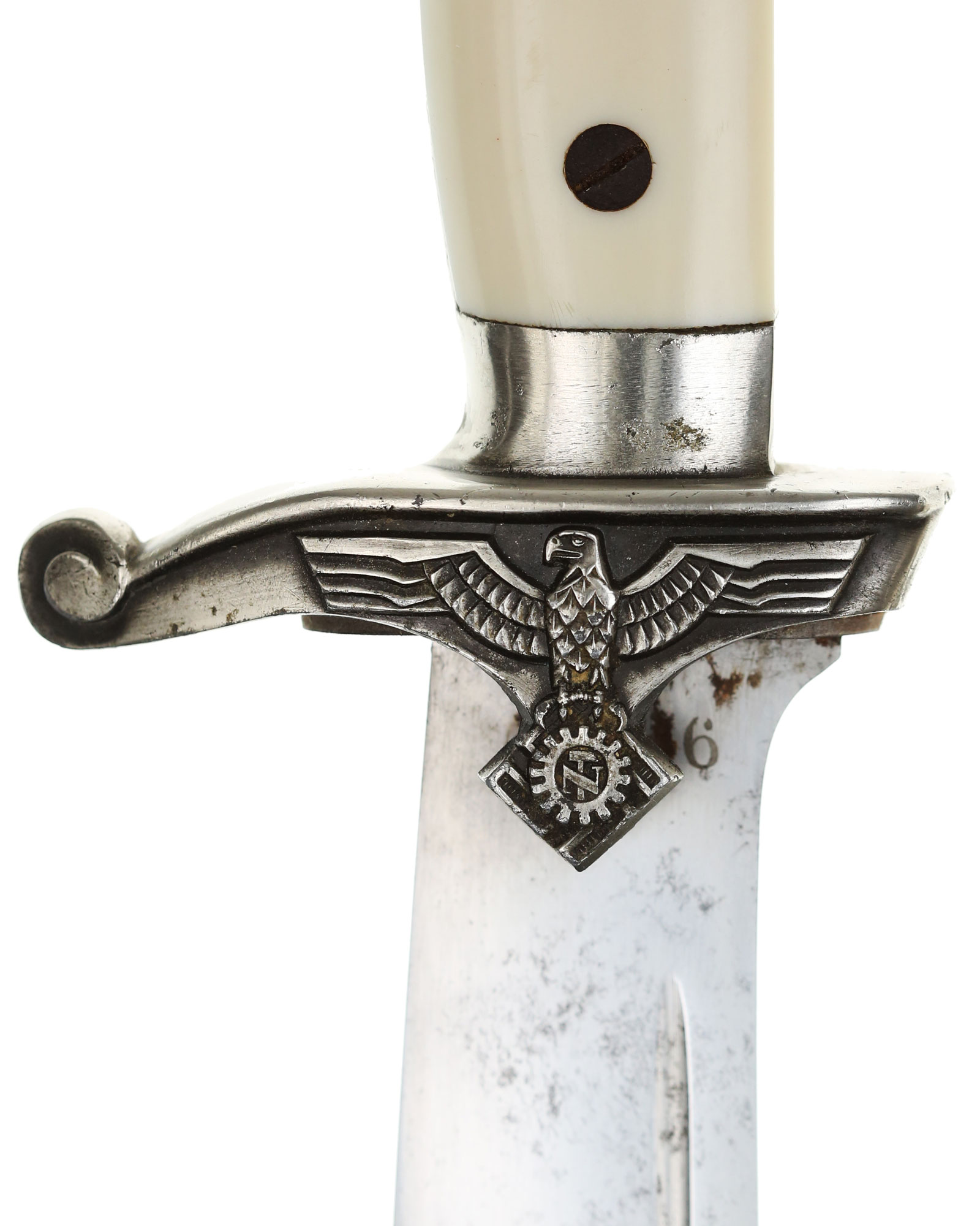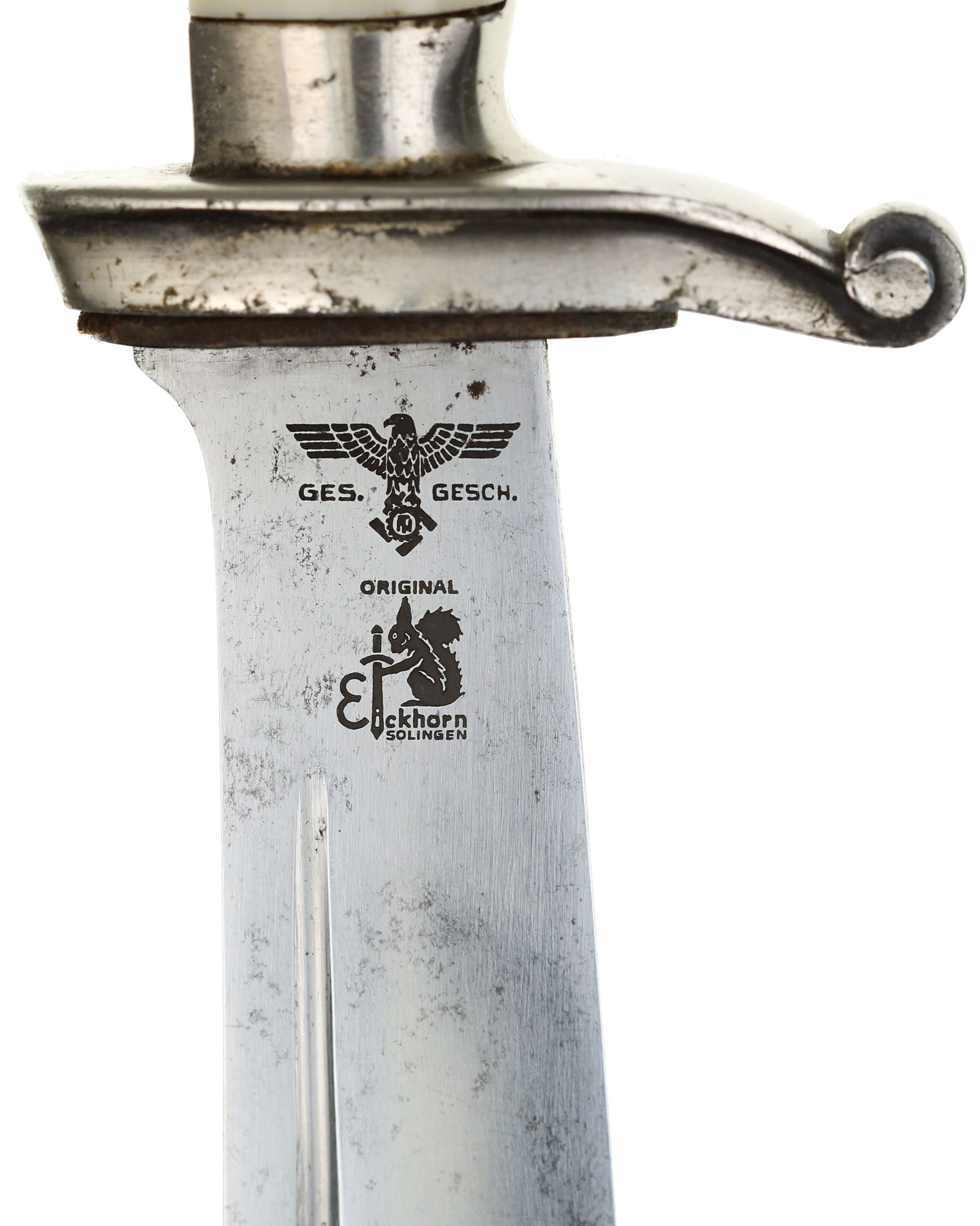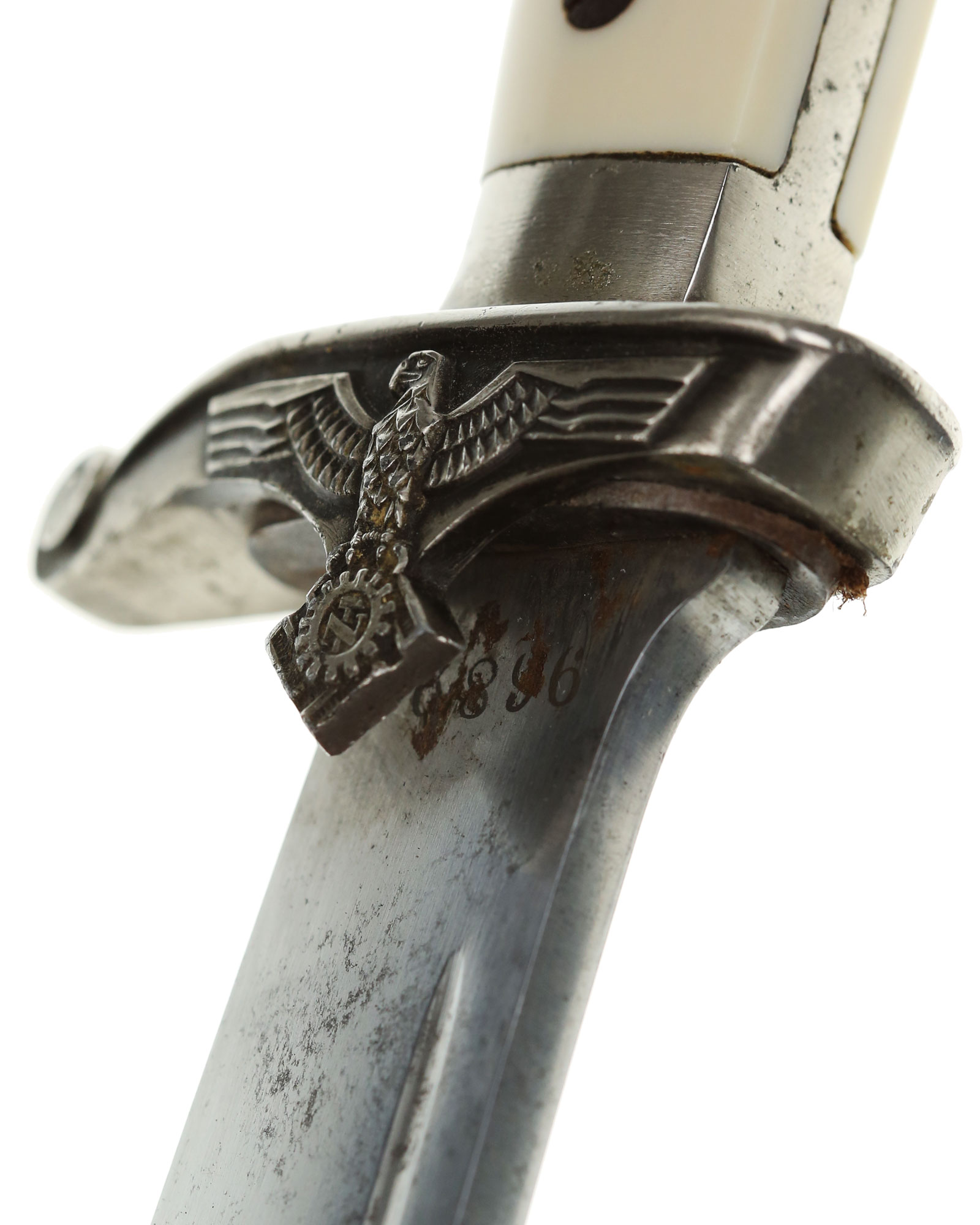 Griff: Der Griff ist mit zwei Kunststoff-Griffschalen, diese werden durch zwei Schrauben festgehalten, die noch nie geöffnet wurden. Versilberung des Griffes ist zu 95% erhalten. Die Parierstange ist in Form eines Reichsadlers, der nach links schaut. Zum linken Ende hin wirbelt das Ende nach oben. In der Mitte befindet sich der Adler, der in seinen Krallen einen Kranz mit typischem TENO Zeichen und einen Hakenkreuz festhält.