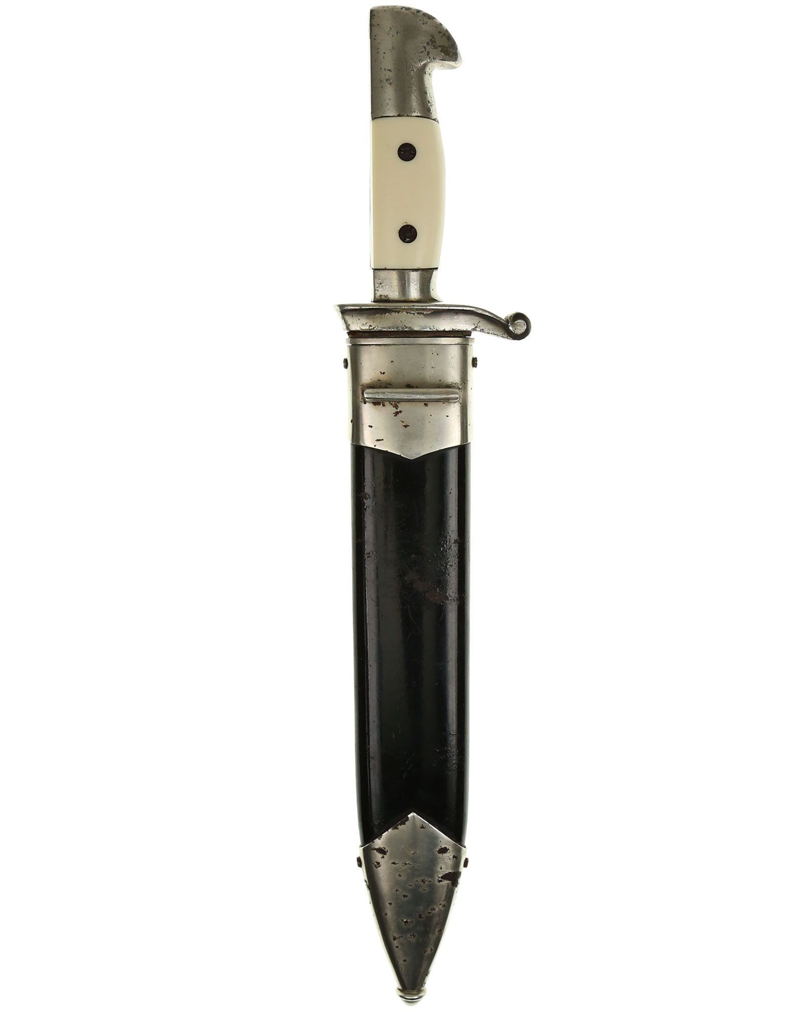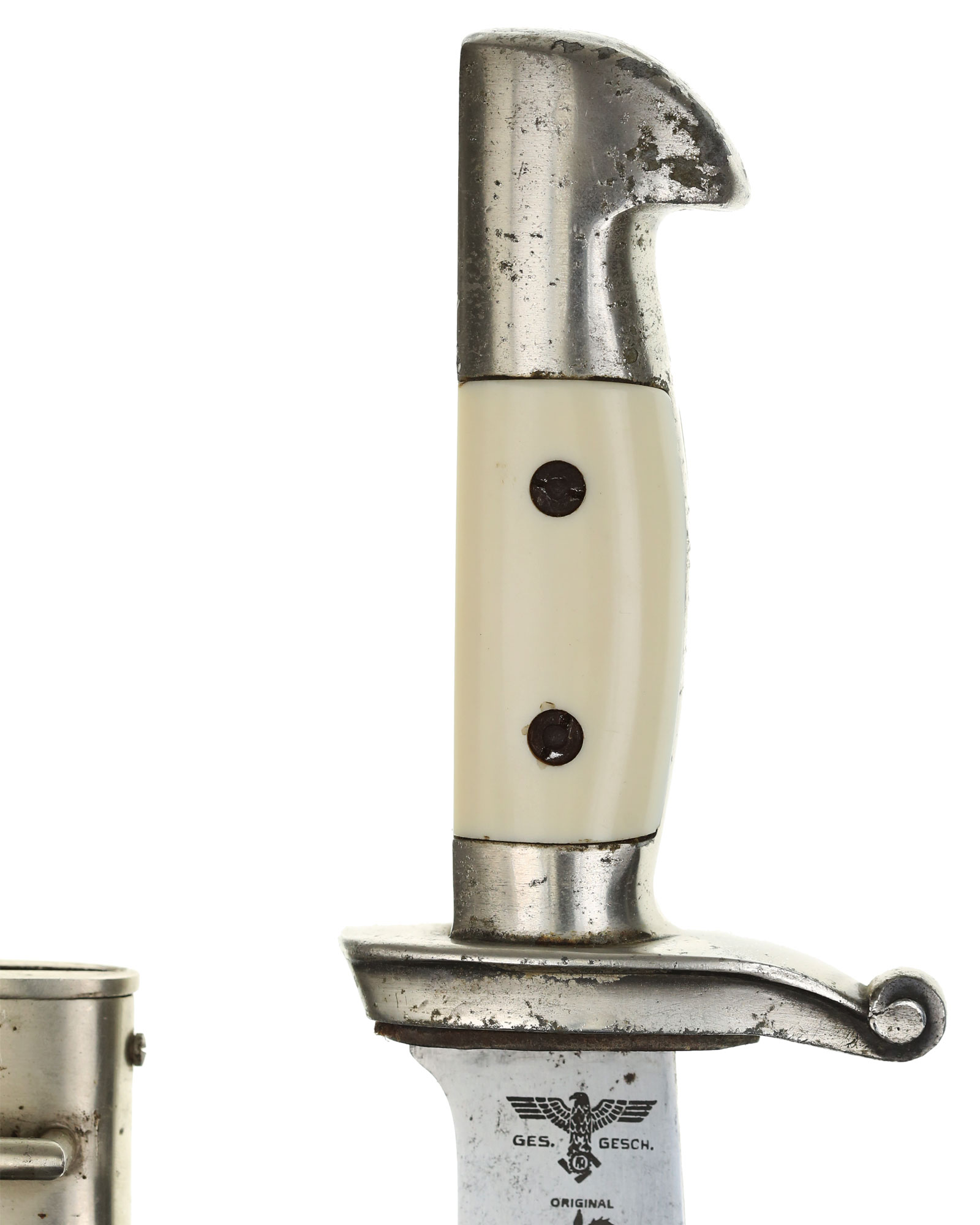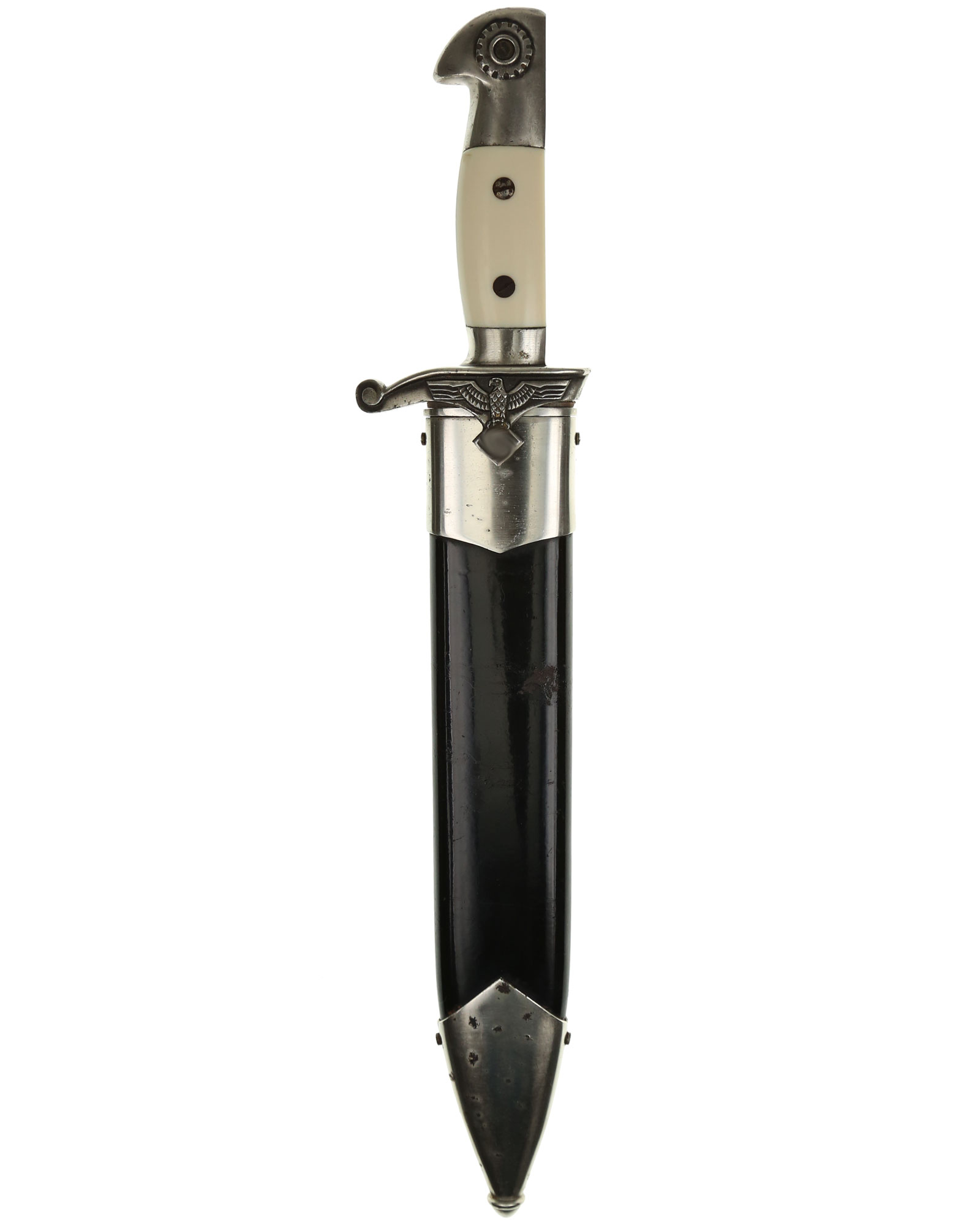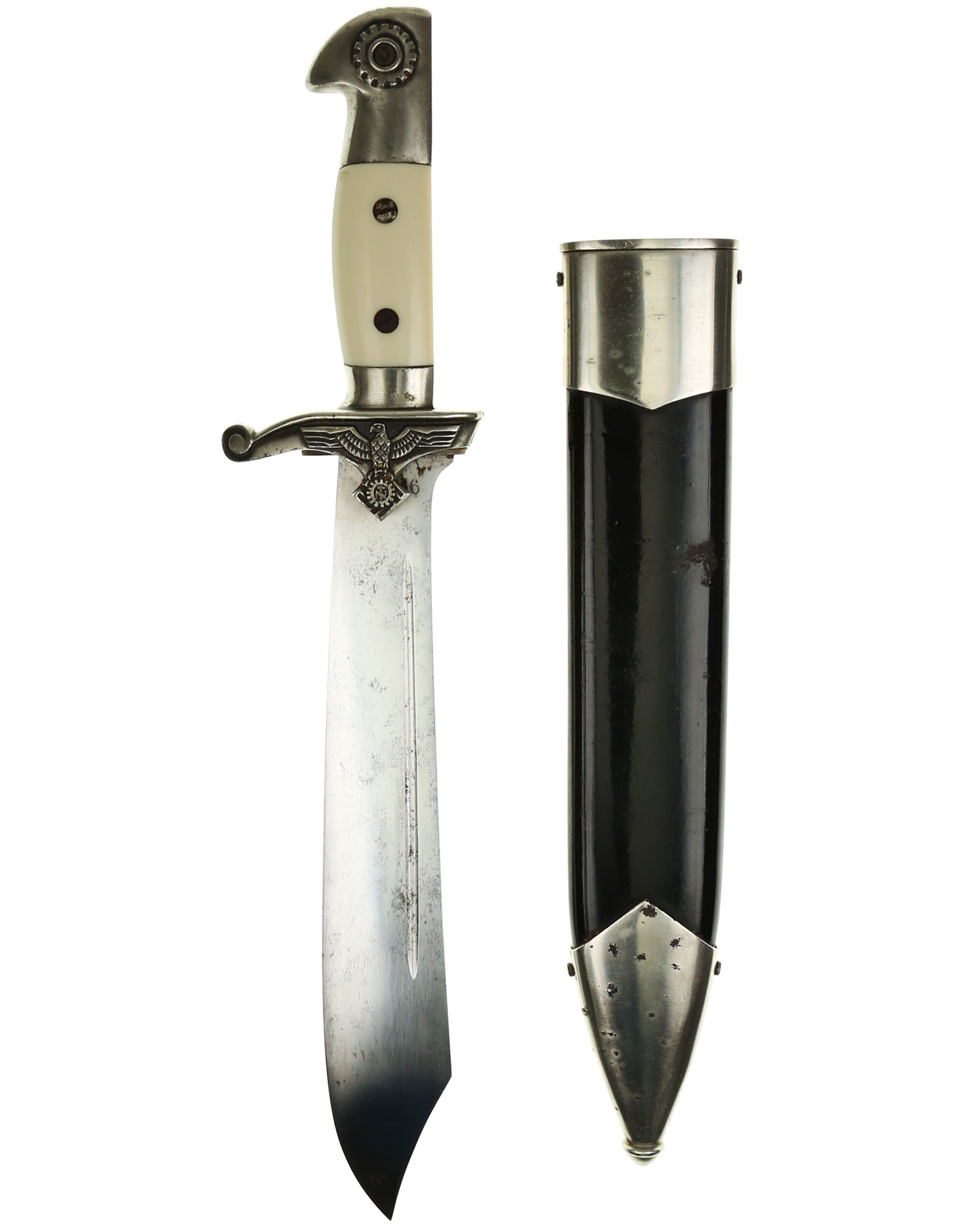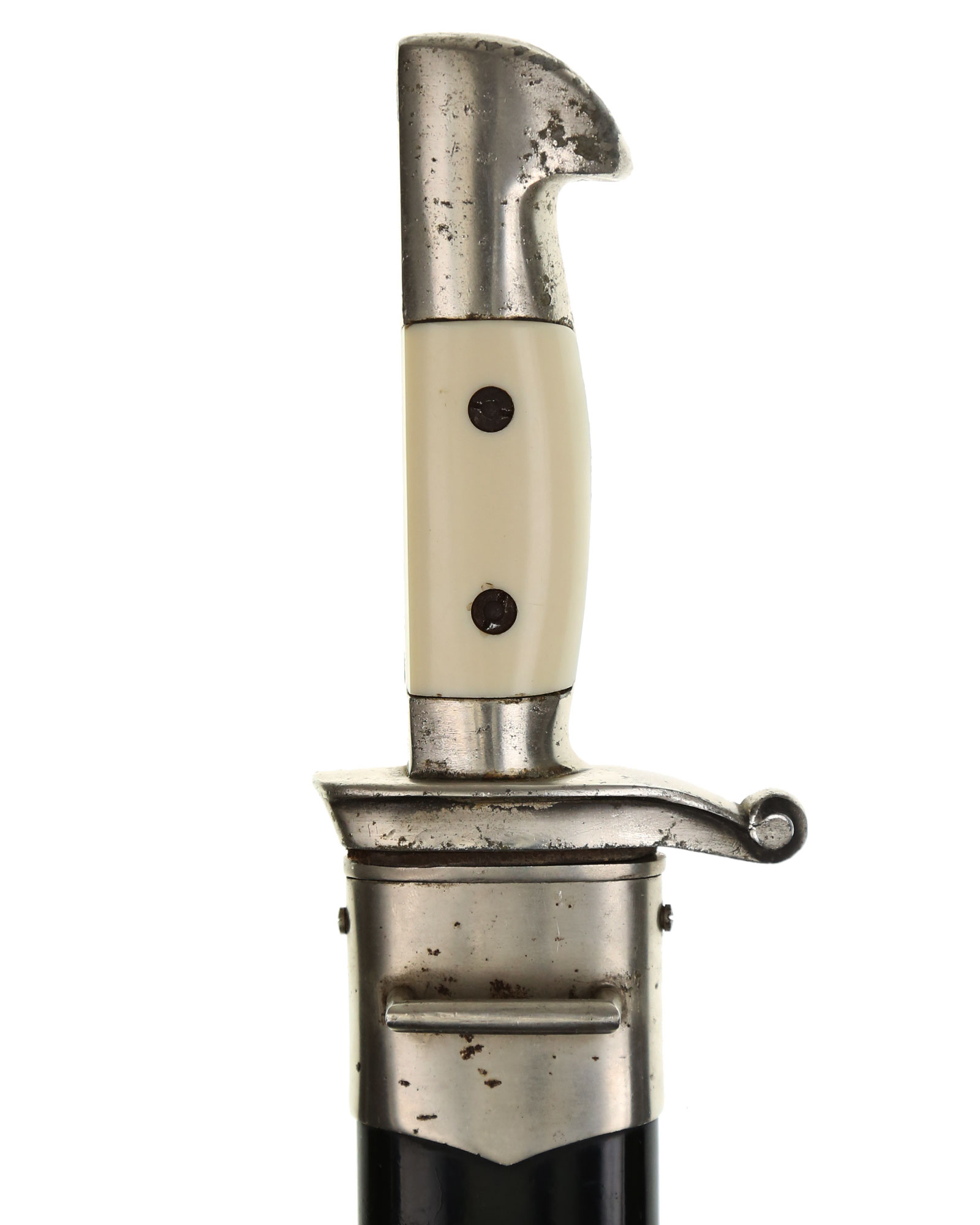Griff: Der Griff ist mit zwei Kunststoff-Griffschalen, diese werden durch zwei Schrauben festgehalten, die noch nie geöffnet wurden. Versilberung des Griffes ist zu 95% erhalten. Die Parierstange ist in Form eines Reichsadlers, der nach links schaut. Zum linken Ende hin wirbelt das Ende nach oben. In der Mitte befindet sich der Adler, der in seinen Krallen einen Kranz mit typischem TENO Zeichen und einen Hakenkreuz festhält.
