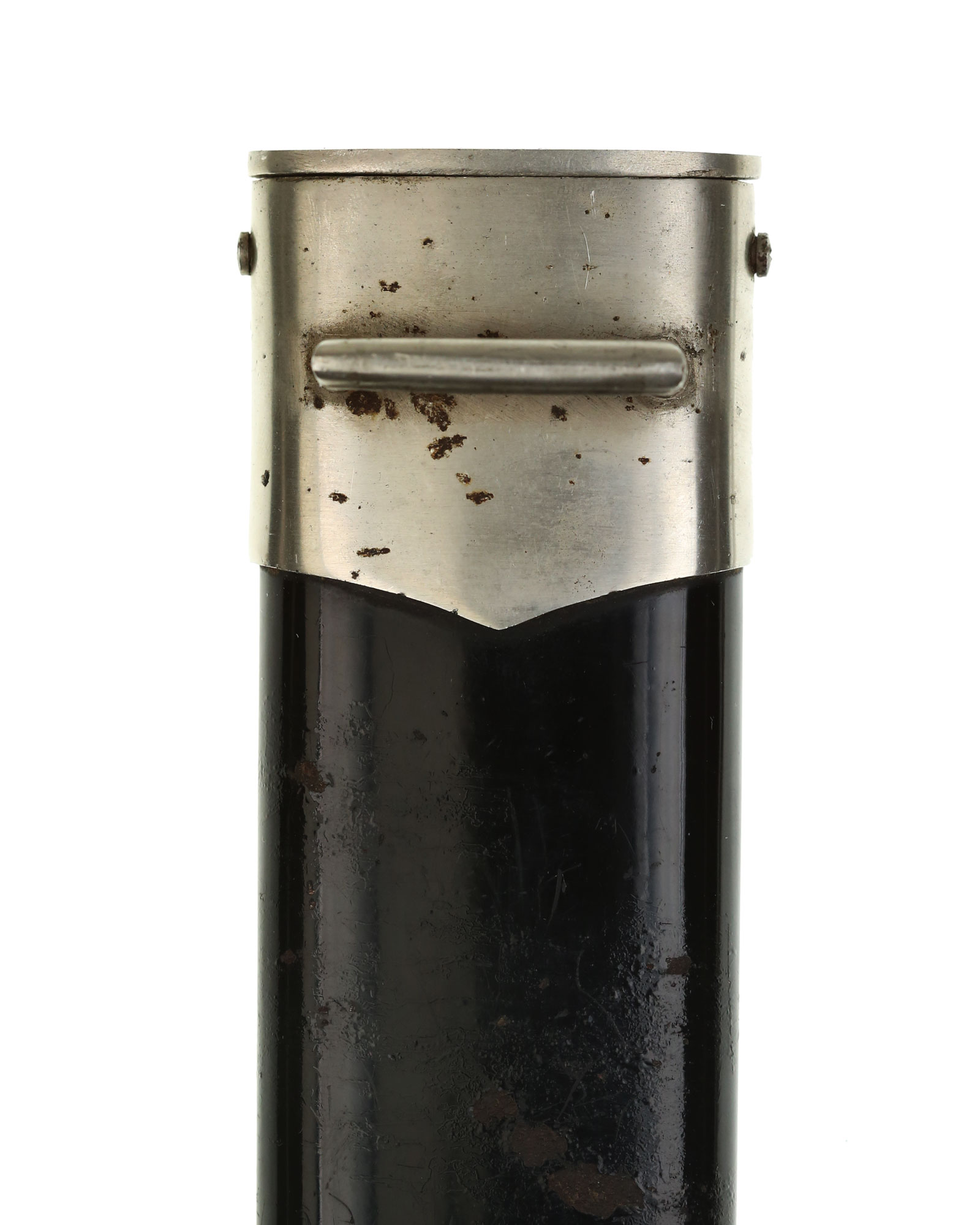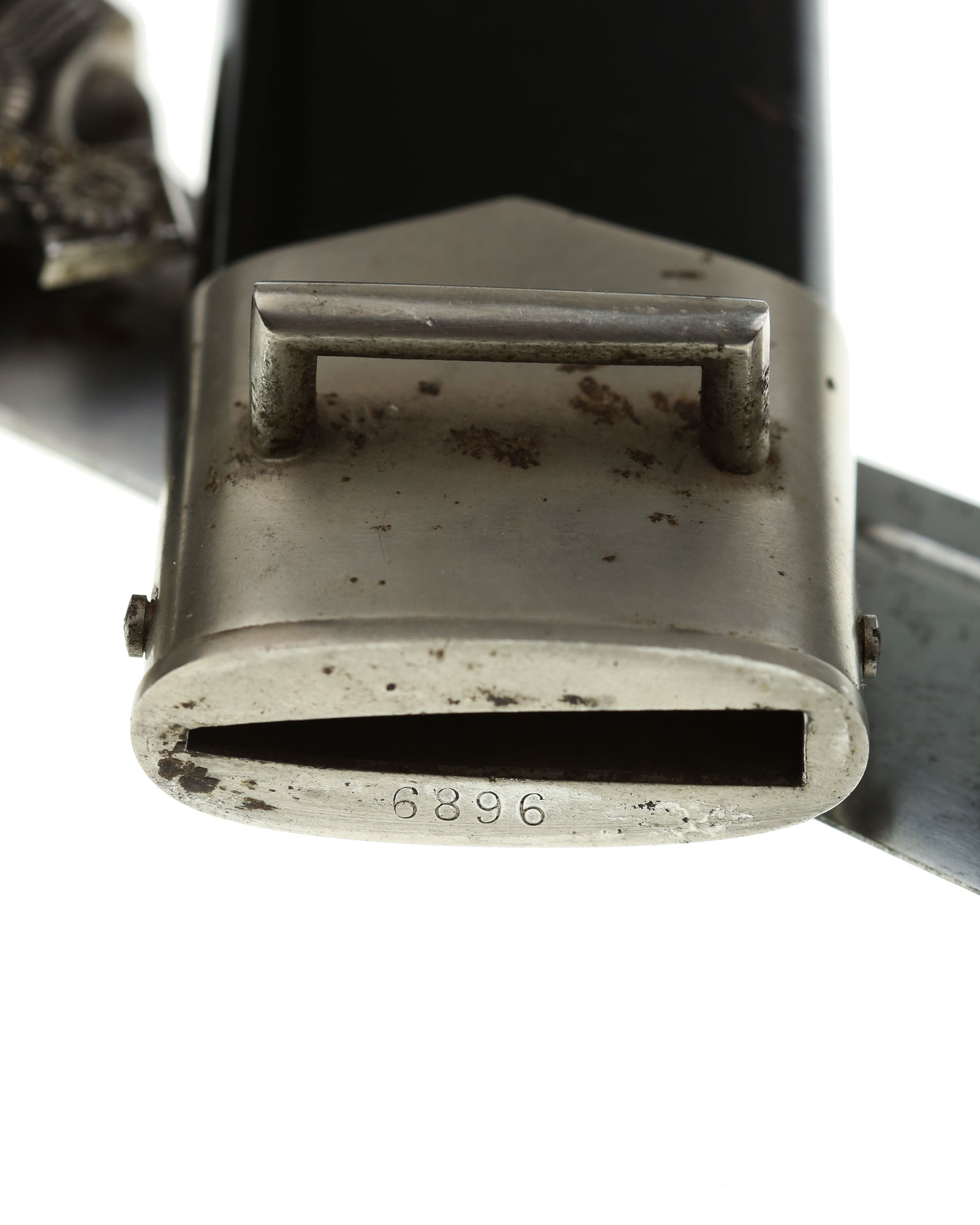 Scheide: Schwarz lackierte Stahlscheide mit 95% Originallack. Die Beschläge werden mit seitlich angebrachten Schrauben festgehalten. Am oberen Scheidenbeschlag befindet sich der Bügel auf der Rückseite, zum Einhängen des Tragehängers.