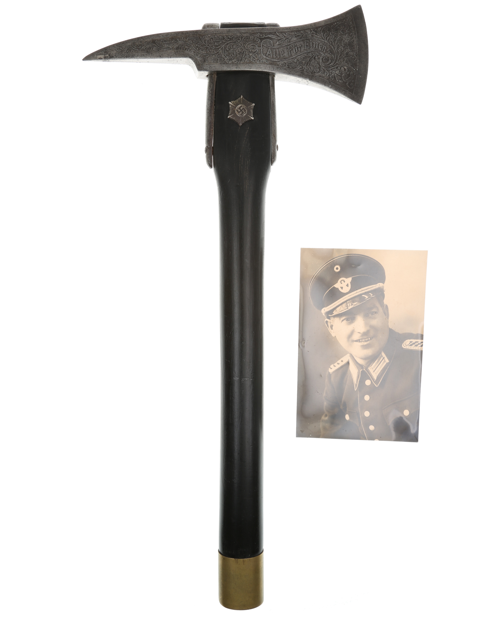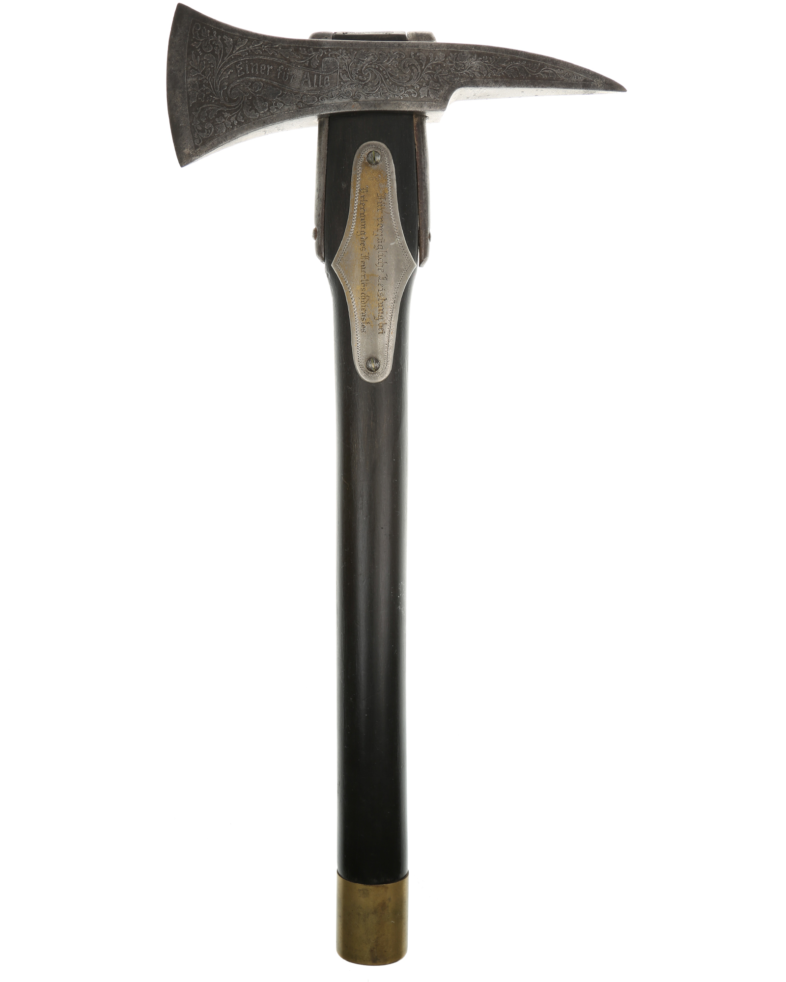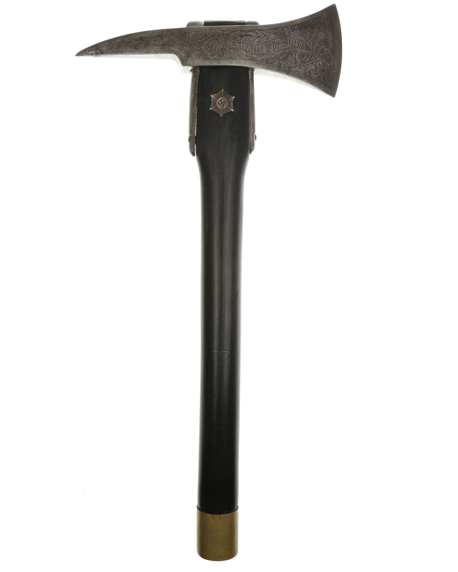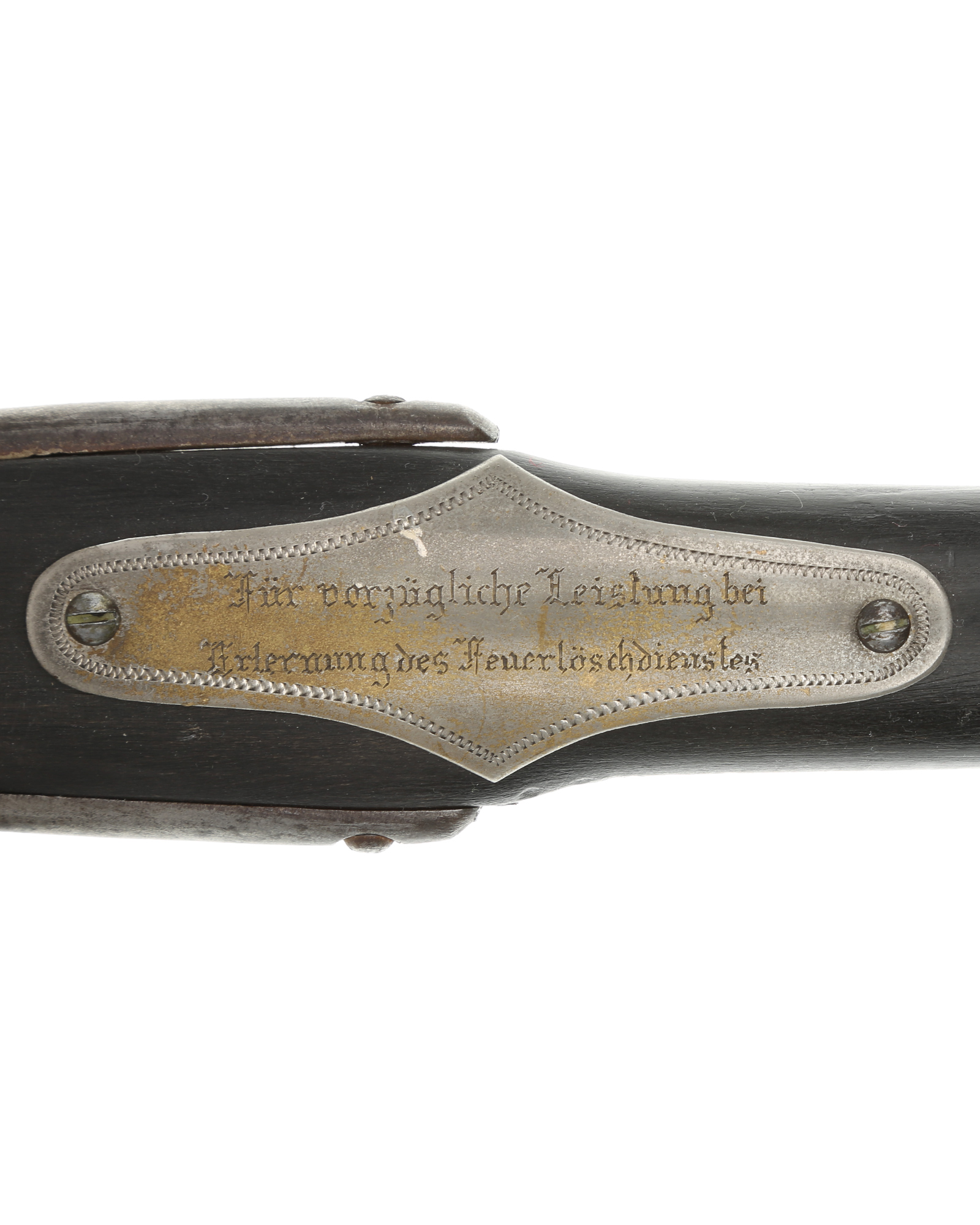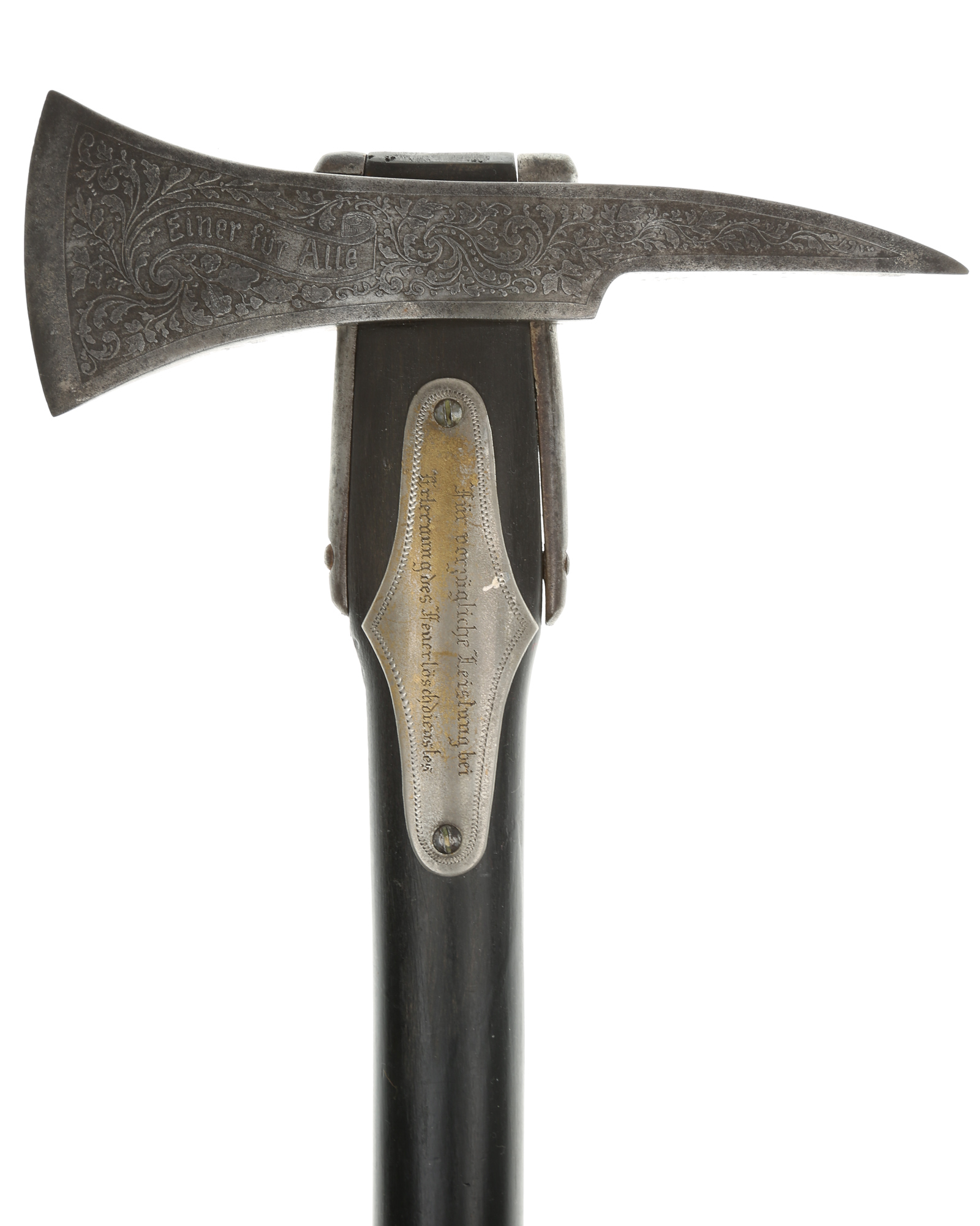 Seltene Variante eines Feuerwehr Ehrenbeils (Axt). Feinste Ziselierung. Schwarzer Schaft aus Ebenholz. Auf der Vorderseite ist im oberen Bereich ein Sonnenrad-Emblem aufgelegt. Auf der Rückseite eine versilberte Platte mit der Inschrift: Für vorzügliche Leistung bei Erlernung des Feuerlösch-Dienstes. Auf dem Beil steht noch der Spruch: Einer für Alle, Alle für Einen. Versilberte Nickelausführung. Axtblatt mit zahlreichen verschiedenen Ätzdekoren. Angebrachtes Widmungsschild. Seltene Feuerwehr-Ehrenaxt mit Trägerfoto.