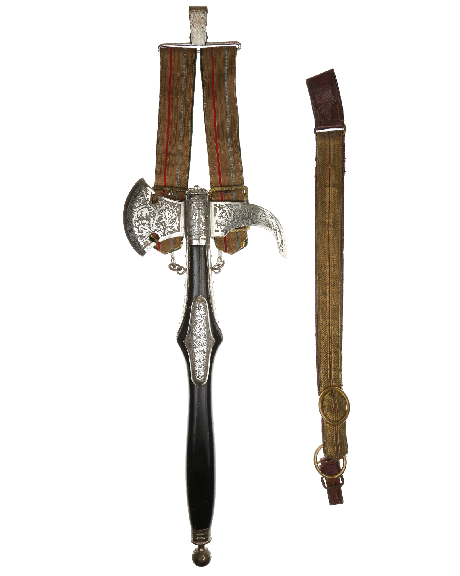 Vernickelte, beidseitig reich mit Feuerwehrsymbolen und Blattwerk verzierte Klinge. Schwarzer Holzschaft mit seitlich angebrachten Trageringen. Sehr seltenes zweiteiliges Gehänge mit Unterschnallgurt. Gesamtlänge 45,3 cm.