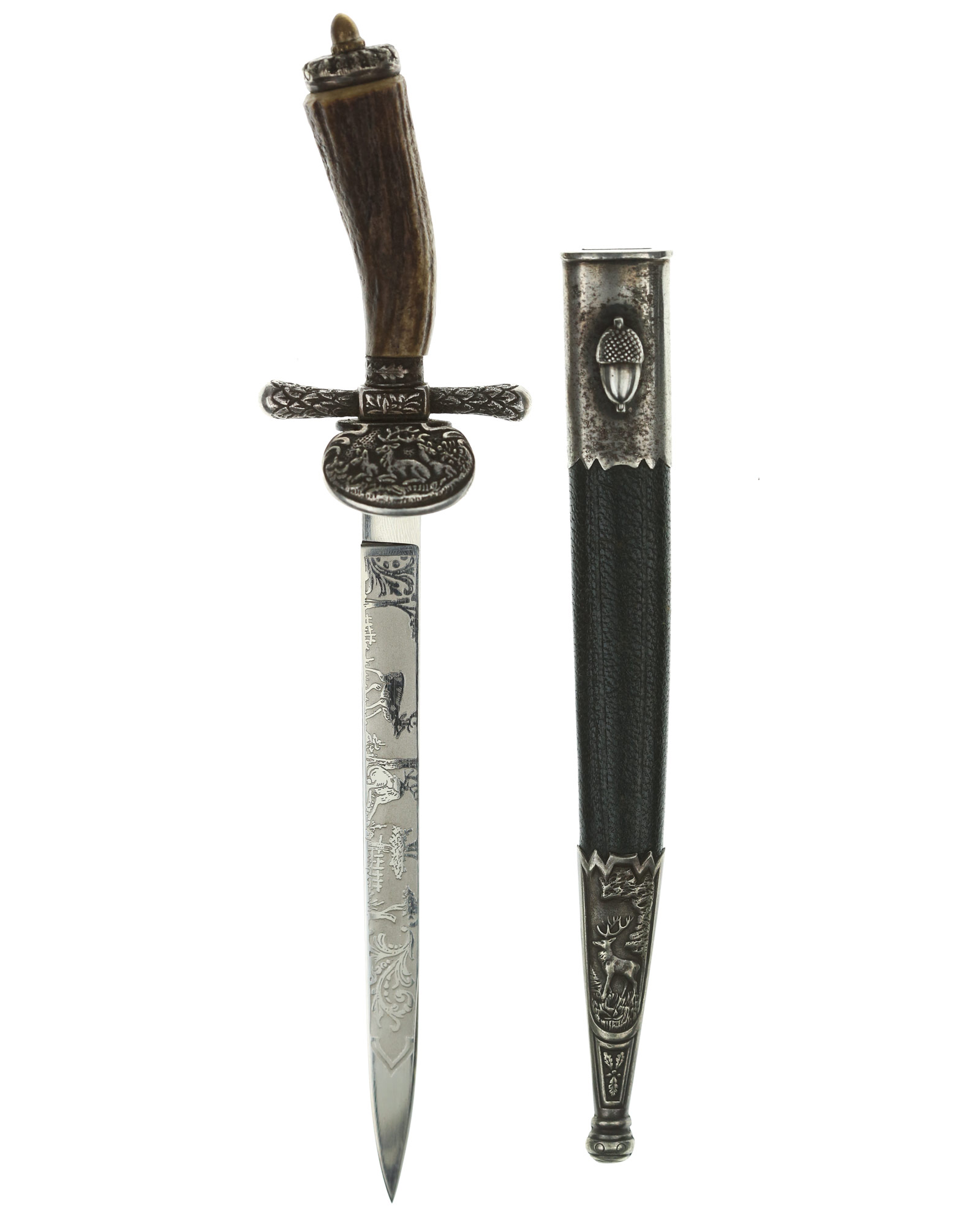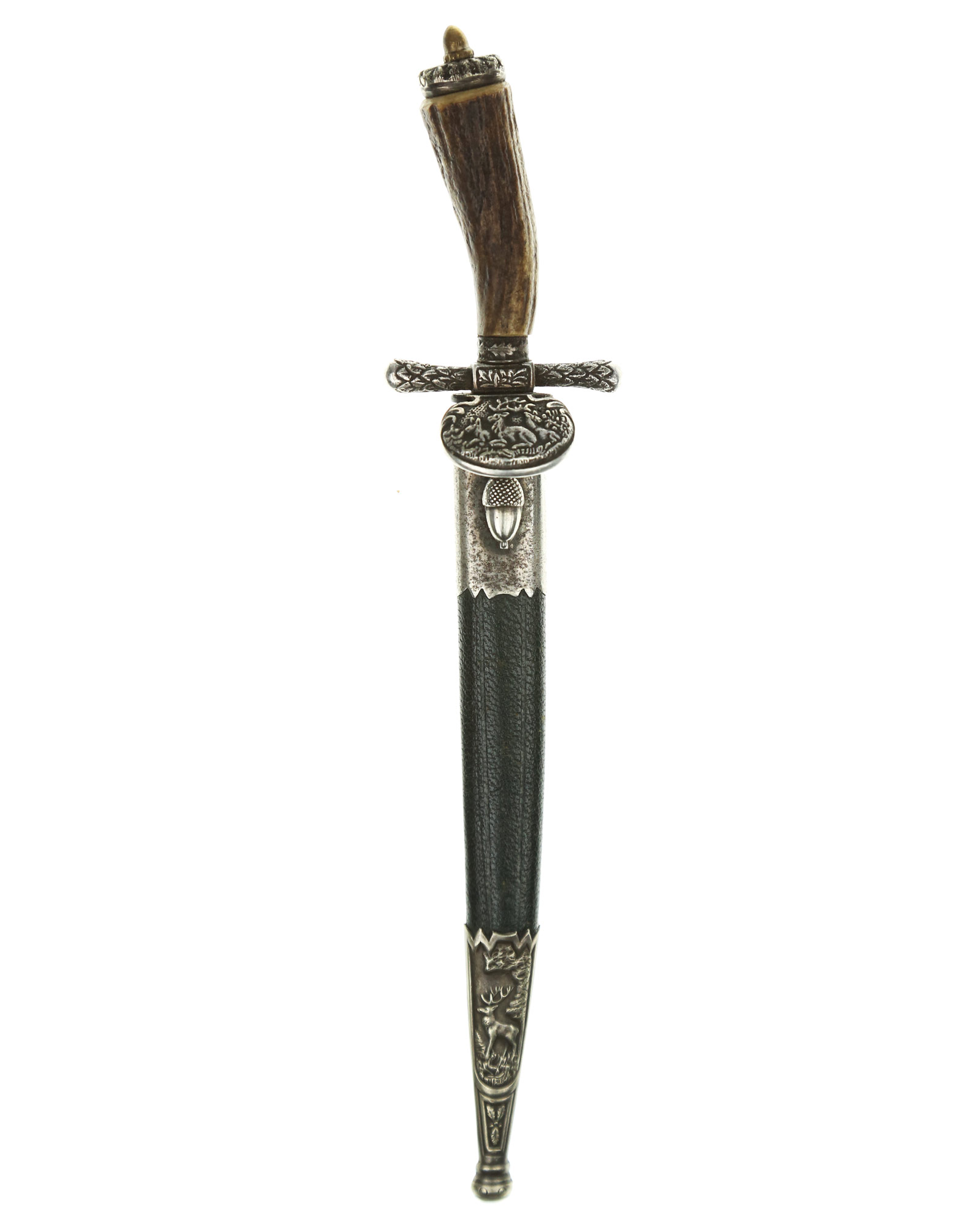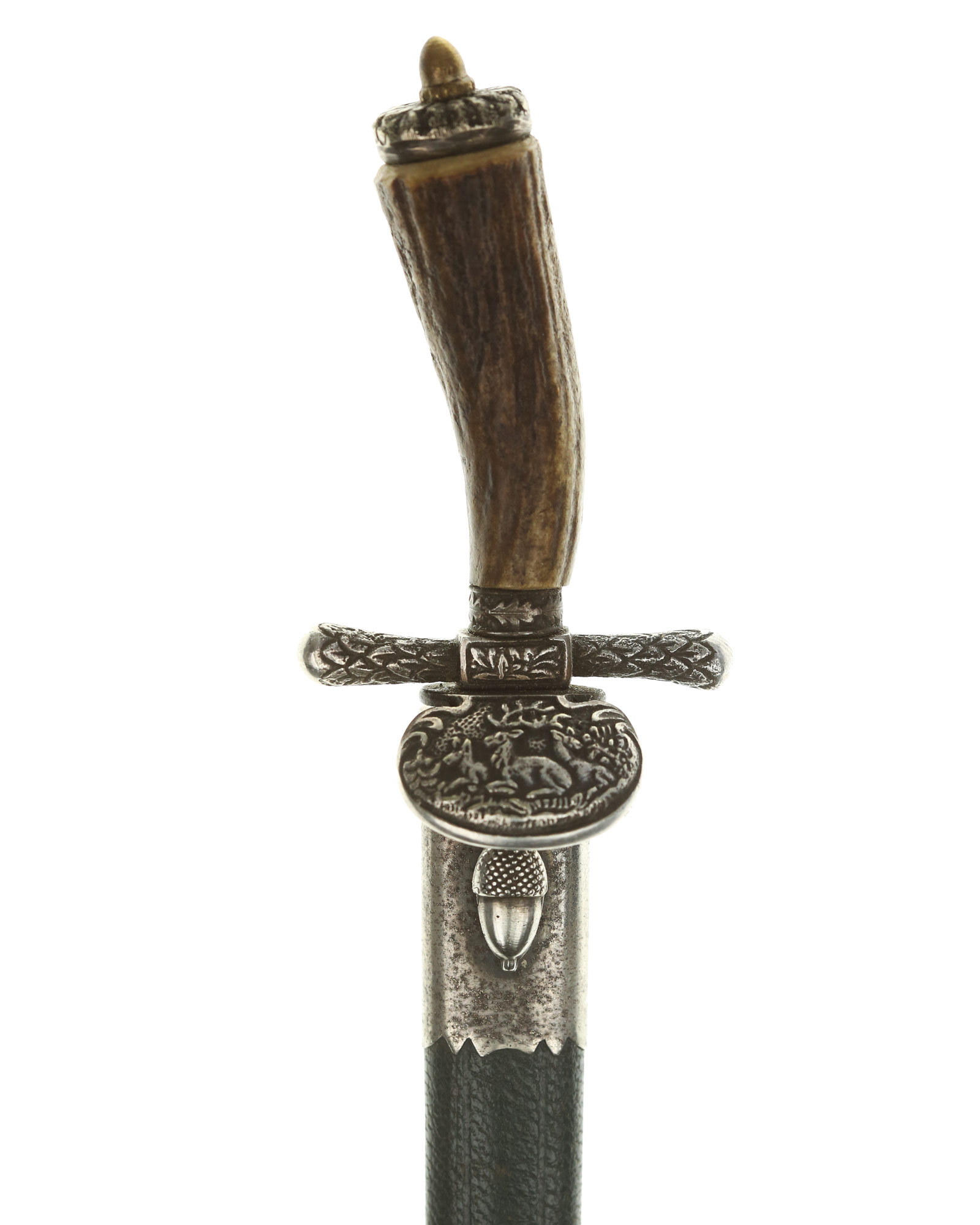 Seltene Ausführung eines Hirschfänger in Miniatur. Die Klinge ist einschneidig und beidseitig mit Jagdmotiven geätzt. Der Griff besteht aus Hirschhorn.