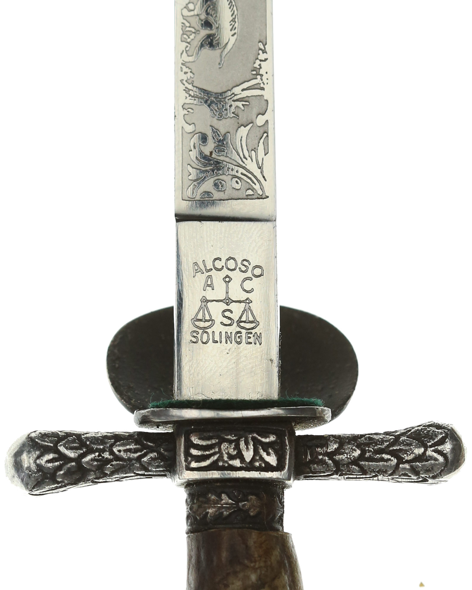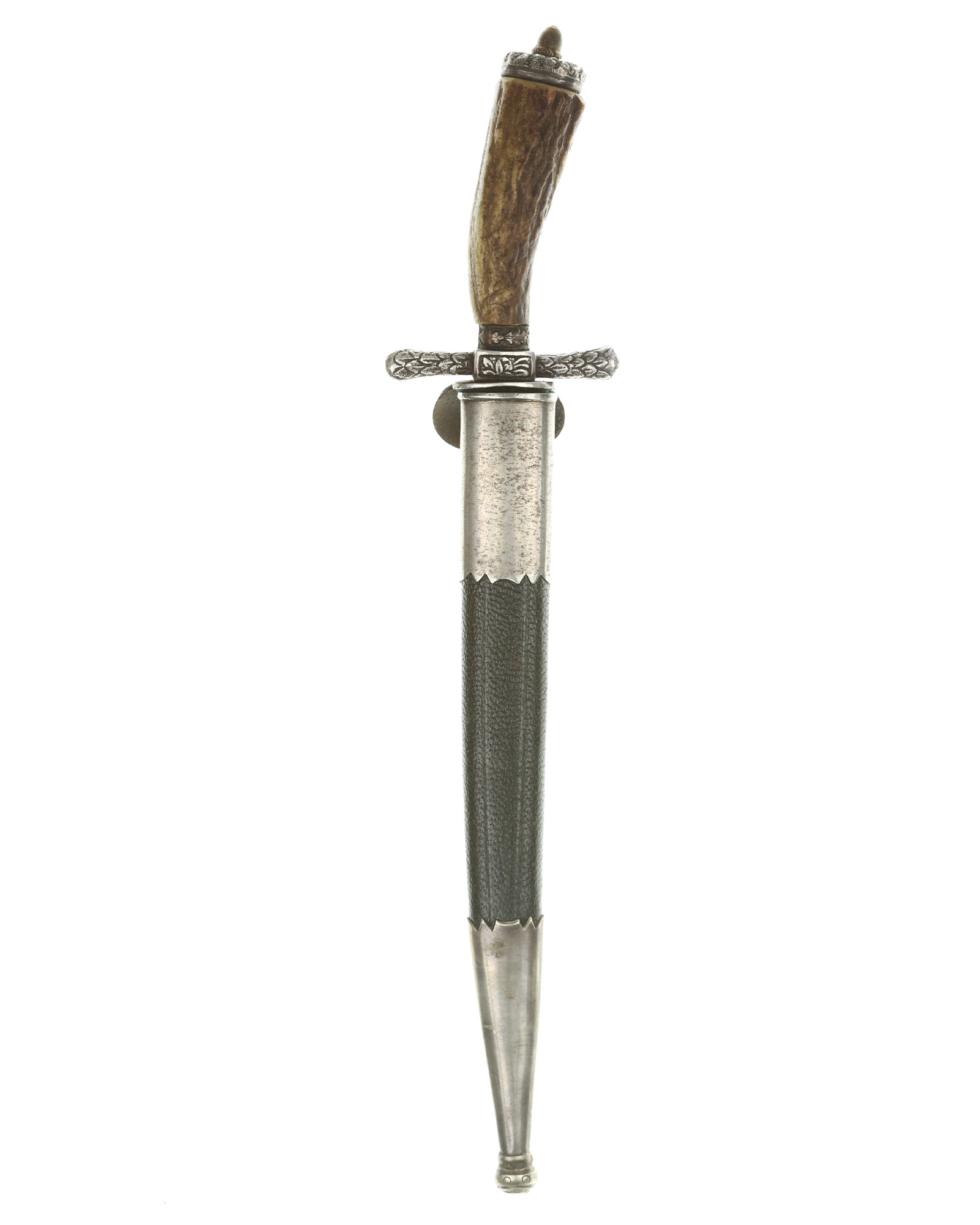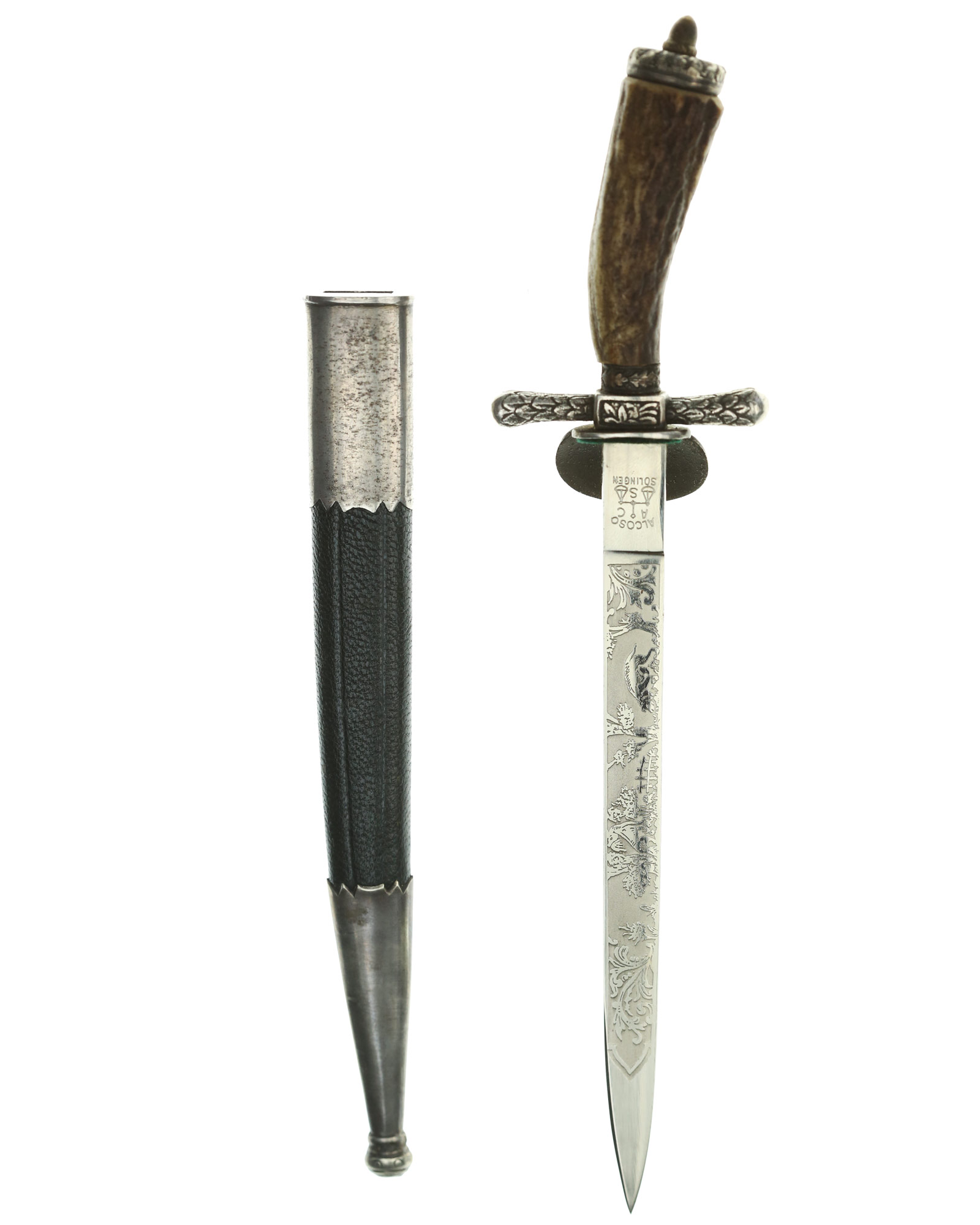 Seltene Ausführung eines Hirschfänger in Miniatur. Die Klinge ist einschneidig und beidseitig mit Jagdmotiven geätzt. Der Griff besteht aus Hirschhorn.