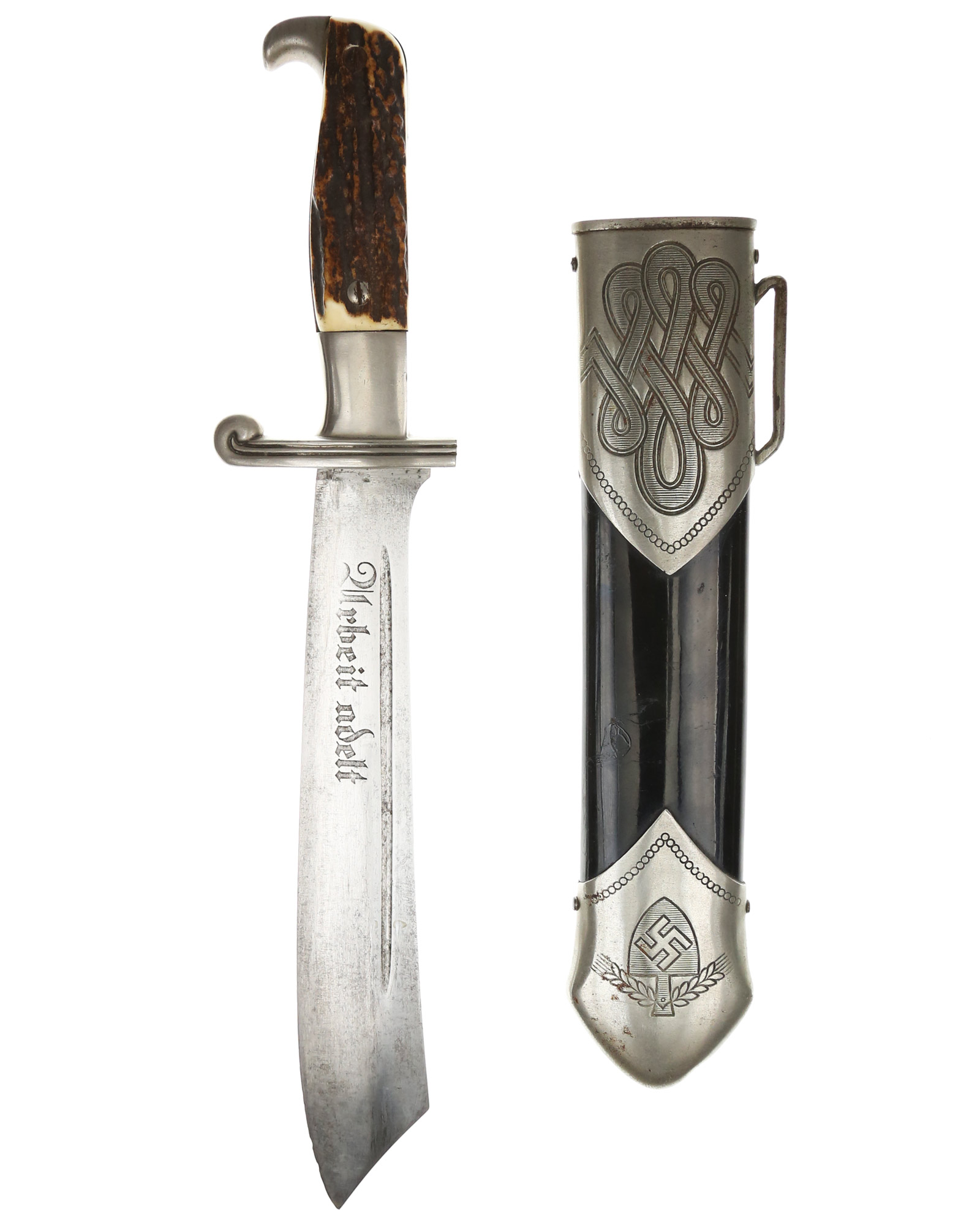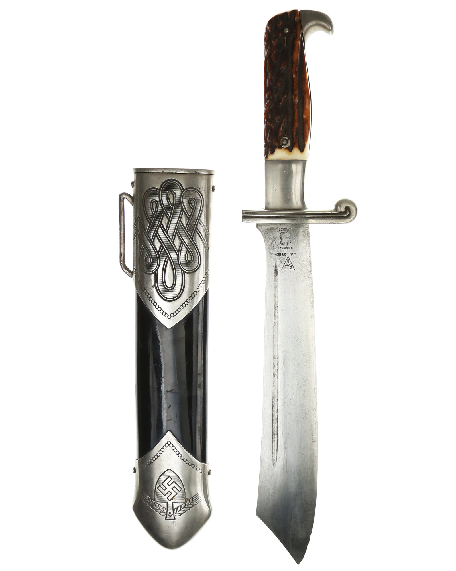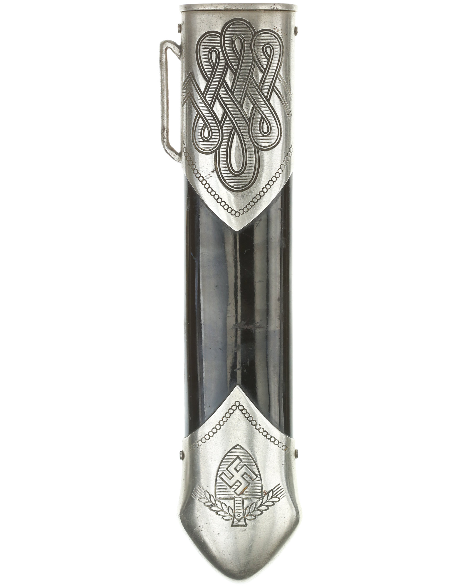 Scheide: Schwarz lackierte Stahlscheide mit 100% Originallack. Die Beschläge werden mit seitlich angebrachten Schrauben festgehalten. Der untere Beschlag ist mit dem Symbol des Reichsarbeitsdienstes und am oberen Scheidenbeschlag befindet sich der Bügel zum Einhängen des Tragehängers.