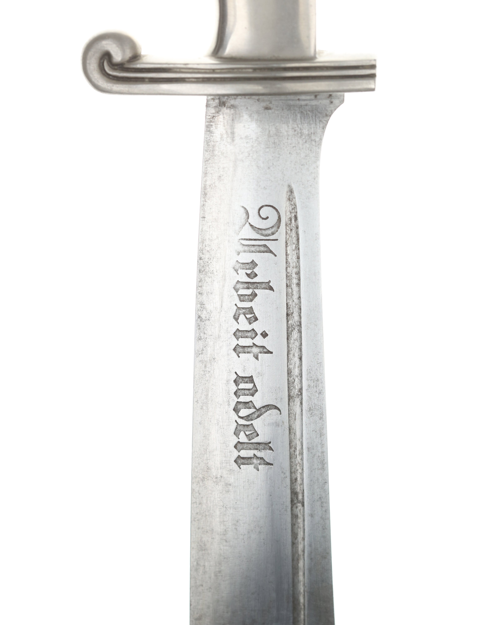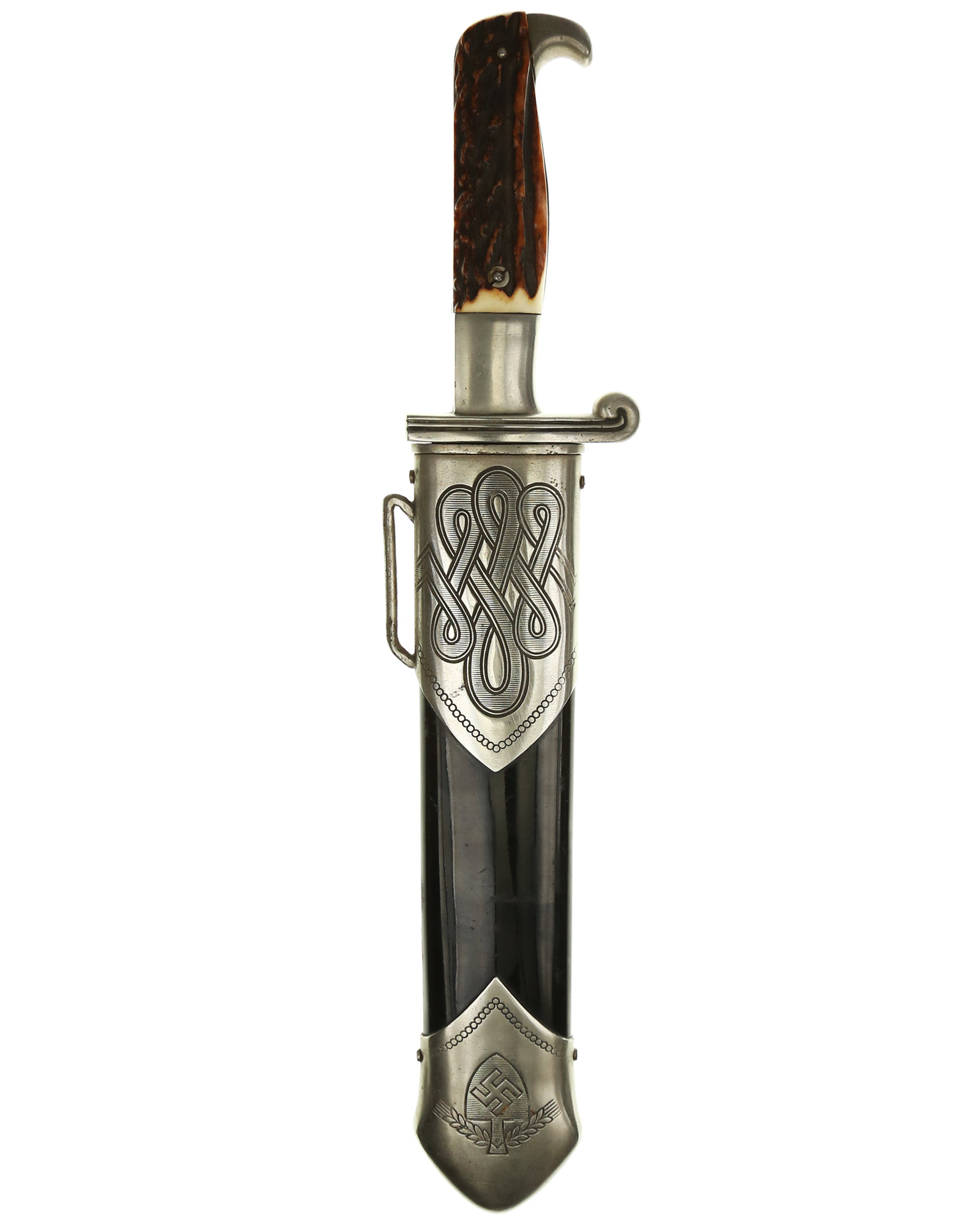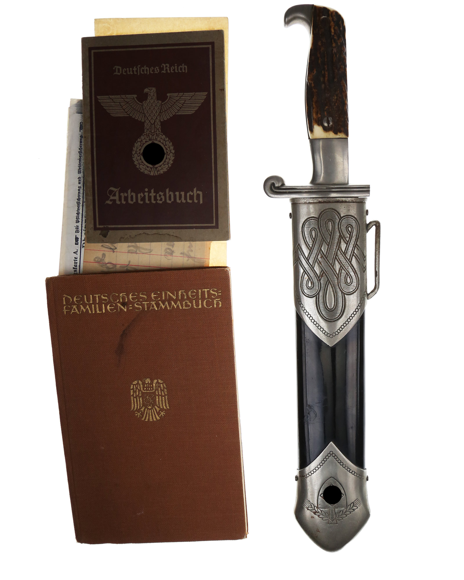 Scheide: Schwarz lackierte Stahlscheide mit 100% Originallack. Die Beschläge werden mit seitlich angebrachten Schrauben festgehalten. Der untere Beschlag ist mit dem Symbol des Reichsarbeitsdienstes und am oberen Scheidenbeschlag befindet sich der Bügel zum Einhängen des Tragehängers.