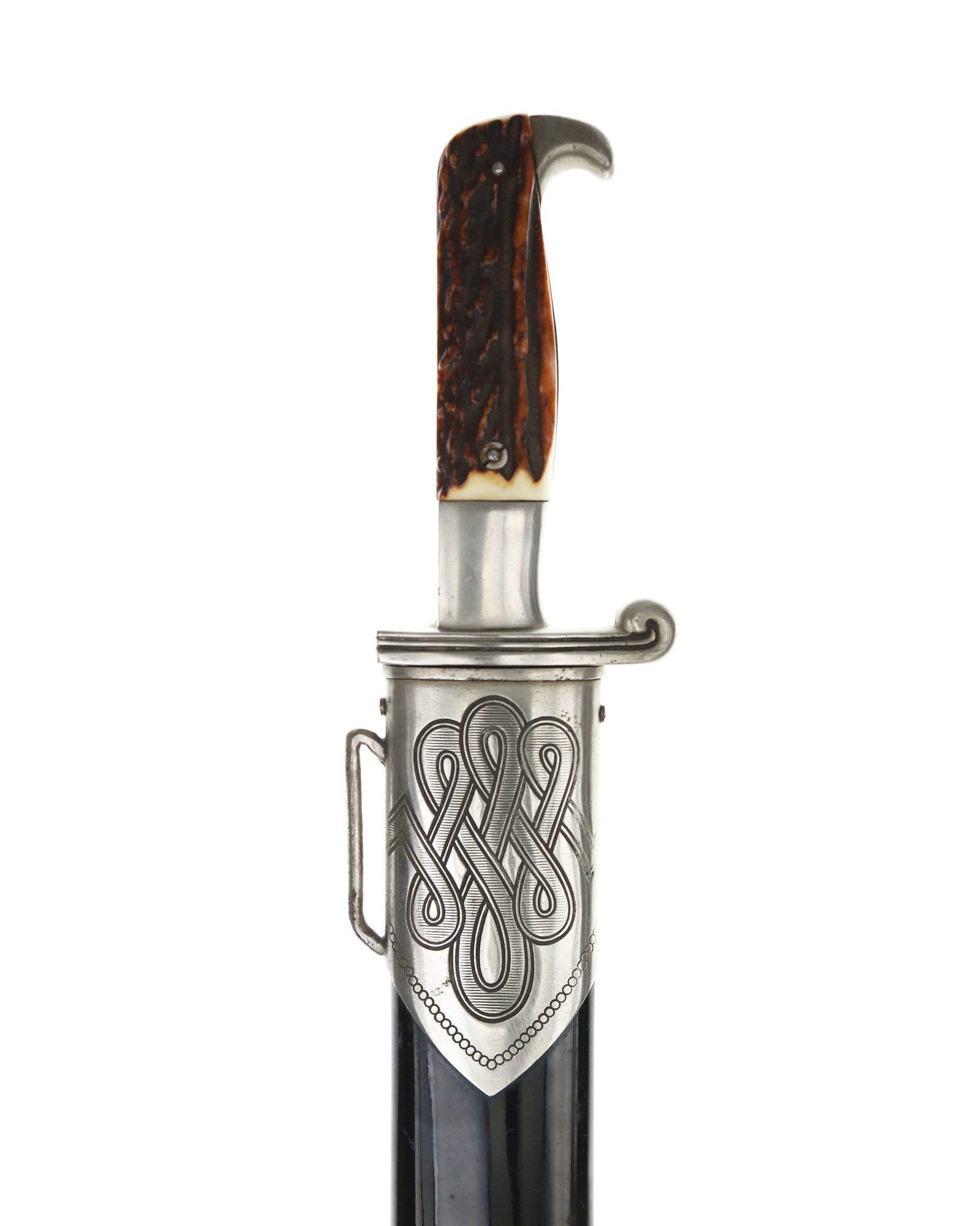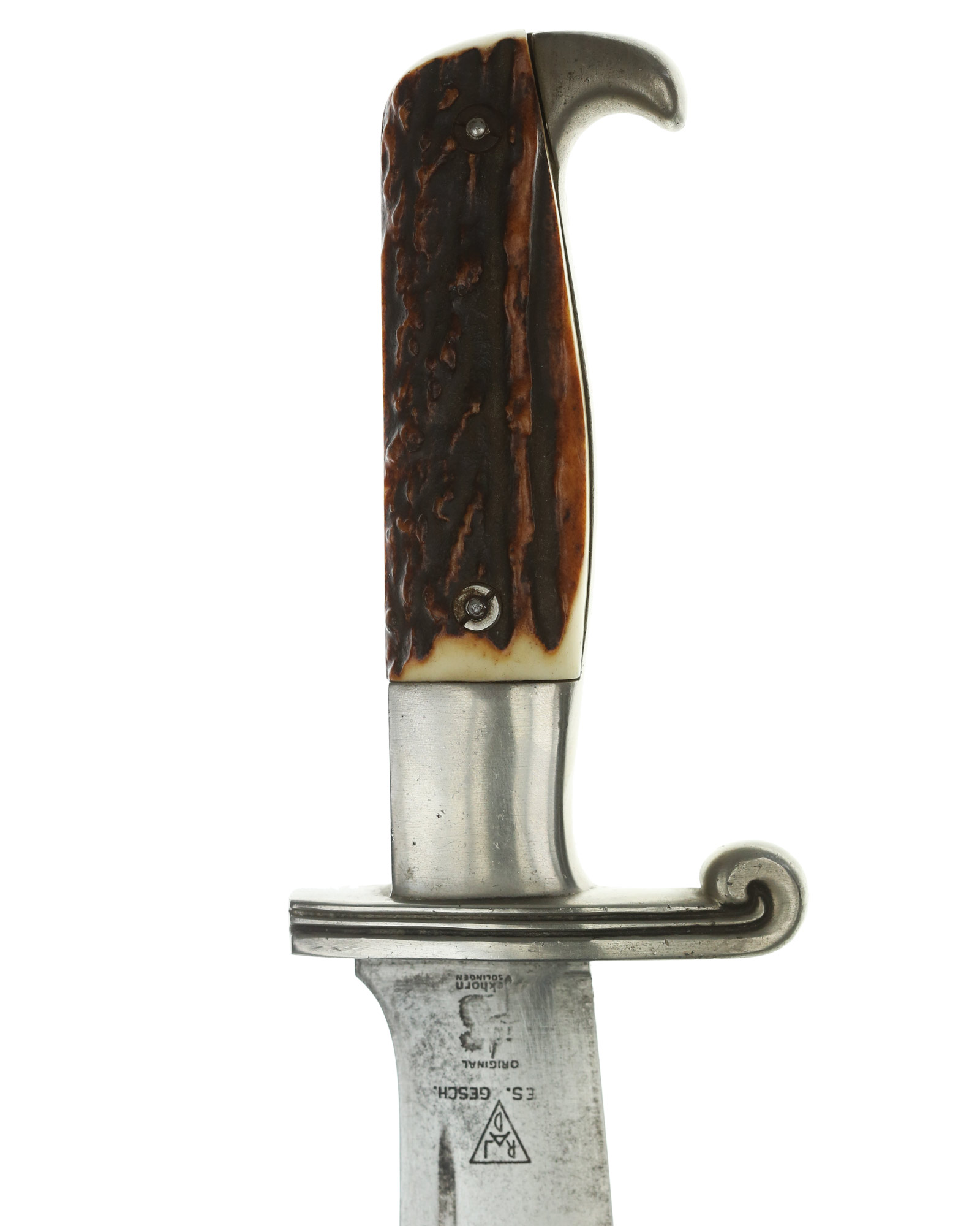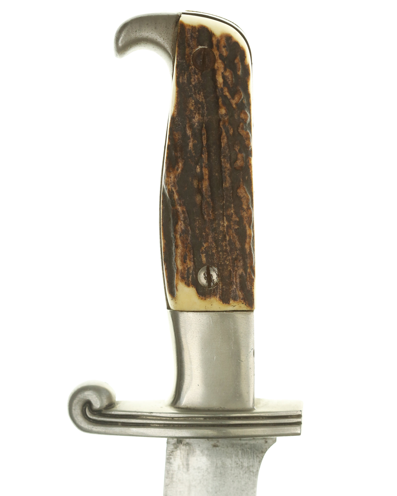 Griff: Der Griff ist mit zwei Hirschhorn-Griffschalen, diese werden durch zwei Schrauben festgehalten. Der Griff hat die Form eines Adlers, der Schnabel ist in Richtung der Klingenseite gerichtet. Die Parierstange ist flach und mit zwei Längsrillen.