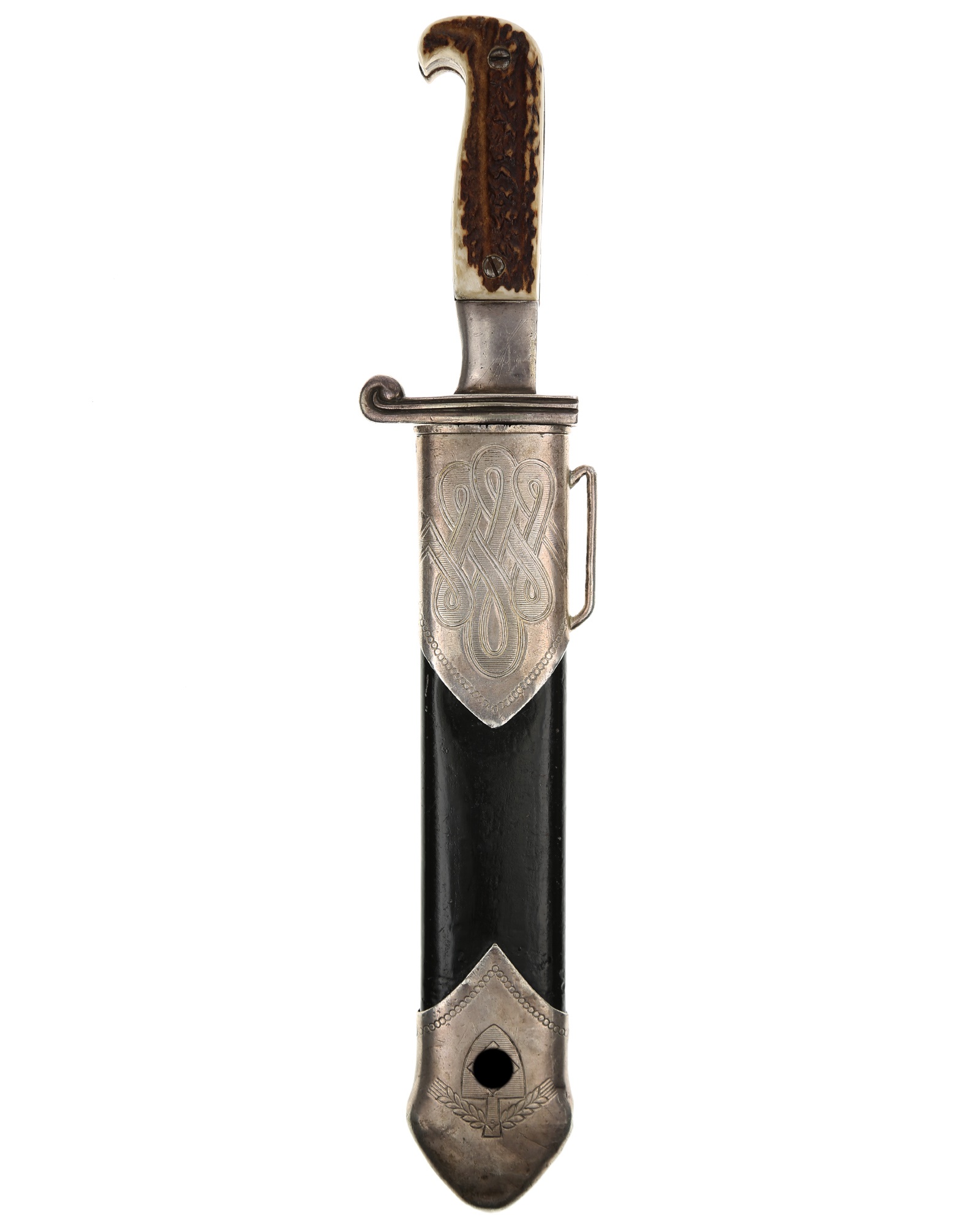 RAD Haumesser für Unterführer - Modell 1934. Seltenes Modell mit Vollhorn-Griffschalen, die geschraubt sind. Versilberte Nickelausführung. Die Scheide ist schwarz lackiert. Die Beschläge sind versilbert. Der untere Beschlag ist mit dem Symbol des Reichsarbeitsdienst und am oberen Scheidenbeschlag befindet sich der Bügel zum Einhängen des Tragehängers. Beide Scheidenbeschläge sind ohne Schrauben. Klinge mit der Klingeninschrift «Arbeit adelt». Auf der Rückseite befindet sich die RJAD Abnahme und der Hersteller Eickhorn, Solingen, unterhalb von GES. GESCH. Vollhornschalen oder auch "Full Stag" Rad Hauer wurde ausschließlich von Eickhorn angefertigt.