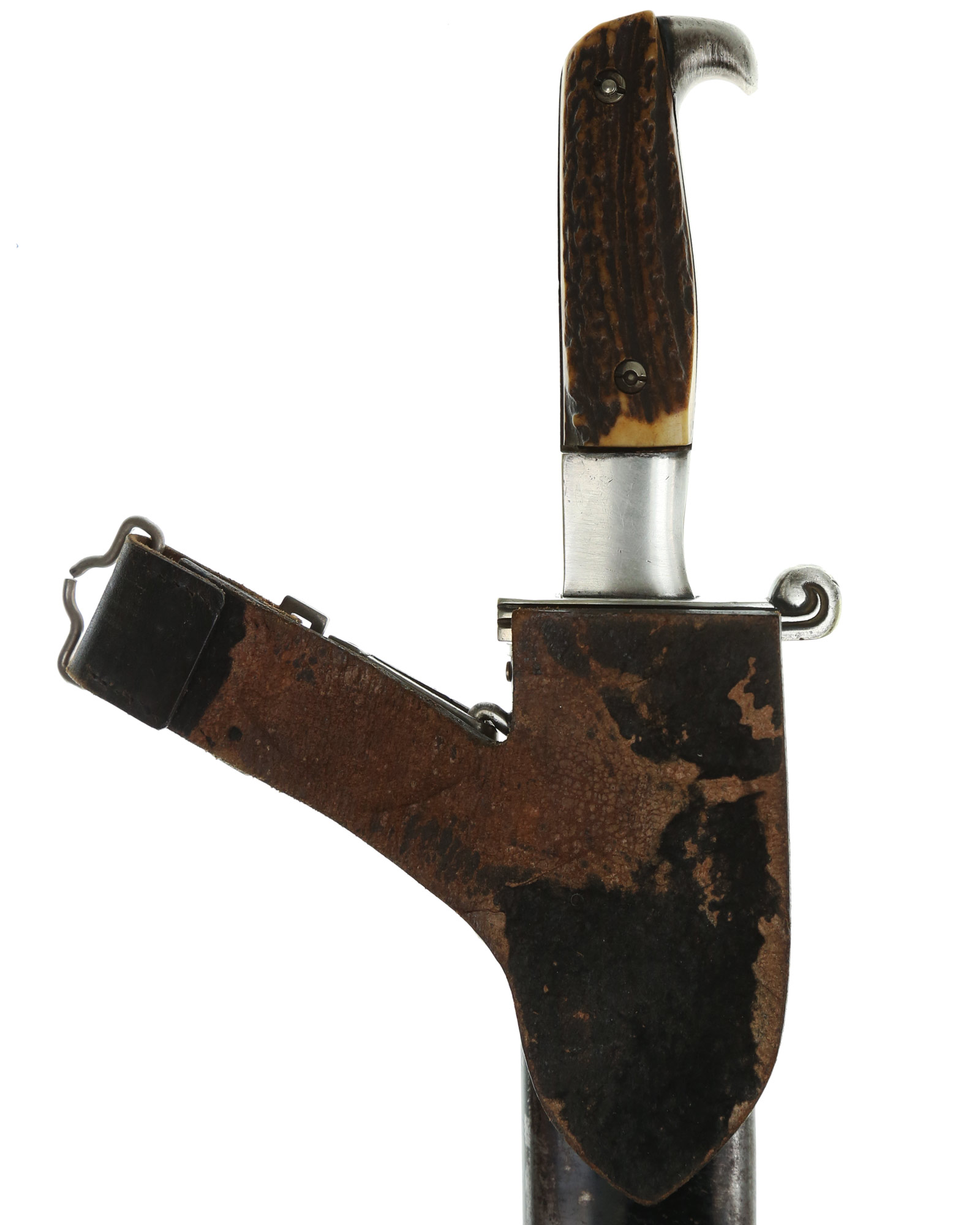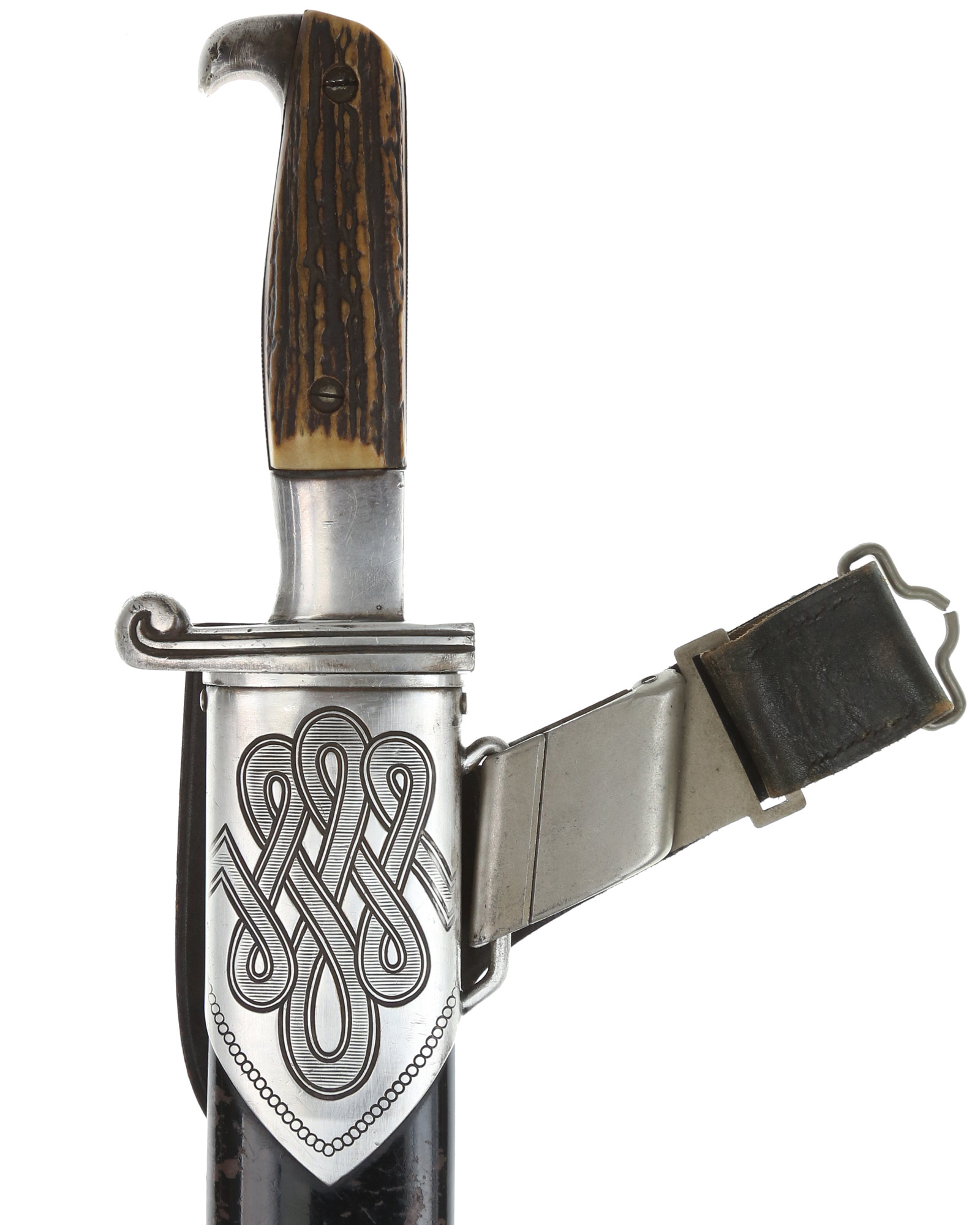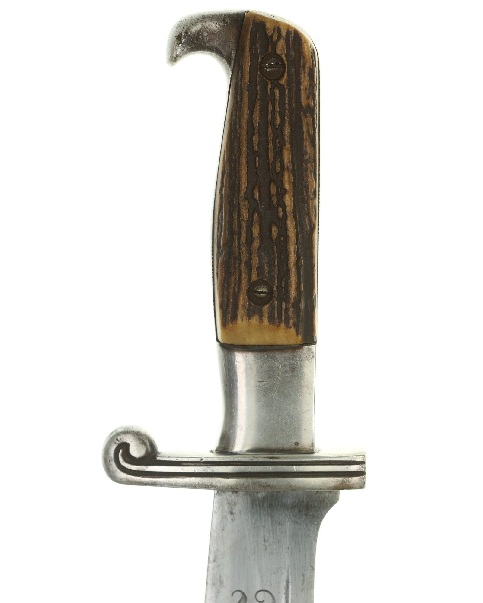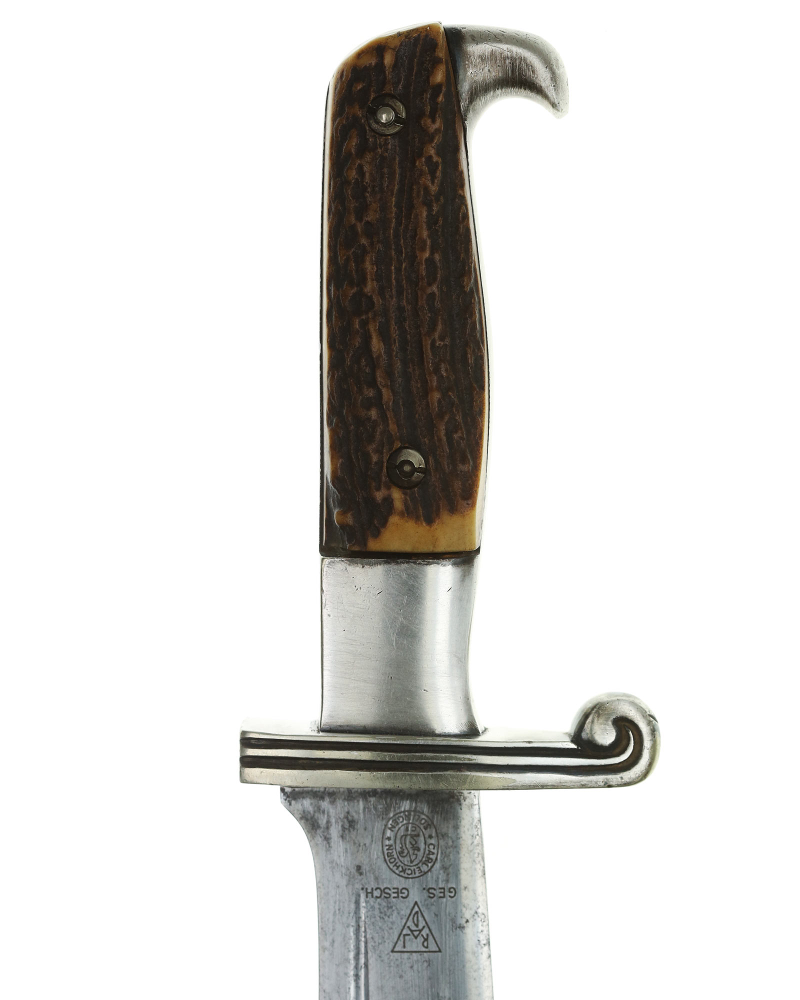 Griff: Der Griff ist mit zwei Hirschhorn-Griffschalen, diese werden durch zwei Schrauben festgehalten. Der Griff hat die Form eines Adlers, der Schnabel ist in Richtung der Klingenseite gerichtet. Die Parierstange ist flach und mit zwei Längsrillen.