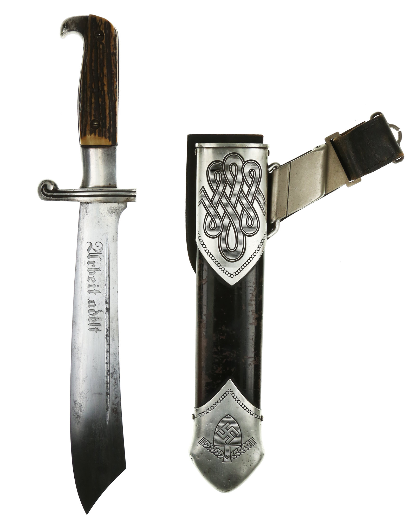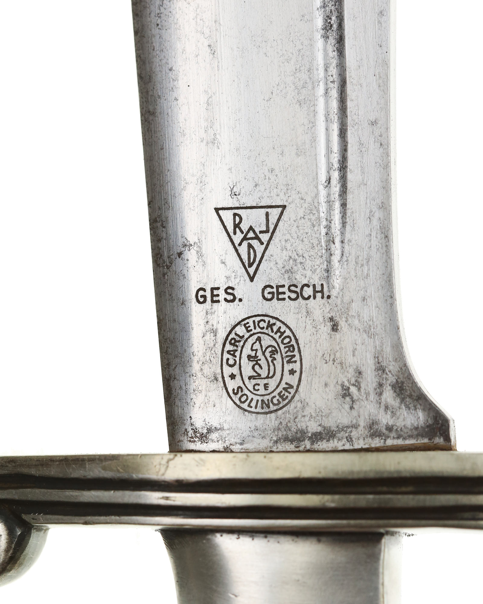 Klinge: Die Klinge ist einschneidig, leicht gebogen und vernickelt. die Rückenseite der Klinge ist komplett stumpf. Auf der Vorderseite befindet sich die RAD Devisenätzung in gotischer Schrift: Arbeit adelt. Auf der Rückseite befindet sich das frühe Eickhorn Logo. Carl Eickhorn Solingen, in der Mitte ein des Kreises ist ein Eichhörnchen abgebildetg mit C.E Initialien.