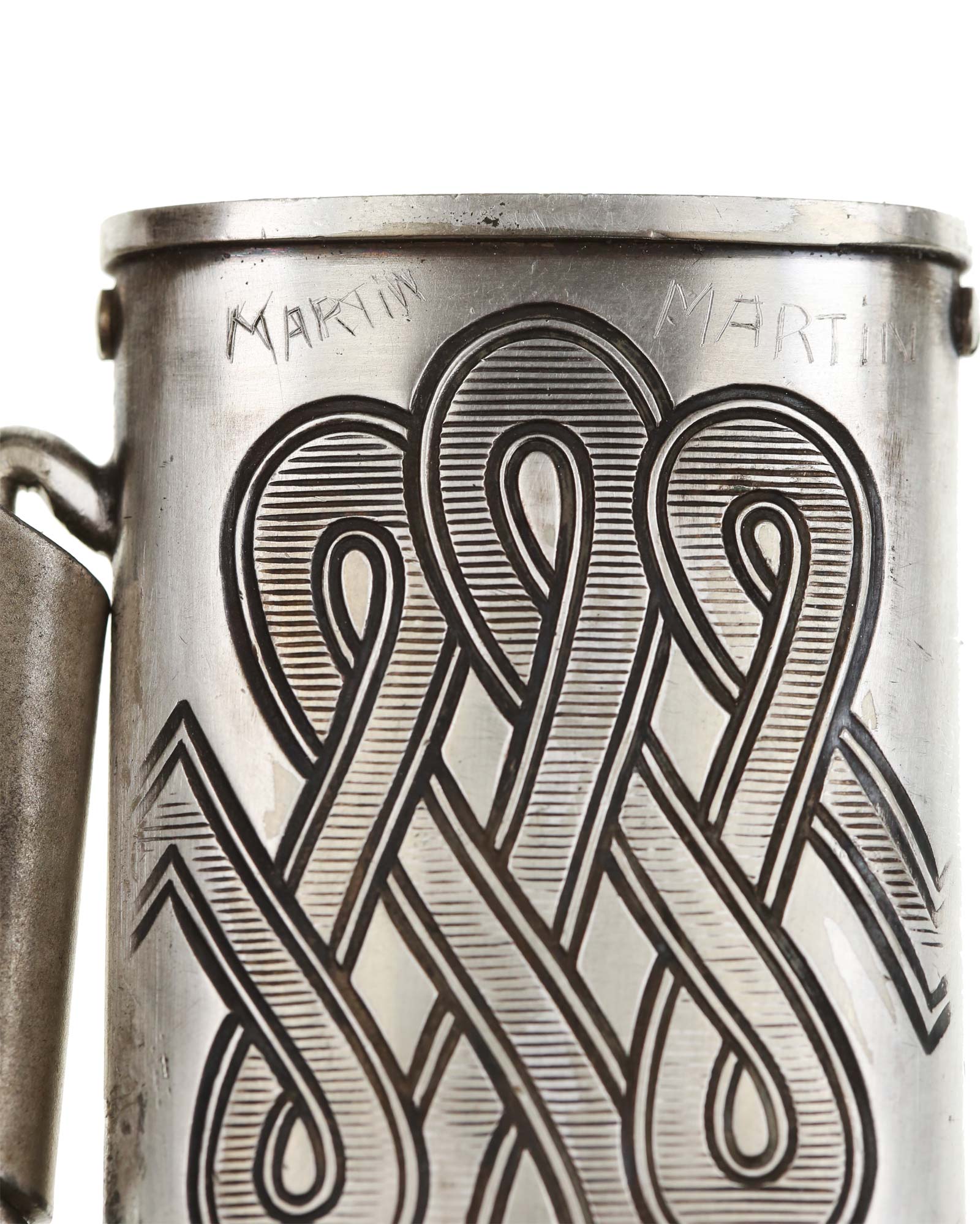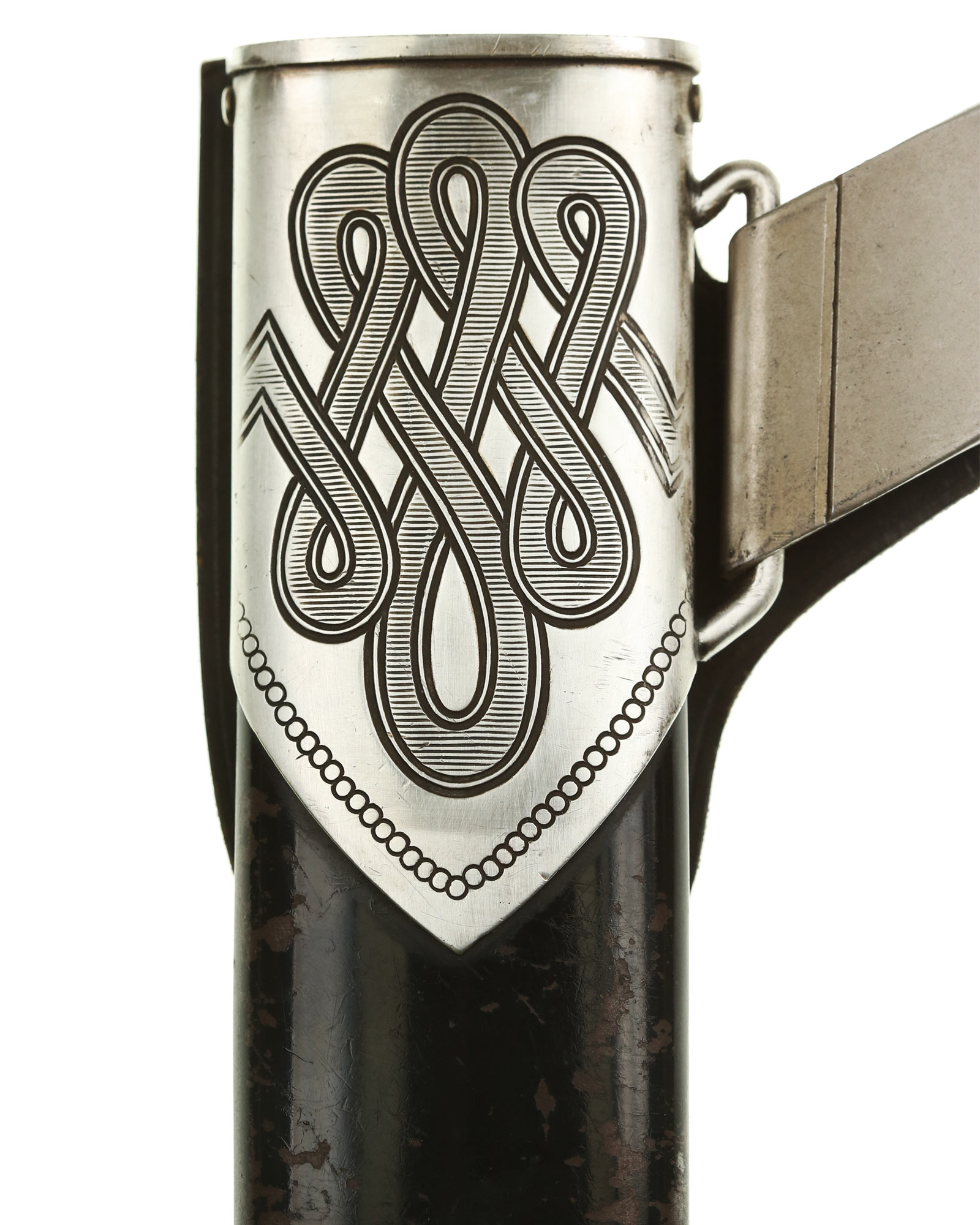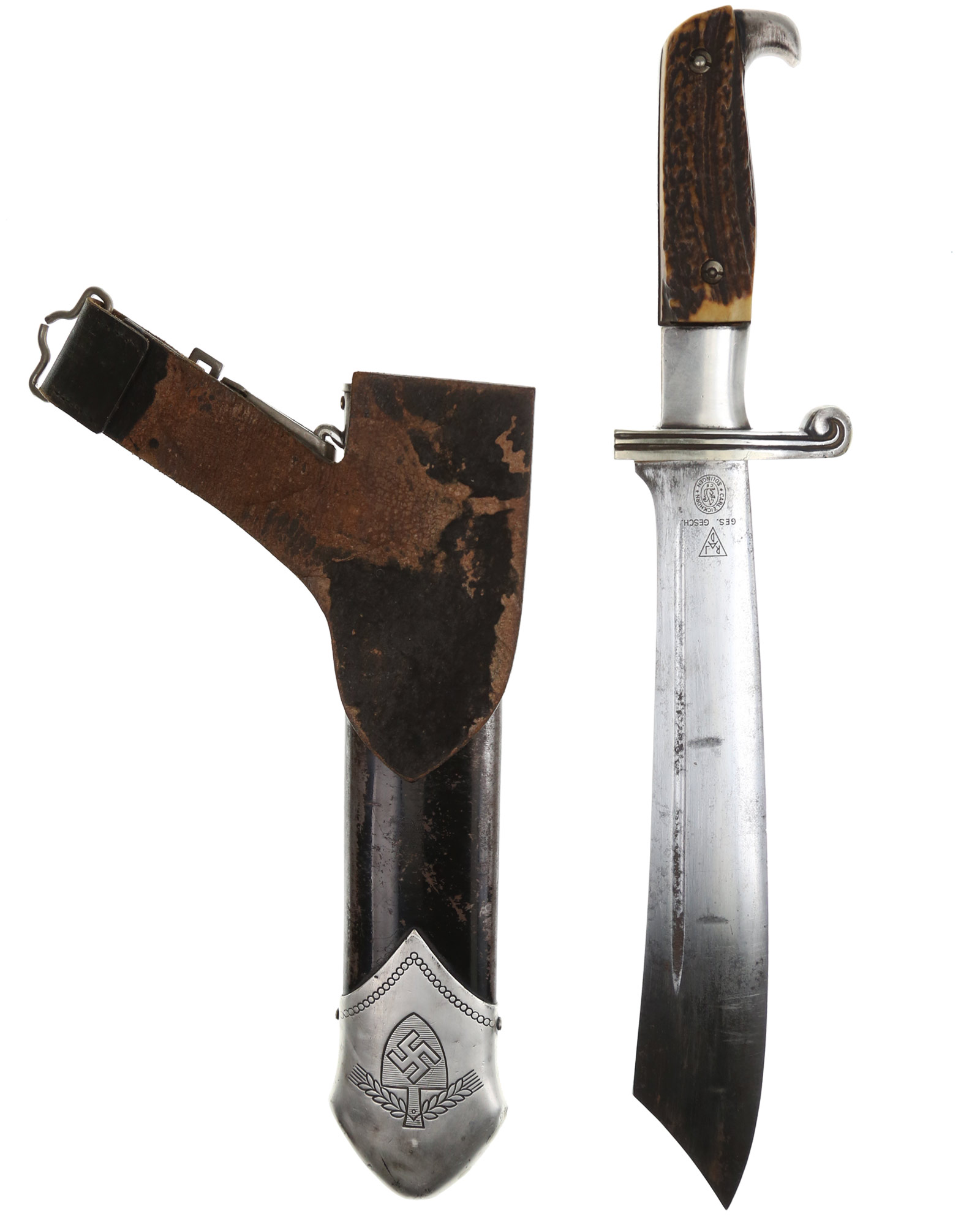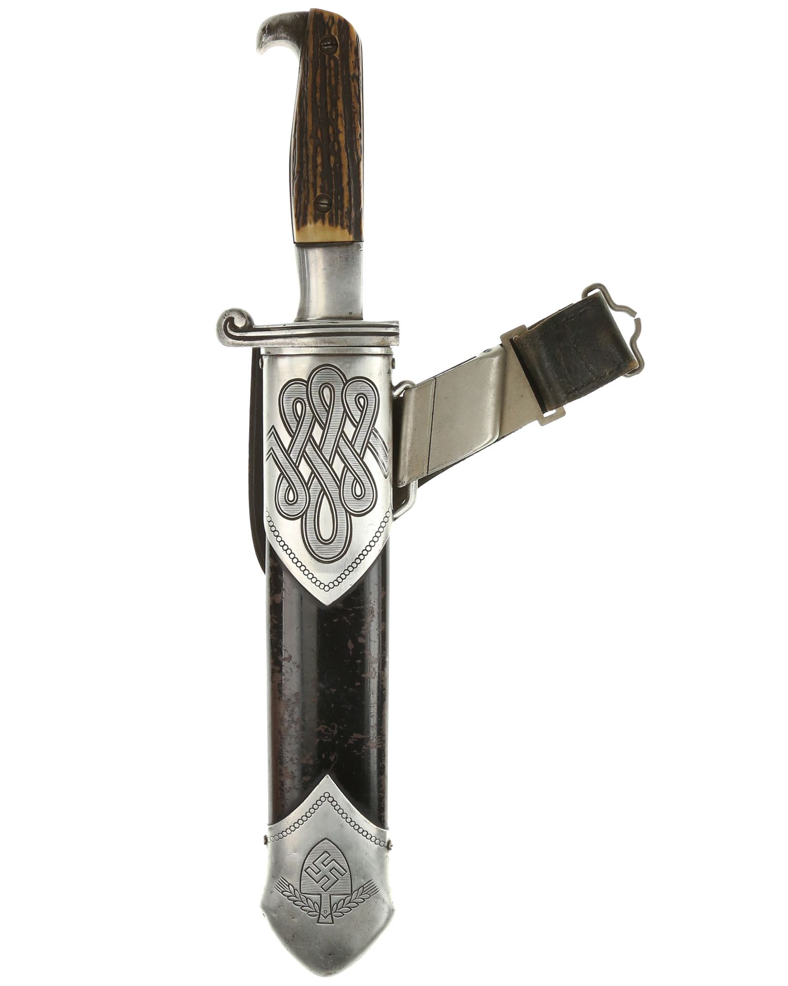 Scheide: Schwarz lackierte Stahlscheide mit Originallack. Die Beschläge werden mit seitlich angebrachten Schrauben festgehalten. Der untere Beschlag ist mit dem Symbol des Reichsarbeitsdienstes und am oberen Scheidenbeschlag befindet sich der Bügel zum Einhängen des Tragehängers. Auf der Rückseite des oberen Beschlags ist der Name "Martin" reingekratzt. Der RAD Hauer kommt zusammen mit dazugehörigem Leder-Gehänge. Der Karabinerhaken ist mit A & S (Assmann) gestempelt.