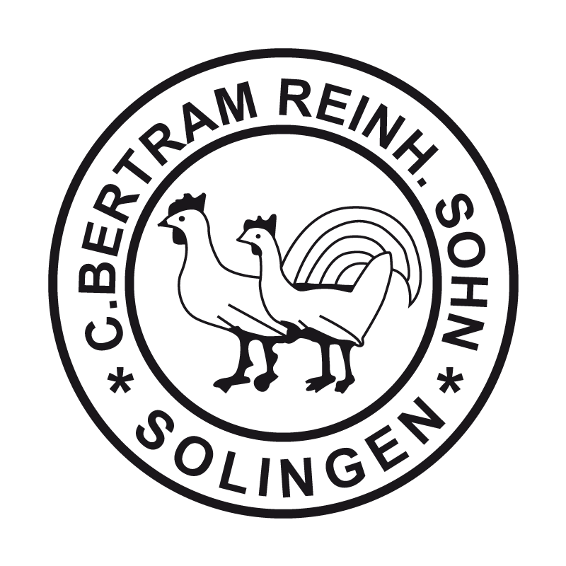 Das Logo von C. Bertram Reinhard & Sohn ist ein kreisförmiges Emblem mit dem Text "C.BERTRAM REINH. SOHNE" entlang der oberen Bogen und "SOLINGEN" entlang der unteren Bogen, flankiert von Sternen. In der Mitte sind eine Henne und ein Hahn dargestellt, die nach rechts schauen. Das Logo ist in dunkelgrauer Farbe auf transparentem Hintergrund gehalten und symbolisiert das „Huhn und Hahn“-Motiv, das 1897 registriert wurde, typischerweise auf Klingen geätzt.