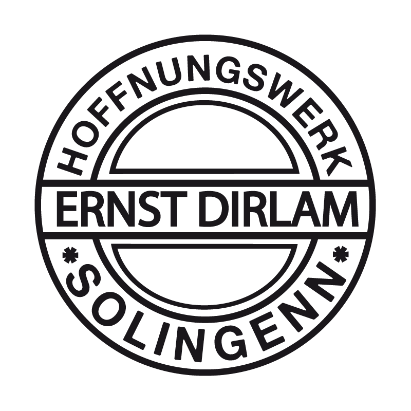 Das Logo von Dirlam Ernst (HOFFNUNGSWERK) besteht aus einem kreisförmigen Emblem mit dem Text "HOFFNUNGSWERK" entlang der oberen Bogen, "ERNST DIRLAM" in der Mitte auf einem horizontalen Band und "SOLINGEN" entlang der unteren Bogen. Das Logo ist in dunkelgrauer Farbe gehalten und symbolisiert Tradition und Qualität, typischerweise auf Klingen geätzt.