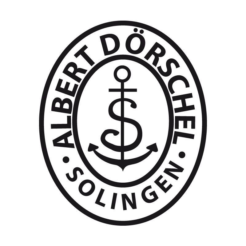 Das Logo von Albert Dörschel zeigt den Schriftzug „Albert Dörschel Solingen“ in einer klaren, serifenbetonten Schrift, oft von einem einfachen Rahmen umgeben. Das Design vermittelt eine klassische Ästhetik und wurde typischerweise auf Klingen geätzt.