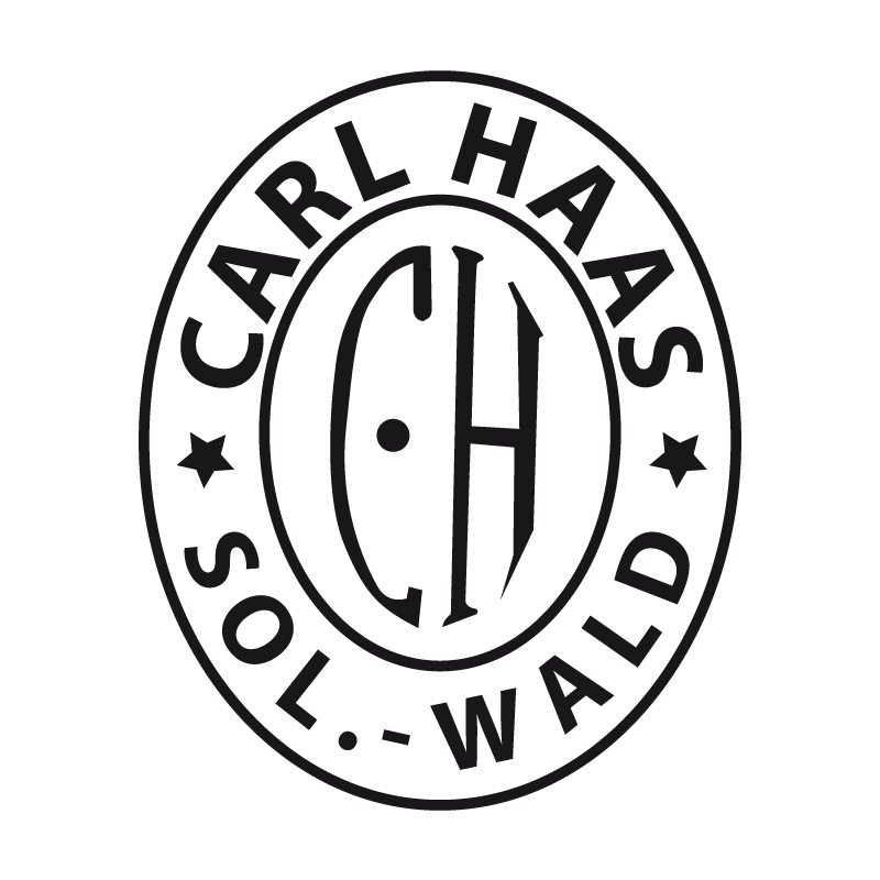 Das Logo von Carl Haas ist ein kreisförmiges Emblem mit dem Text "CARL HAAS" entlang der oberen Bogen und "SOL.-WALD" entlang der unteren Bogen. In der Mitte befindet sich ein Monogramm "CH" mit einem Punkt darunter, flankiert von zwei Sternen. Das Logo ist in dunkelgrauer Farbe auf transparentem Hintergrund gehalten und symbolisiert Tradition und Qualität, typischerweise auf Klingen geätzt.