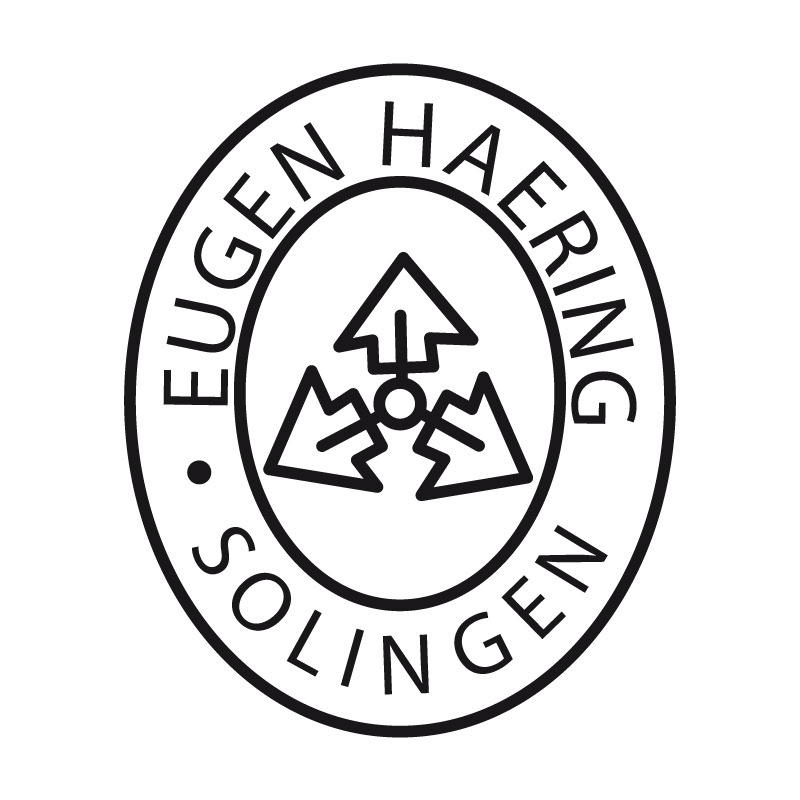 Das Logo von Eugen Haering besteht aus einem kreisförmigen Emblem mit dem Text "EUGEN HAERING" entlang der oberen Bogen und "SOLINGEN" entlang der unteren Bogen. In der Mitte ist ein stilisiertes Symbol (ein Pfeil oder Berg mit Kreuz) dargestellt. Das Logo ist in dunkelgrauer Farbe auf transparentem Hintergrund gehalten und symbolisiert Tradition und Qualität.