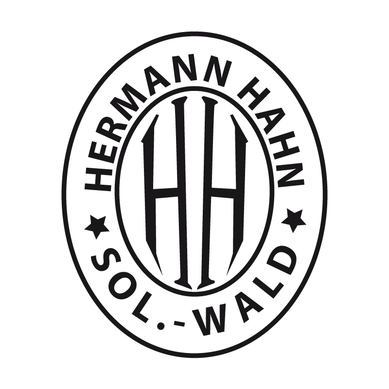 The logo of Hermann Hahn is a circular emblem in dark gray on a transparent background. The text "HERMANN HAHN" is placed along the upper arc, and "SOL.-WALD" along the lower arc. In the center is a stylized monogram "HH", flanked by two stars. This design symbolizes tradition and quality and was typically etched on blades.