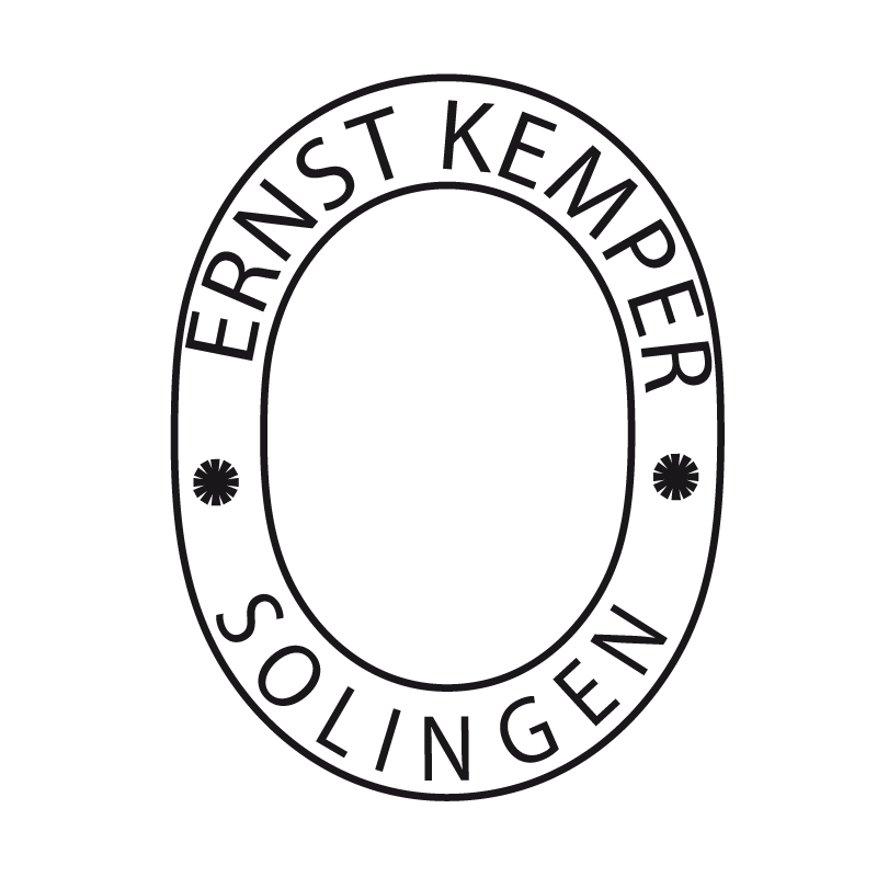 Das Logo von Ernst Kemper zeigt den Maker-Mark „Ernst Kemper / Solingen“ geätzt auf der Klinge, oft in einfacher Schrift. Das Design vermittelt eine klassische Ästhetik und wurde typischerweise auf Klingen angebracht.