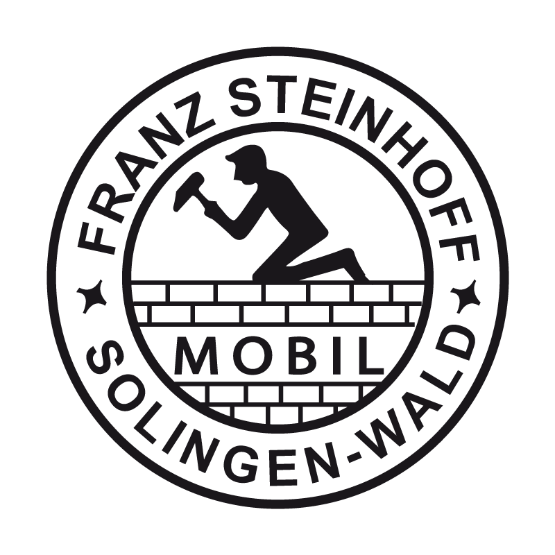 Das Logo von Franz Steinhoff (MOBIL) besteht aus einer kreisförmigen Emblem mit dem Text "FRANZ STEINHOFF" entlang der oberen Bogen und "SOLINGEN-WALD" entlang der unteren Bogen. In der Mitte ist die Silhouette eines knienden Mannes dargestellt, der mit einem Hammer auf eine Mauer schlägt, mit dem Wort "MOBIL" darunter. Sterne flankieren das zentrale Bild auf beiden Seiten. Das Logo ist in dunkelgrauer Farbe gehalten und symbolisiert Handwerk und Mobilität.
