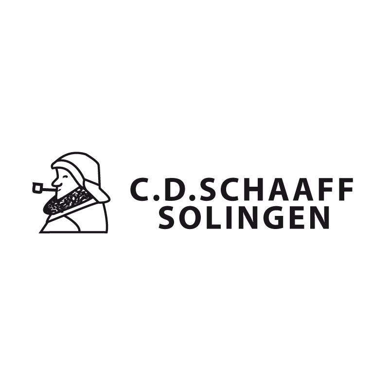 Das Logo von C.D. Schaaff zeigt die Silhouette eines Mannes mit Hut und Pfeife im Mund, der nach links schaut. Darunter steht der Text "C.D.SCHAFF SOLINGEN GEGR.1871" in Großbuchstaben, in dunkelgrauer Farbe auf transparentem Hintergrund. Dieses Markenzeichen symbolisiert die handwerkliche Tradition und Qualität des Herstellers und wurde typischerweise auf Klingen oder Produkten verwendet.