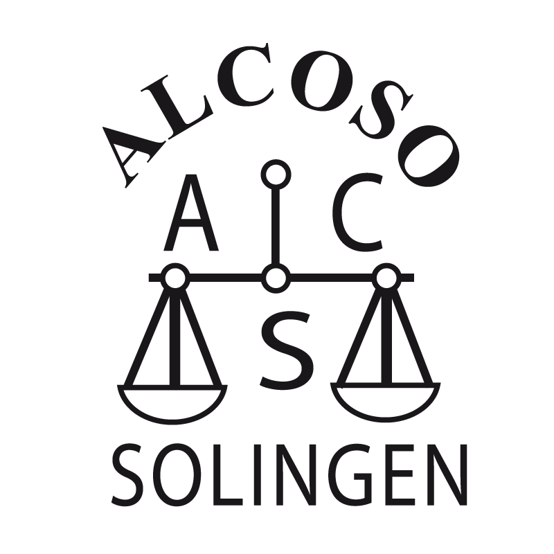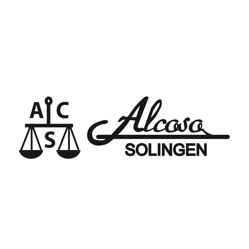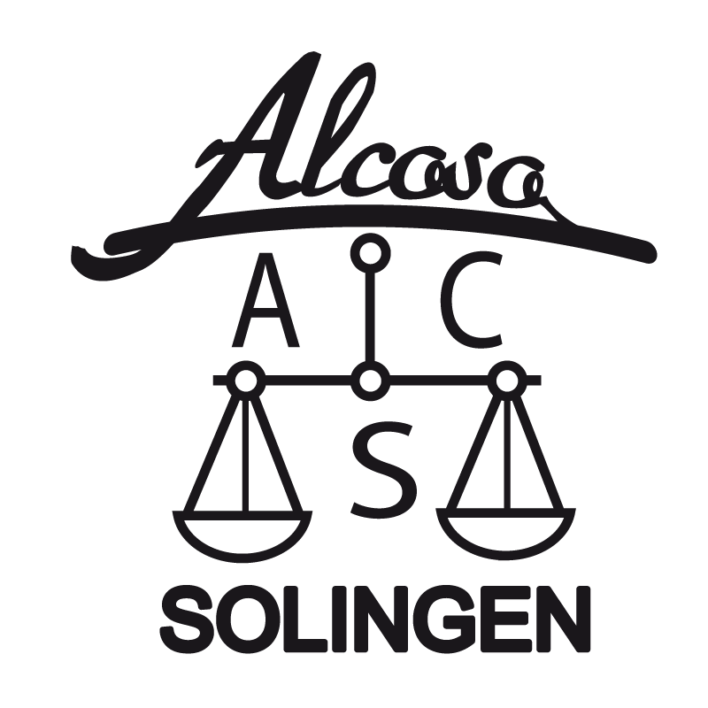 Das Logo von Alexander Coppel (Alcoso) besteht aus dem Text "Alcoso" in kursiver Schrift oben, "A C S" in der Mitte mit einer stilisierten Waage (balance scale) dazwischen, und "SOLINGEN" unten in Großbuchstaben. Das Logo ist in dunkelgrauer Farbe auf transparentem Hintergrund gehalten und symbolisiert Gerechtigkeit und Qualität, typischerweise auf Klingen geätzt.