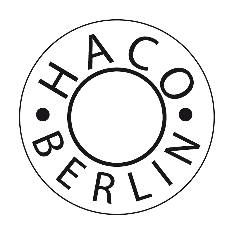 Das Logo von Haco-Werk Berlin zeigt den Schriftzug „HACO Berlin“ in einer klaren, gestreckten Schrift, oft begleitet von einer dünnen umlaufenden Linie, wie auf den Klingen der Dolche abgebildet. Das Design vermittelt eine klassische Ästhetik und wurde typischerweise auf Klingen geätzt.