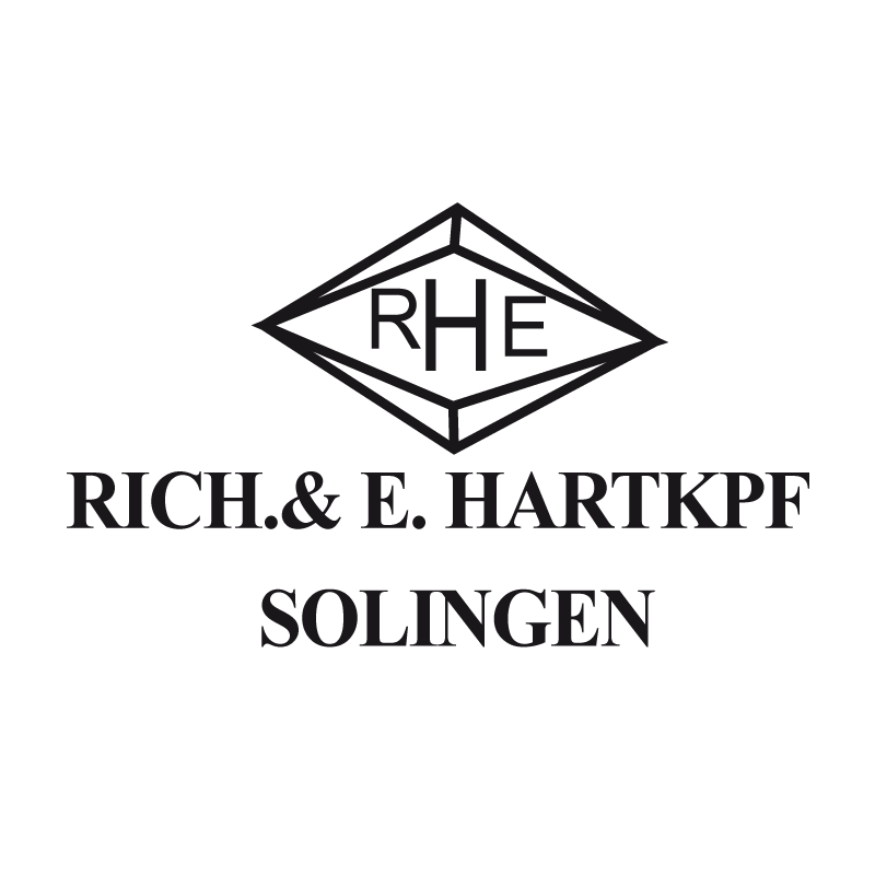 Das Logo von Richard Hartkopf zeigt einen Rhombus mit Initialen RHE, der auf den Klingen der Dolche angebracht wurde und die robuste und scharfe Qualität der Produkte symbolisiert.