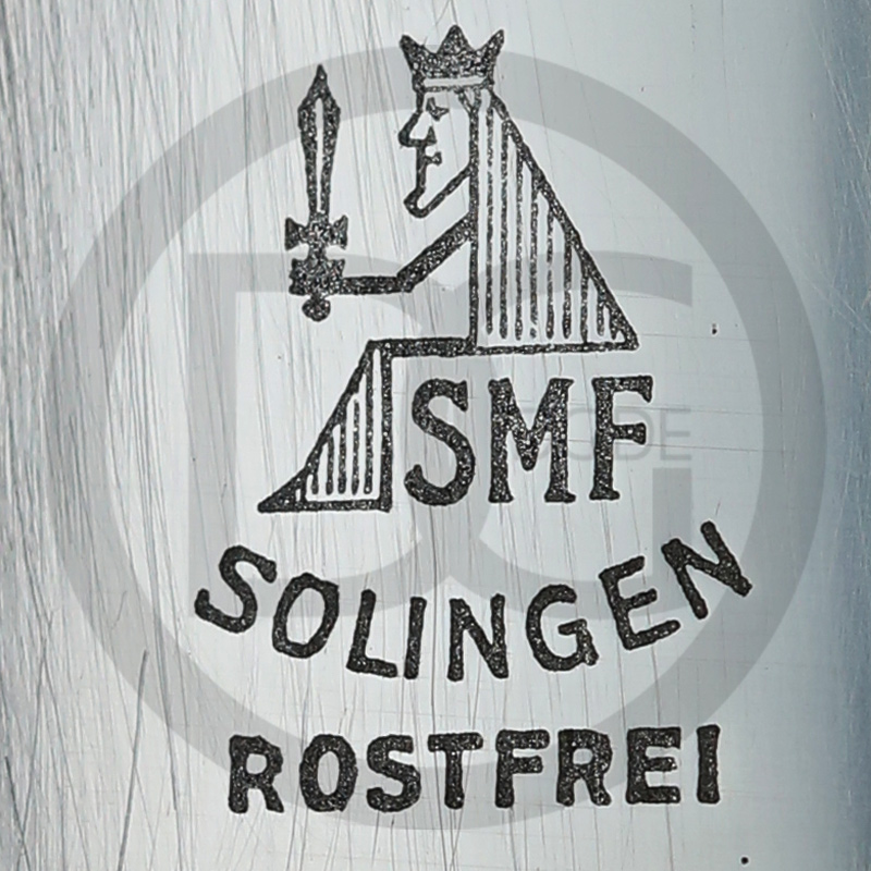 Das Logo von Stöcker & Co. (SMF-Solinger Metallwaffenfabrik) zeigt eine stilisierte Figur eines Königs oder Kriegers mit Schwert und Krone, über dem Text "SMF" in großen Buchstaben. Darunter steht "SOLINGEN" in kursiver Schrift. Das Logo ist in dunkelgrauer Farbe auf transparentem Hintergrund gehalten und symbolisiert Stärke und Tradition, typischerweise auf Klingen geätzt.
