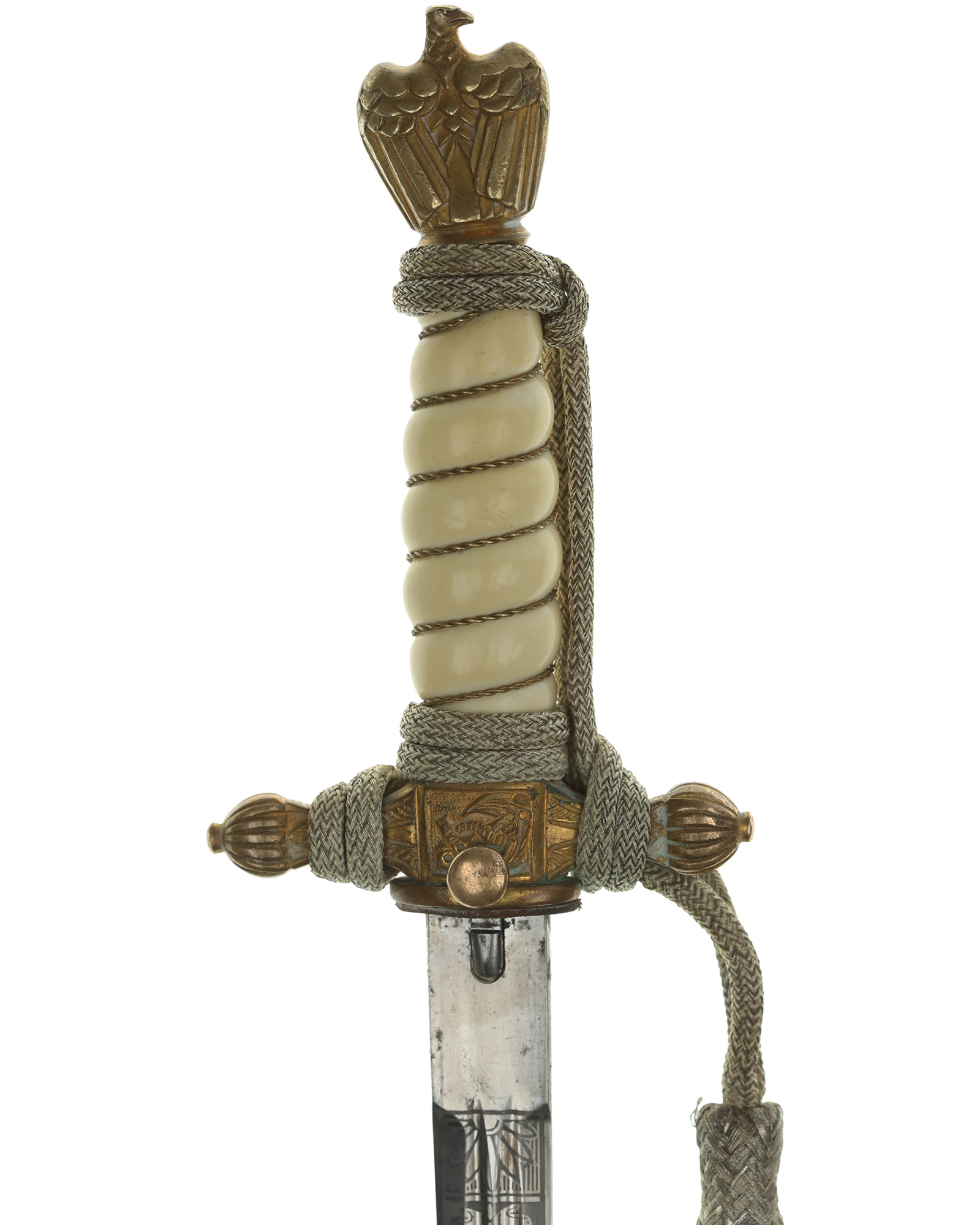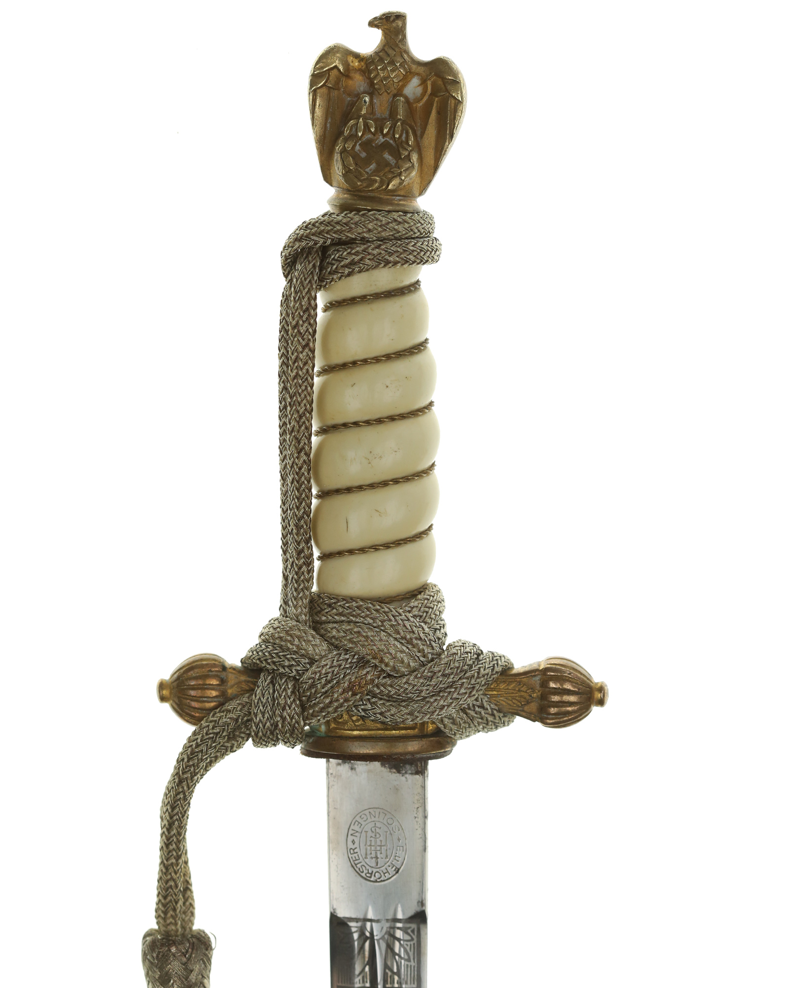 Griff: Heller Griff, verläuft leicht oval. Der Griff besteht aus einem Holzkern und ist mit Zelluloid überzogen. Der Griff ist mit einem Doppeldraht gewickelt. Die Klingenangel ist vermulich leicht gebogen, daher wirkt der Knauf etwas schief. Die Parierstange und der Knauf sind aus Buntmetall gefertigt und vergoldet worden. Unterhalb der Parierstange befindet sich das Stoßleder. Der Druckknopf funktioniert einwandfrei. Der Knauf ist in Form eines Adlers, der mit seinen Krallen das Hakenkreuz in einem Kranz festhält.