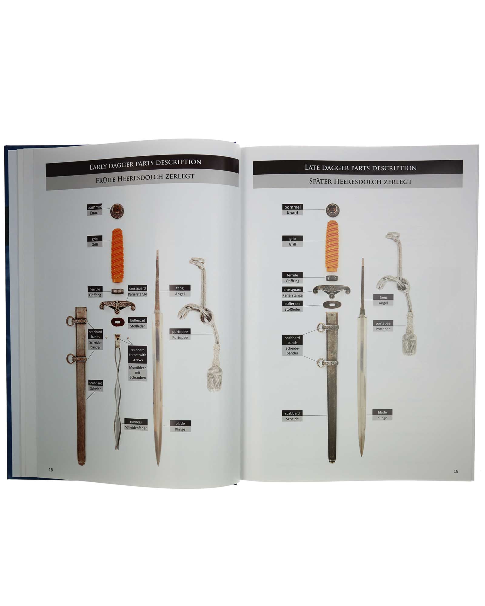 Worauf sollte bei der Beurteilung des Heeres-Offiziersdolches aus der Periode 1935-1945 geachtet werden? Wie erkennt man zeitgenössische und stimmige Teile aus einer Periode? Welche Merkmale hatte ein Heeresdolch eines bestimmten Herstellers, wenn man die Einzelteile dieses Dolches unter die Lupe nimmt? Vergleichen Sie jetzt einfach Ihren Dolch mit der Variante im Buch und stellen Sie fest, ob Ihr Dolch mit den gezeigten Beispielen übereinstimmt.