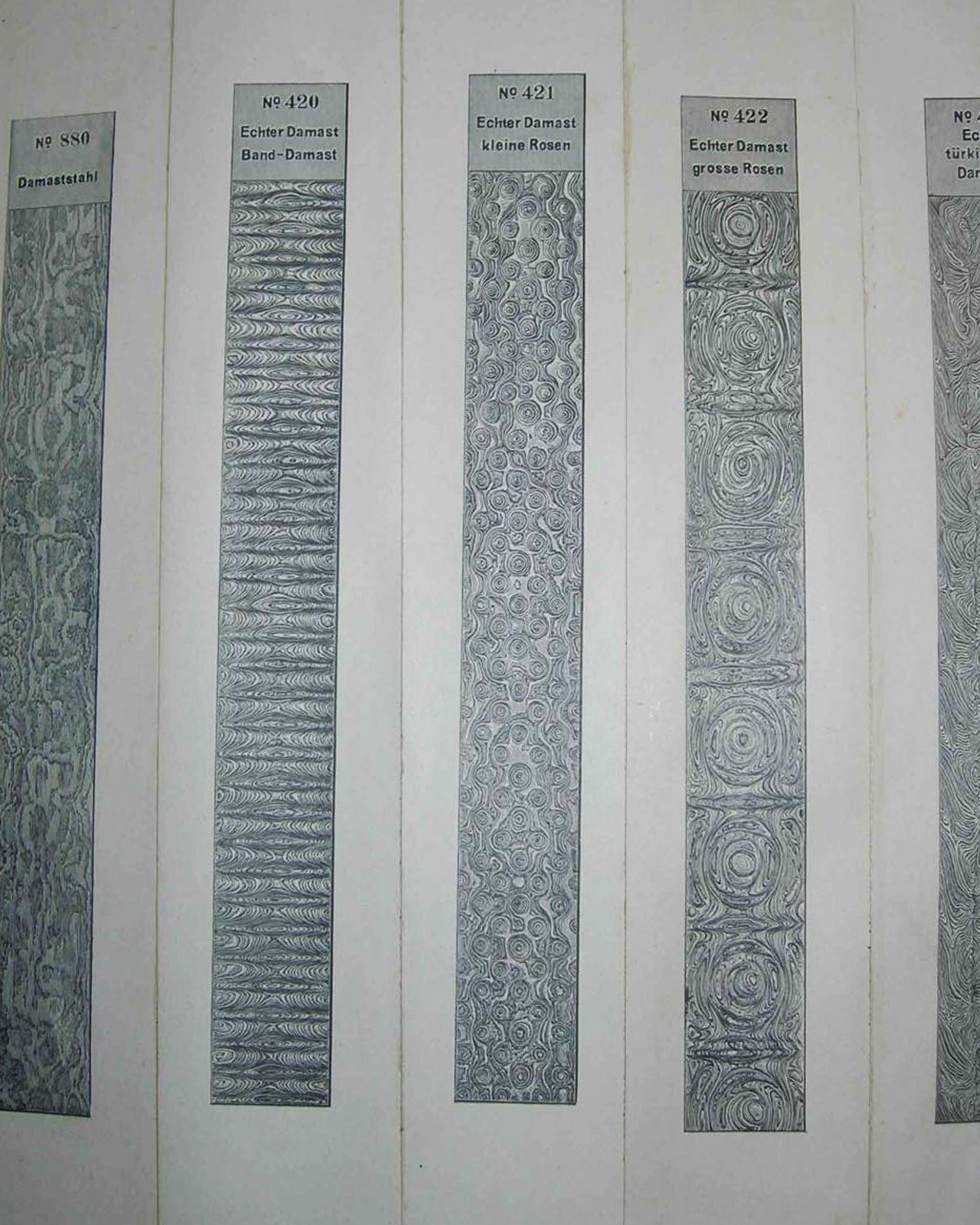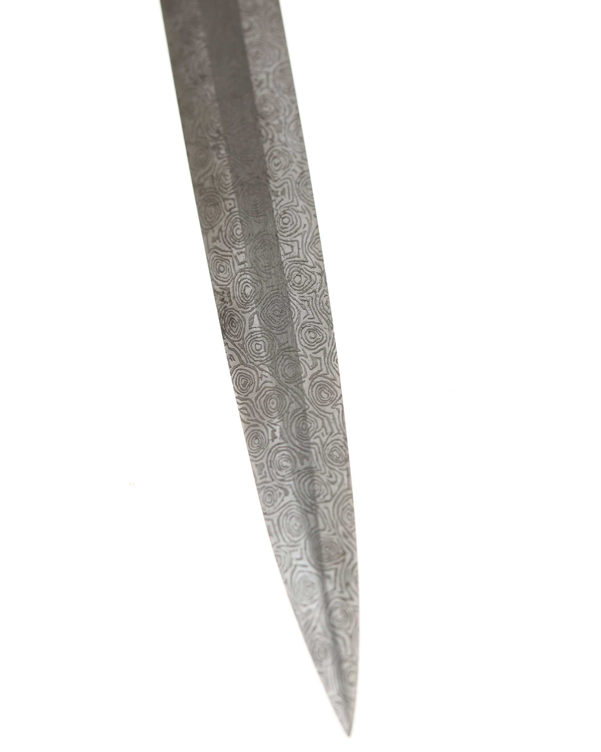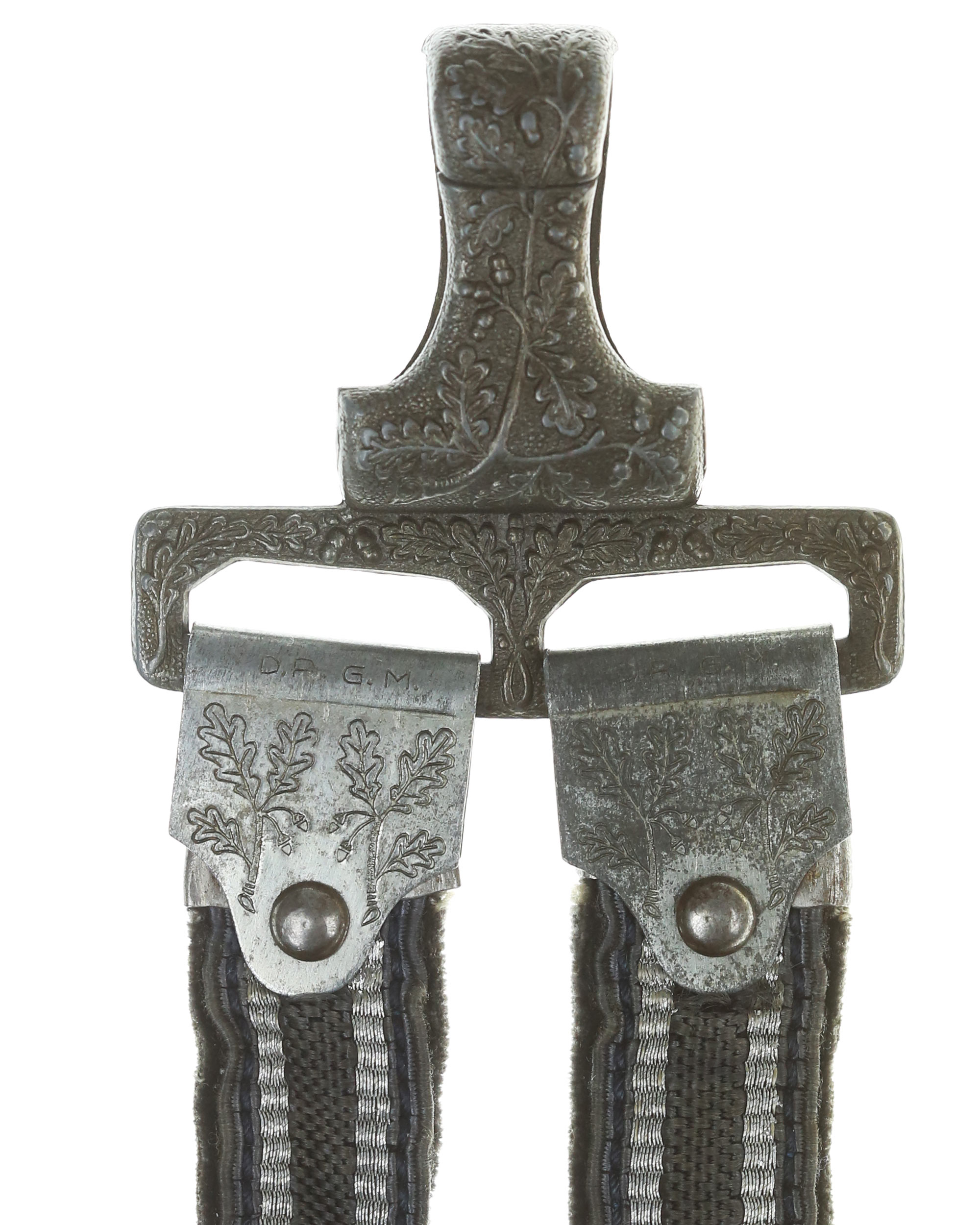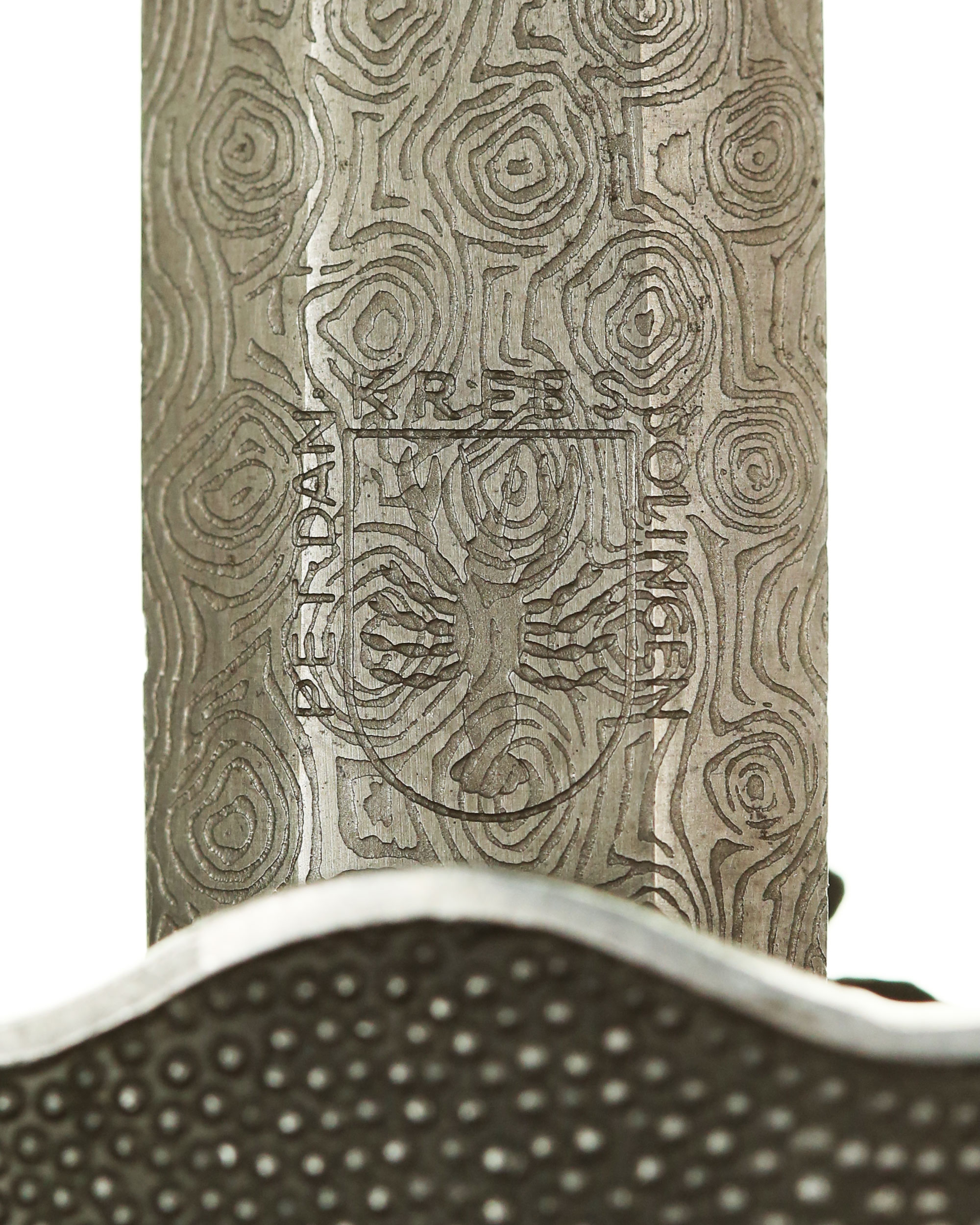 Klinge: Die Klinge ist sehr sauber und aus Damaststahl, die Spitze ist zu 100% erhalten. Auf der Rückseite der Klinge befindet sich die Herstellerbezeichnung: Pat. Dan. Krebs in Solingen. Zwischen den Schultern der Klinge und der unteren Parierstange befindet sich das originale Stoßleder.