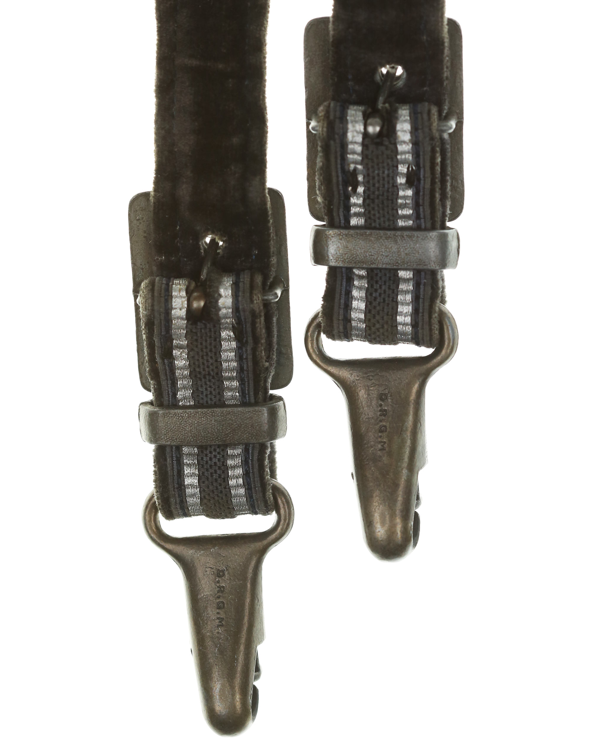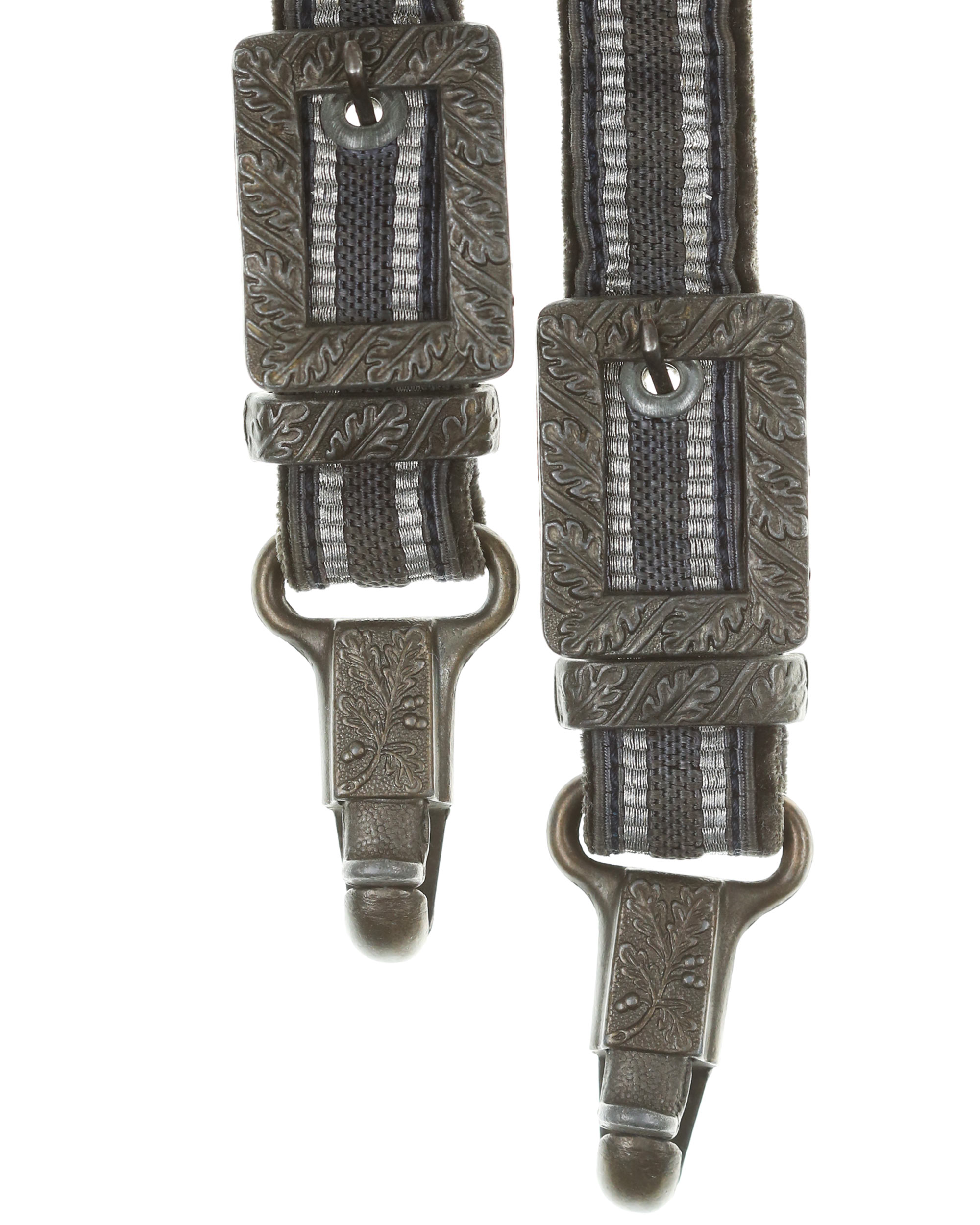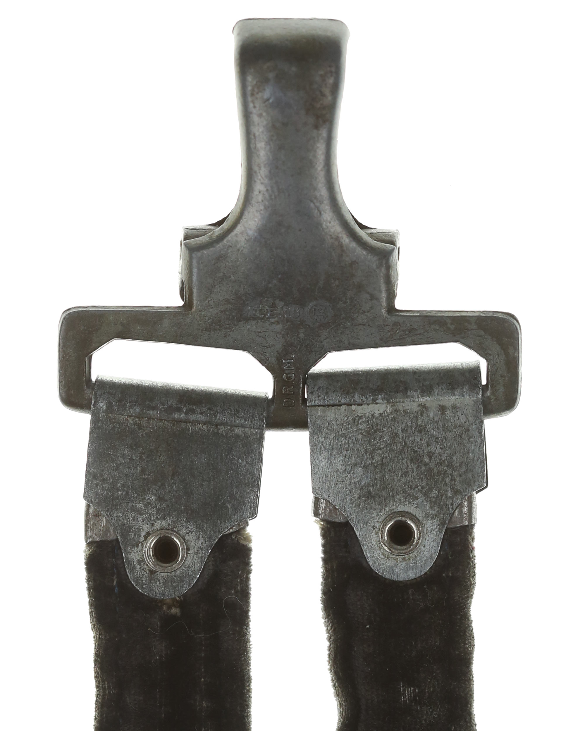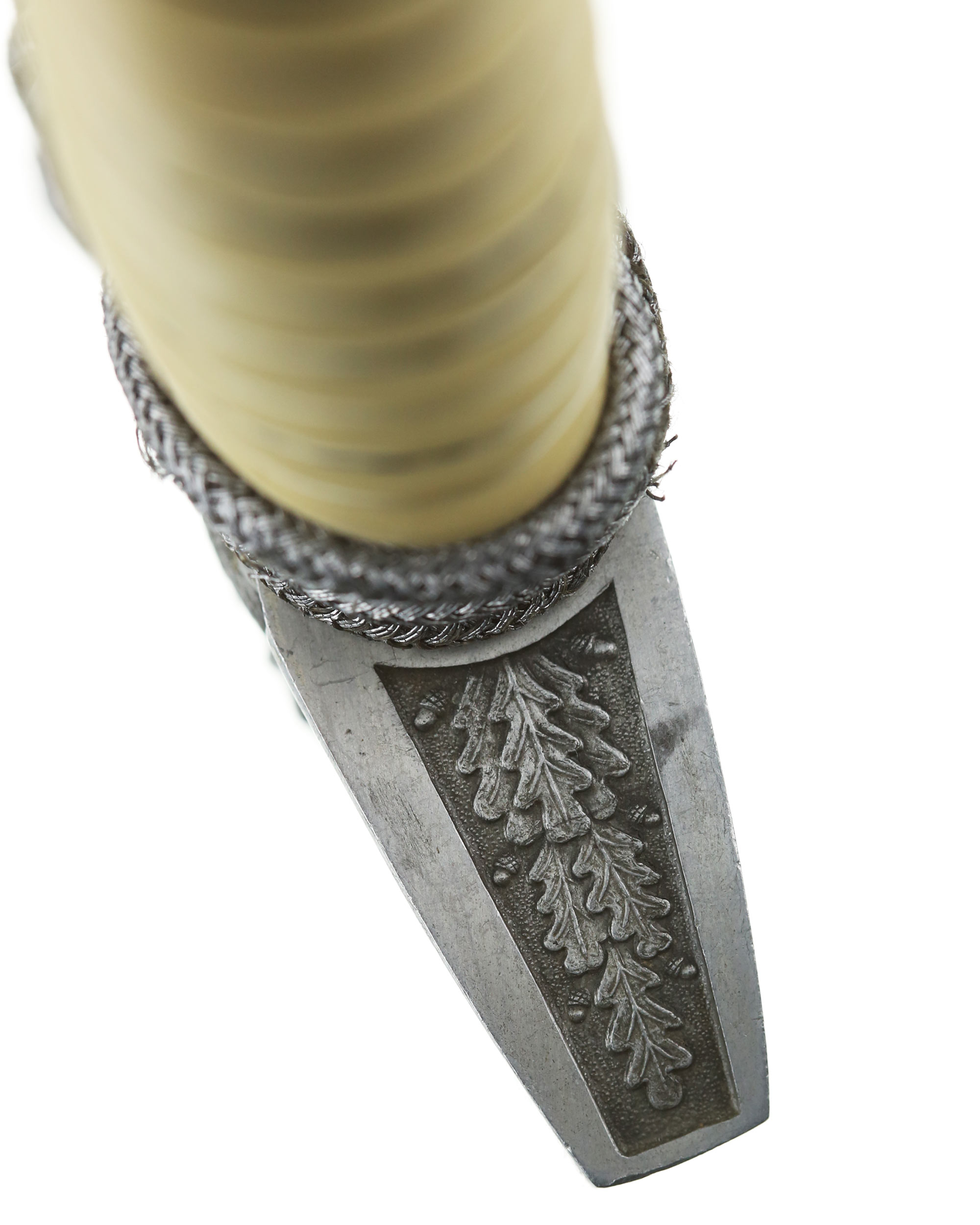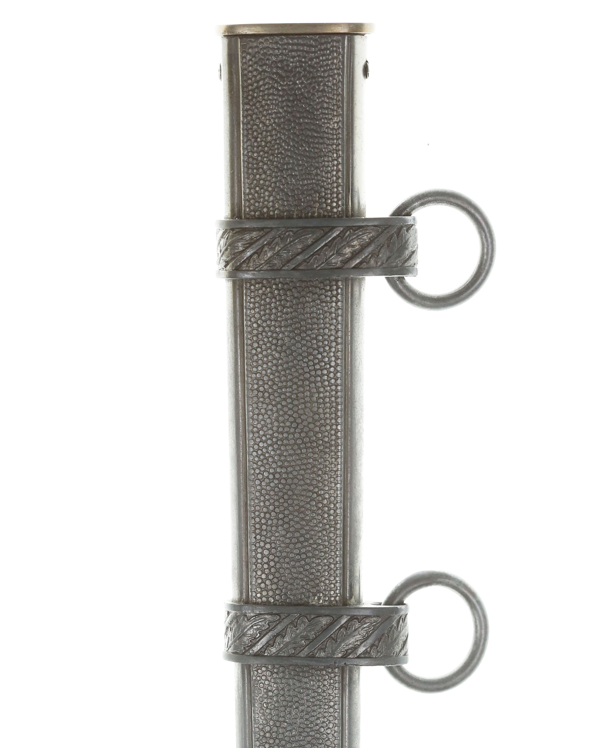 Scheide: Die Scheide besteht aus Mundblech und aus zwei eichenlaubverzierten Scheidenbändern mit zwei losen Trageringen, diese sind komplett geschlossen. Die Scheide ist aus einem Stück Stahlblech gezogen und auf der Vorder- und Rückseite mit körniger Oberflächenstruktur versehen. Die Spitze ist abgerundet und unbeschädigt. Das Mundstück ist separat eingesetzt, an den beiden Seiten befindet sich die Schräubchen.